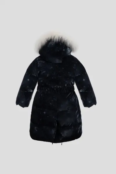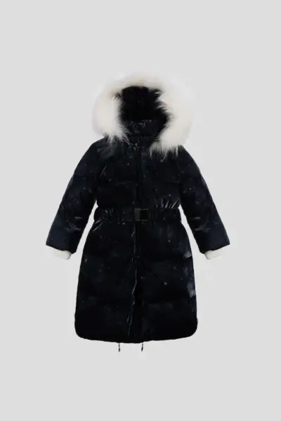 Объемный капюшон регулируется с помощью кулиски. В качестве дополнения к модели идет теплая и красивая белая манишка.