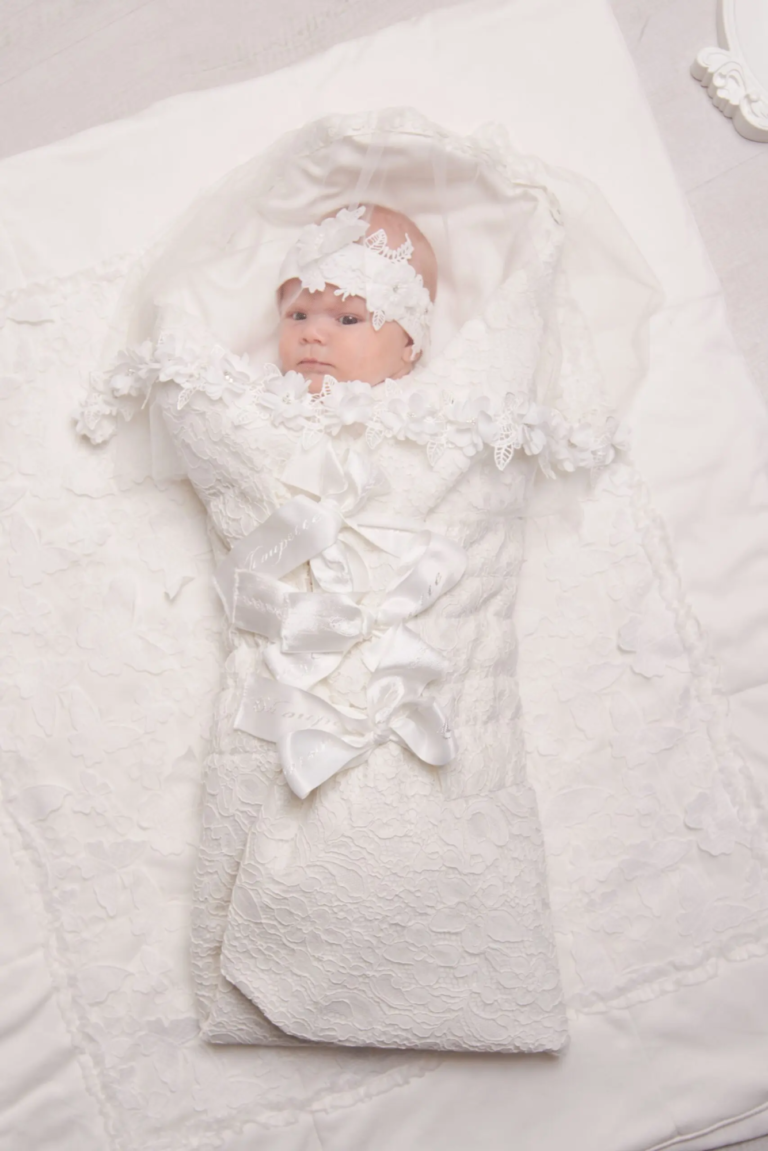 Великолепный кружевной конверт-плед цвета экрю – отличное решение для торжественной и запоминающейся выписки вашего малыша. Практичность данной модели состоит в том, что в дальнейшем она может ... быть использована для прогулок в коляске,а также этим пледом можно укрыть малыша в кроватке. Выполненный из натуральных материалов детский конверт-плед Choupette отлично сохраняет тепло за счет современного наполнителя – младенец в нем будет чувствовать себя необыкновенно комфортно. Изысканный декор кружевом, текстильными цветами со стразами, атласными лентами делает этот чудесный конверт-плед очень нарядным и красивым.