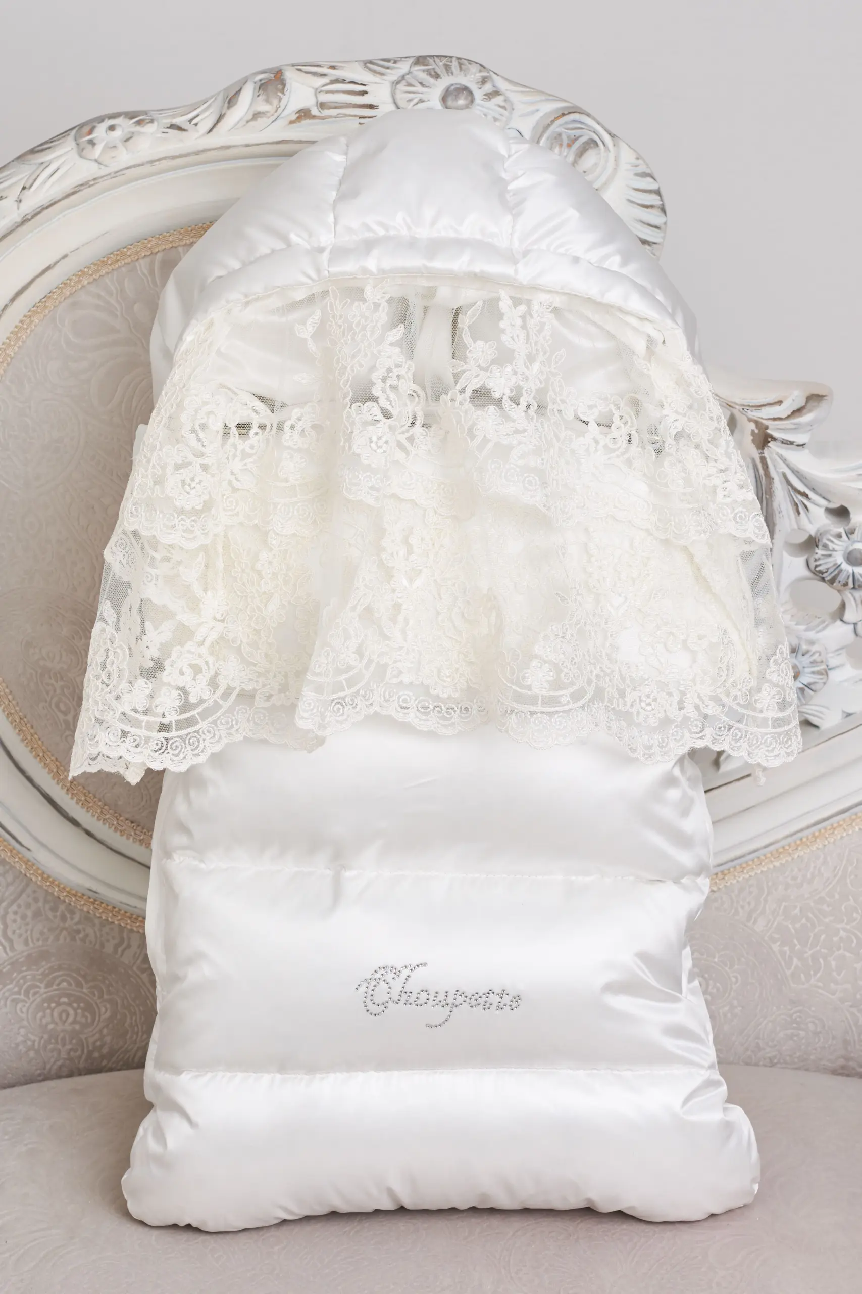 Конверт на выписку имеет удобную застежку-молнию по бокам, благодаря которой вам будет удобно укутывать ребенка. Съемная вуаль на конверте легко отстегивается, кулисы на передней части капюшона затягиваются. Внутри конверта есть регулируемые клапаны для фиксации - подобная конструкция позволяет максимально защитить вашего малыша от ветра и холода, что так важно в период осень-зима! В зимнем конверте на выписку для новорожденного используется гусиный пух, собранный в экологически чистых районах Сибири и бережно обработанный на лучшем немецком оборудовании. Учитывая российские погодные условия, конверт на выписку из роддома отличается высокой плотностью набивки, что позволяет использовать данную модель не только на выписку, но и для прогулок в коляске.
