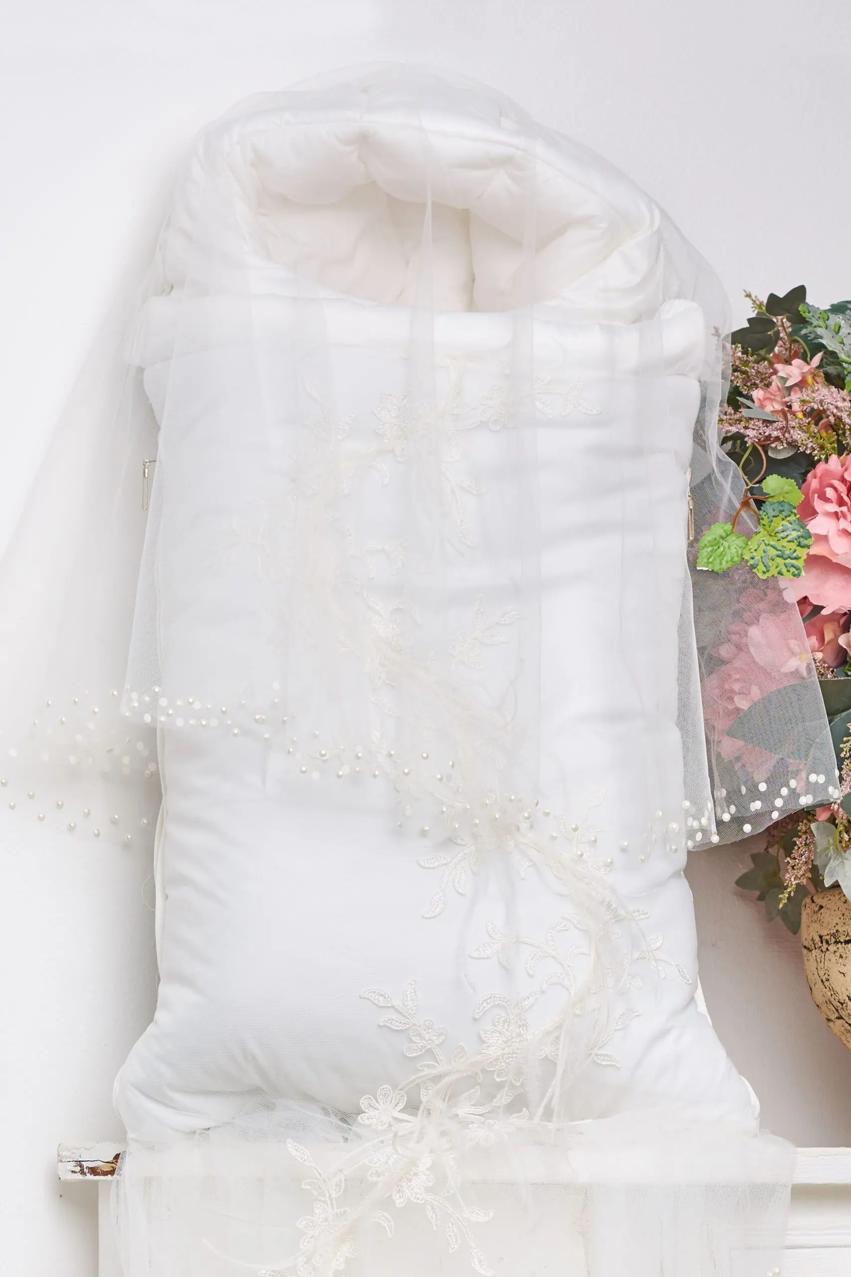 Красивый конверт на выписку с тончайшей длинной вуалью, которую легко можно отстегнуть, если вы собрались прогуляться с коляской. Нижняя часть вуали, словно капельками, украшена жемчугом. Конверт ... и длинный полупрозрачный шлейф украшены вышивкой ручной работы, по которой местами стелются тонкие страусиные перышки. Застегивается этот красивый конверт для выписки на "молнии", защищая вашу кроху от любой непогоды. Подкладка из натурального хлопка обеспечит комфорт малышу, а внешний слой, сочетающий в себе волокна хлопка и шелка, порадует своей нежностью маму.