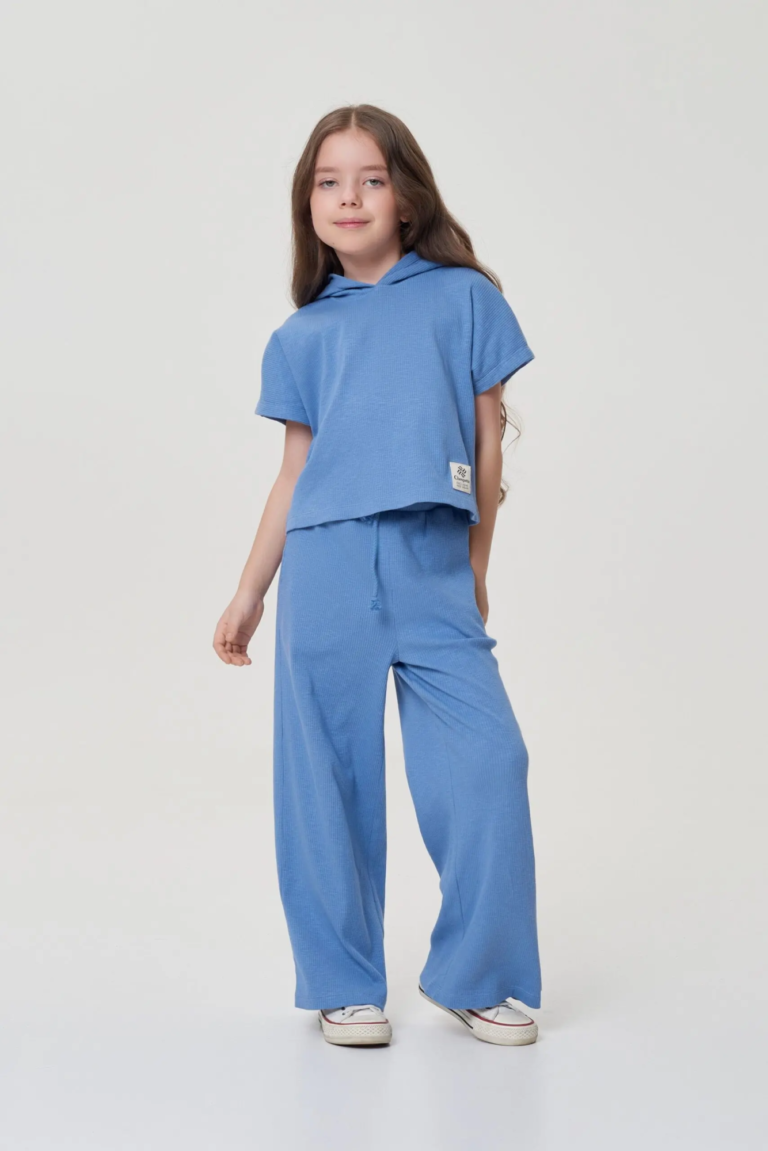 Он состоит из модной укороченной футболки с капюшоном и стильных брюк-труб, которые имеют пояс на кулиске.