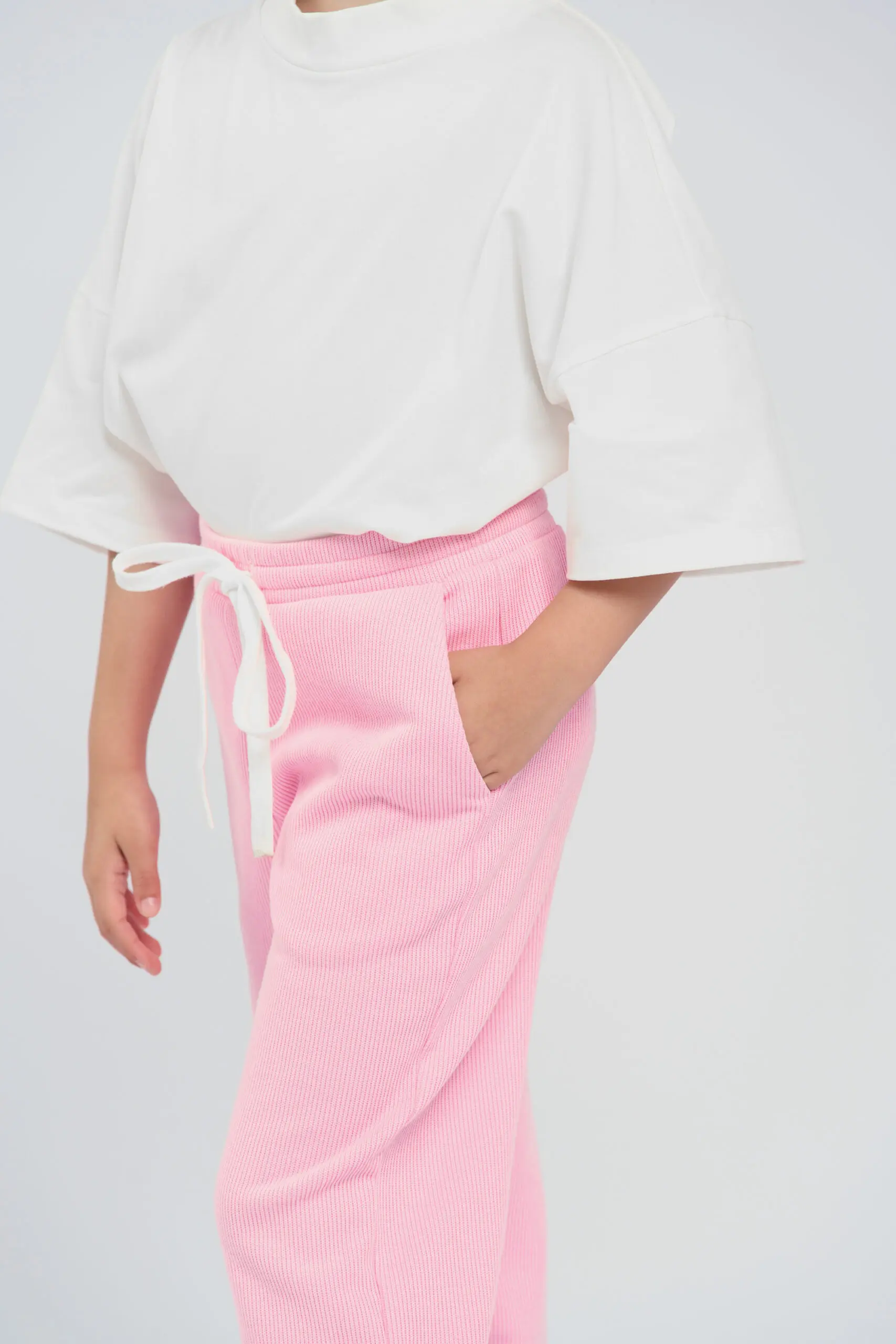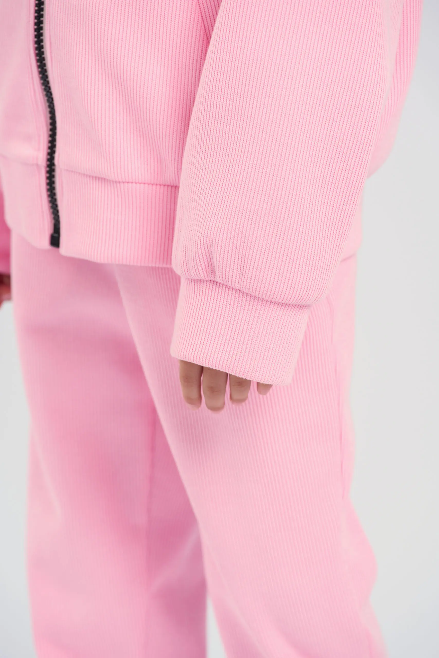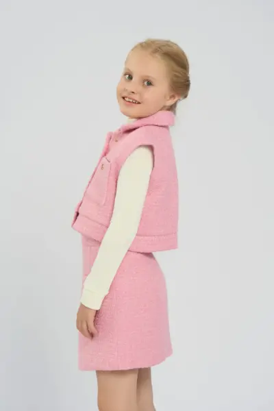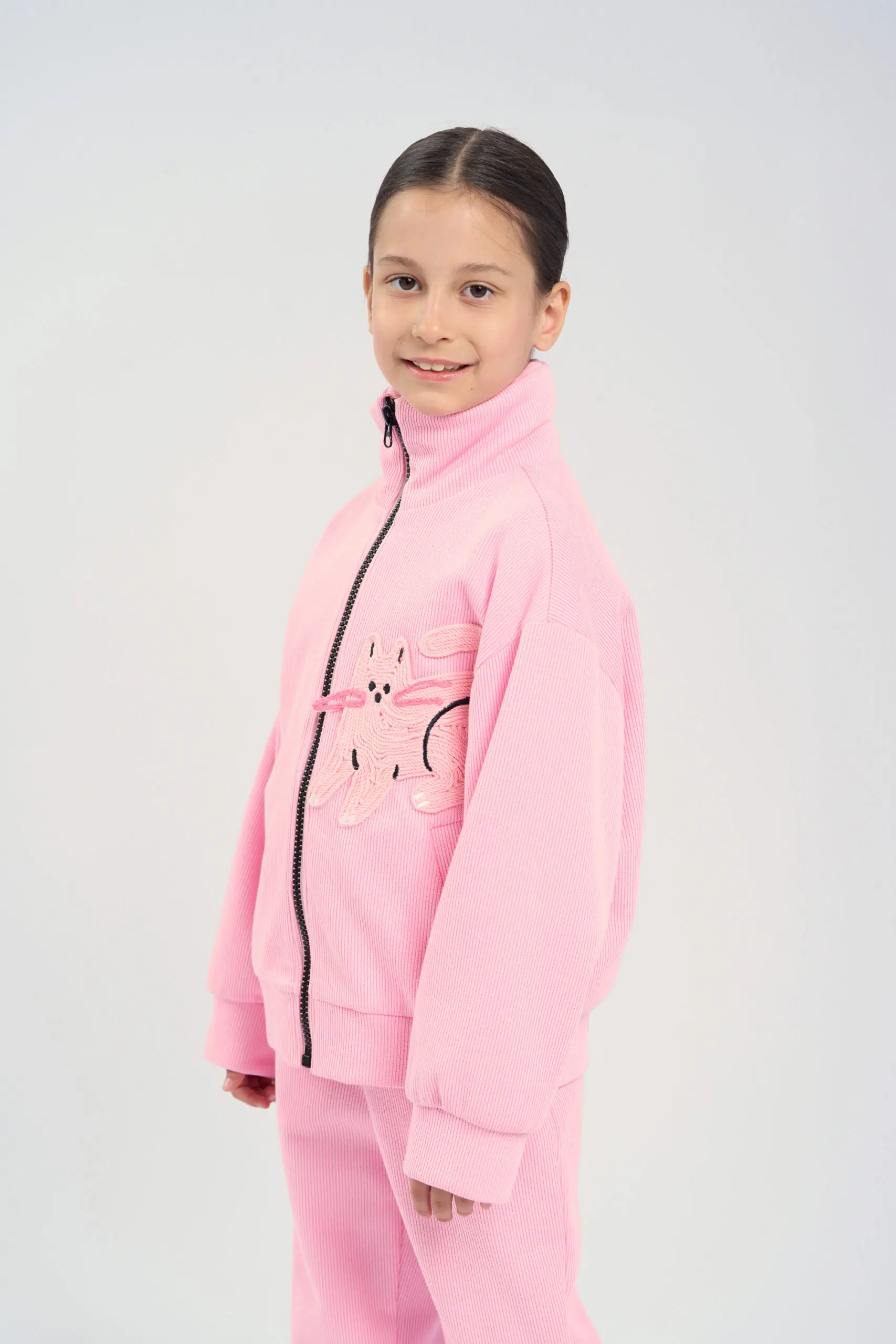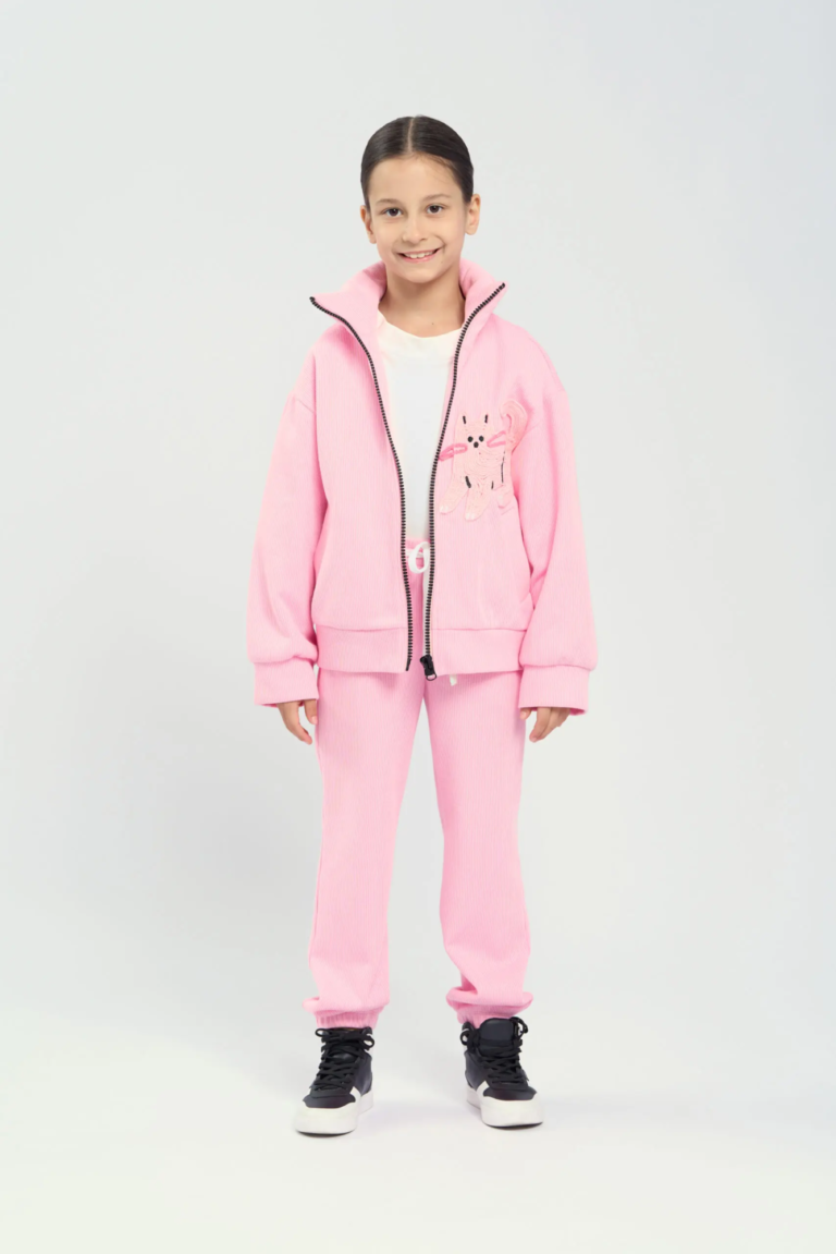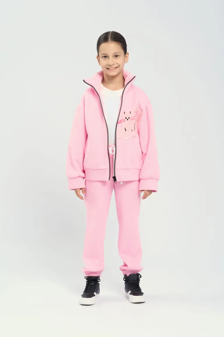 Спортивный костюм из вязанного футера для девочки – это идеальный выбор для активного отдыха и повседневной носки. Толстовка в стиле оверсайз обеспечит свободу движений, а удобная ... застежка на молнию по всей длине облегчает процесс переодевания. Высокий ворот горловины, также широкие манжеты на рукавах не только придают стильный вид, но и защищают от прохладного ветра, создавая комфортное ощущение в любую погоду. Дизайнерская вязаная аппликация добавляет элемент уникальности и выражает креативный подход в дизайне. Такой акцент делает костюм не только функциональным, но и модным, позволяя девочкам выделяться среди сверстниц. Брюки свободного кроя с эластичной резинкой на поясе обеспечивают максимальный комфорт, позволяя заниматься спортом или просто гулять на свежем воздухе. Завязки на поясе обеспечивают надежную фиксацию.