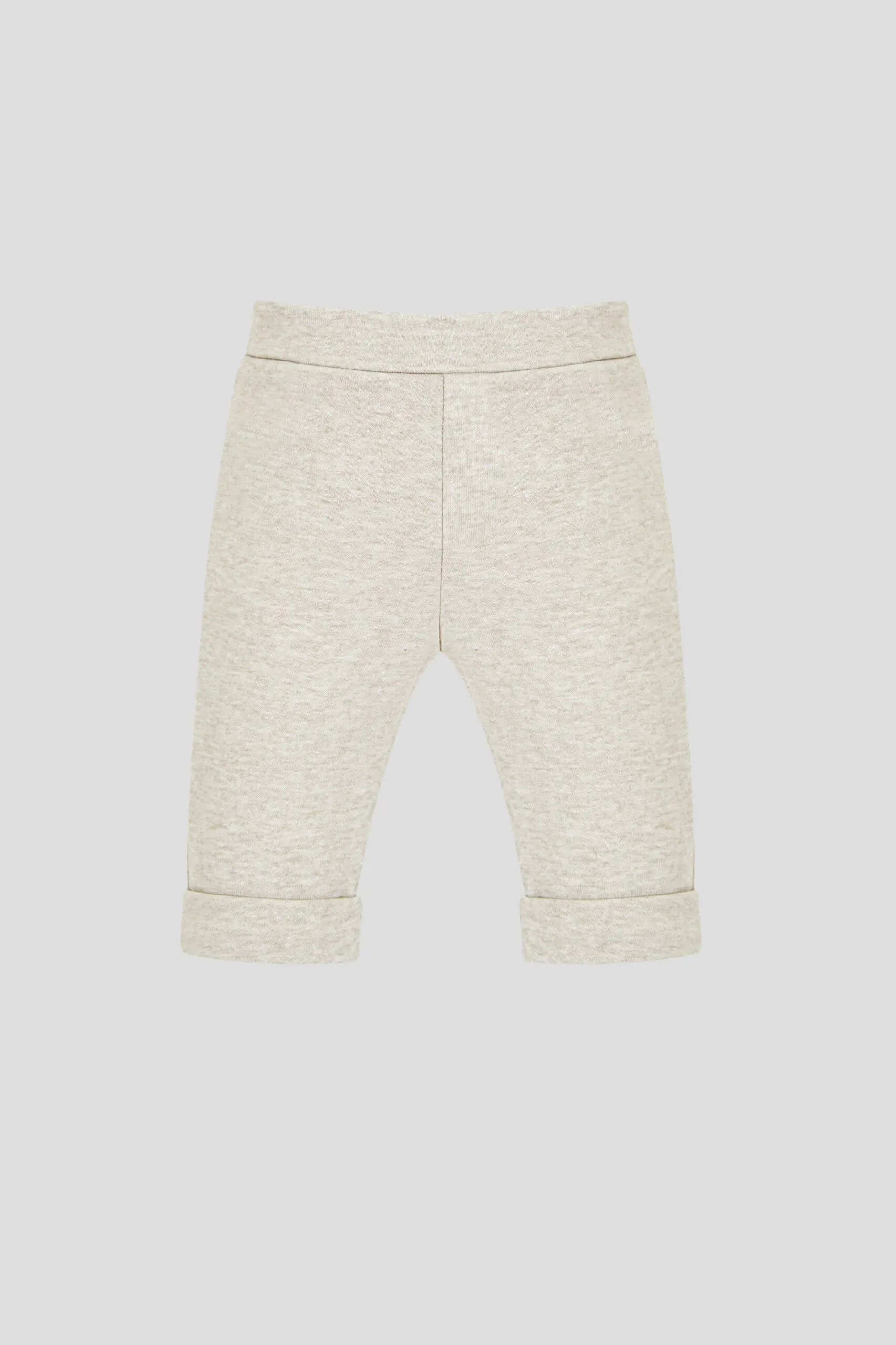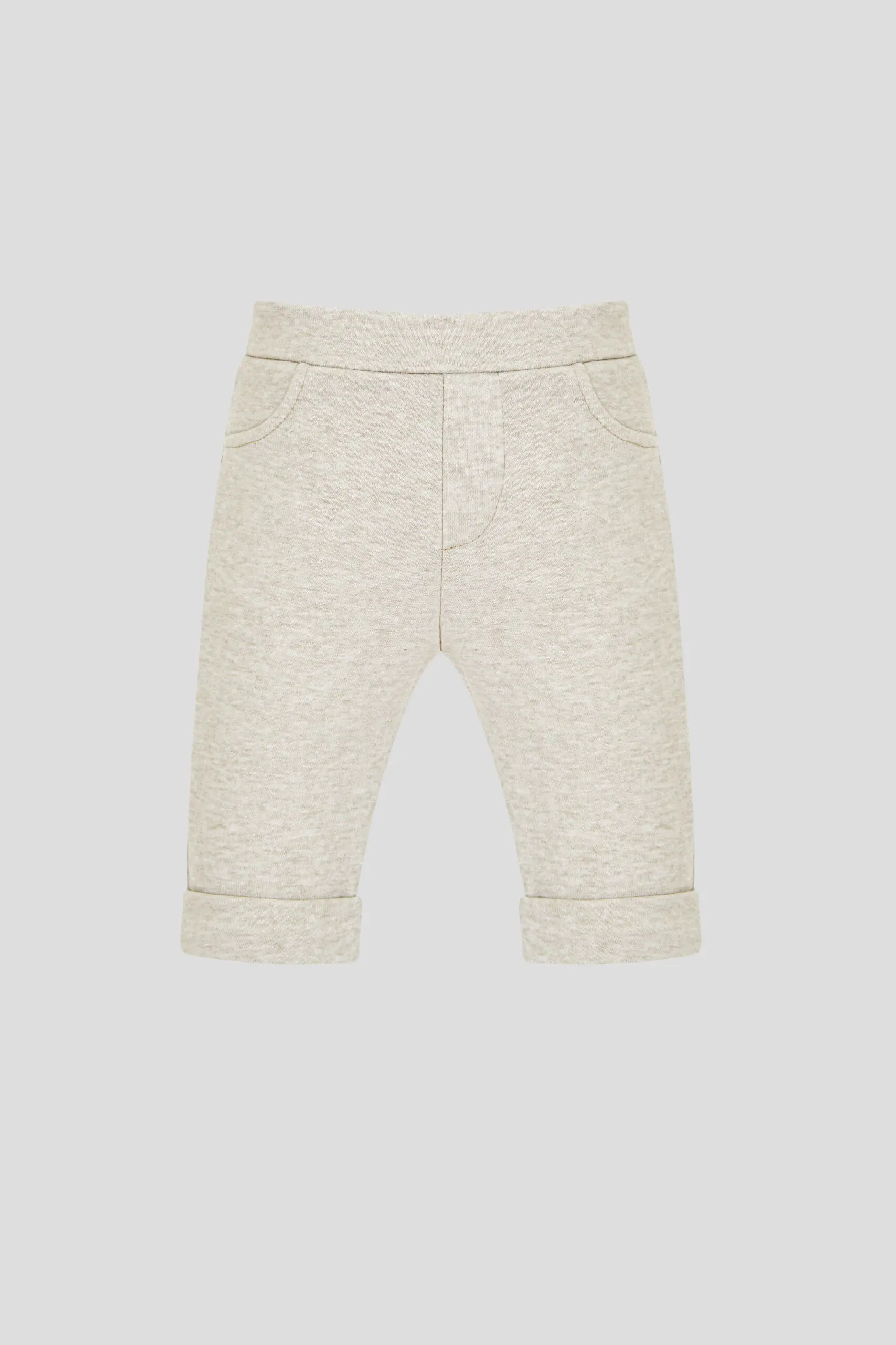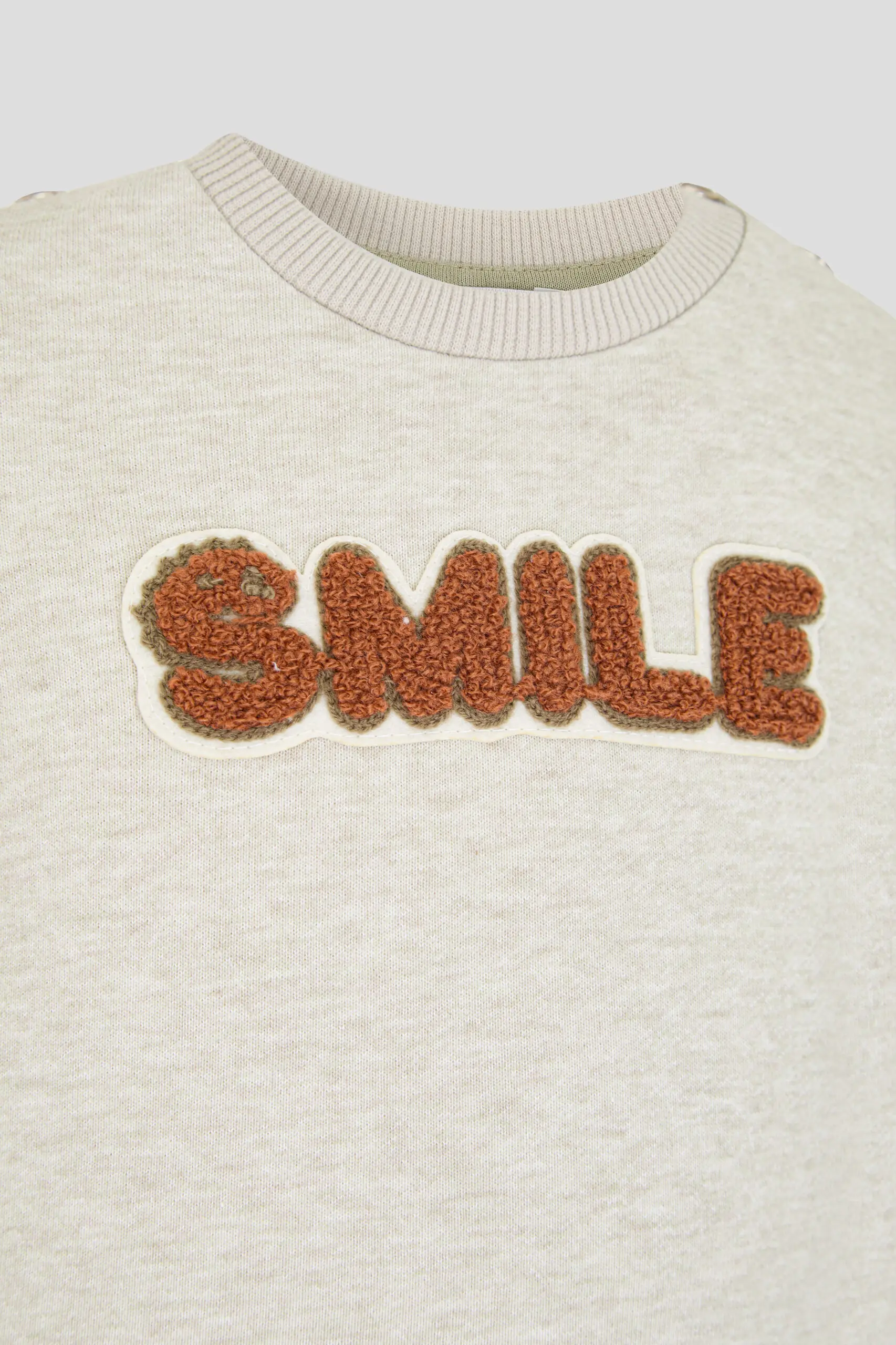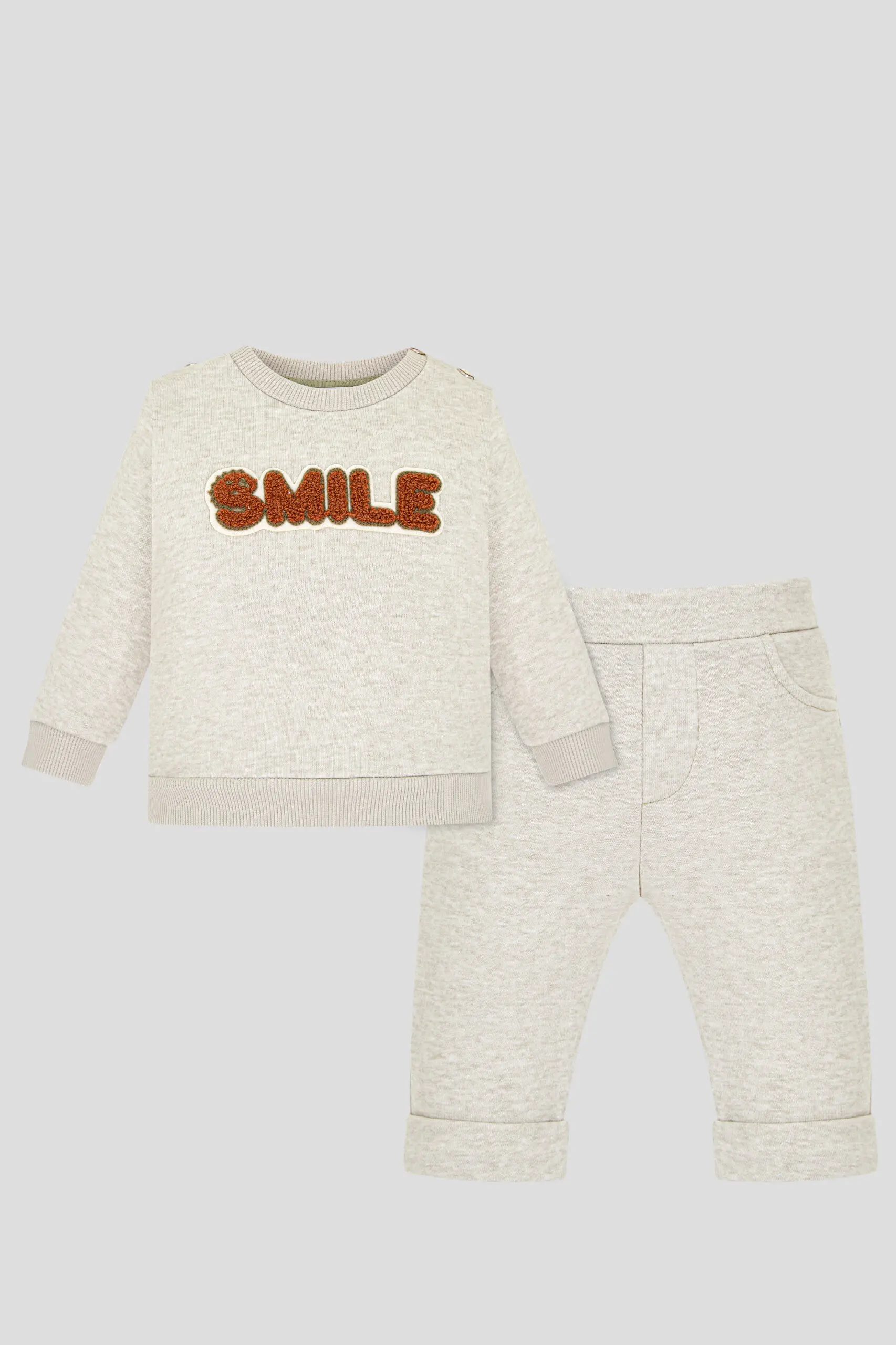 Трикотажный костюм для мальчика состоит из свитшота и брюк. На груди свитшота расположен текстовый декор. Этот элемент добавляет индивидуальности и делает образ более выразительным.