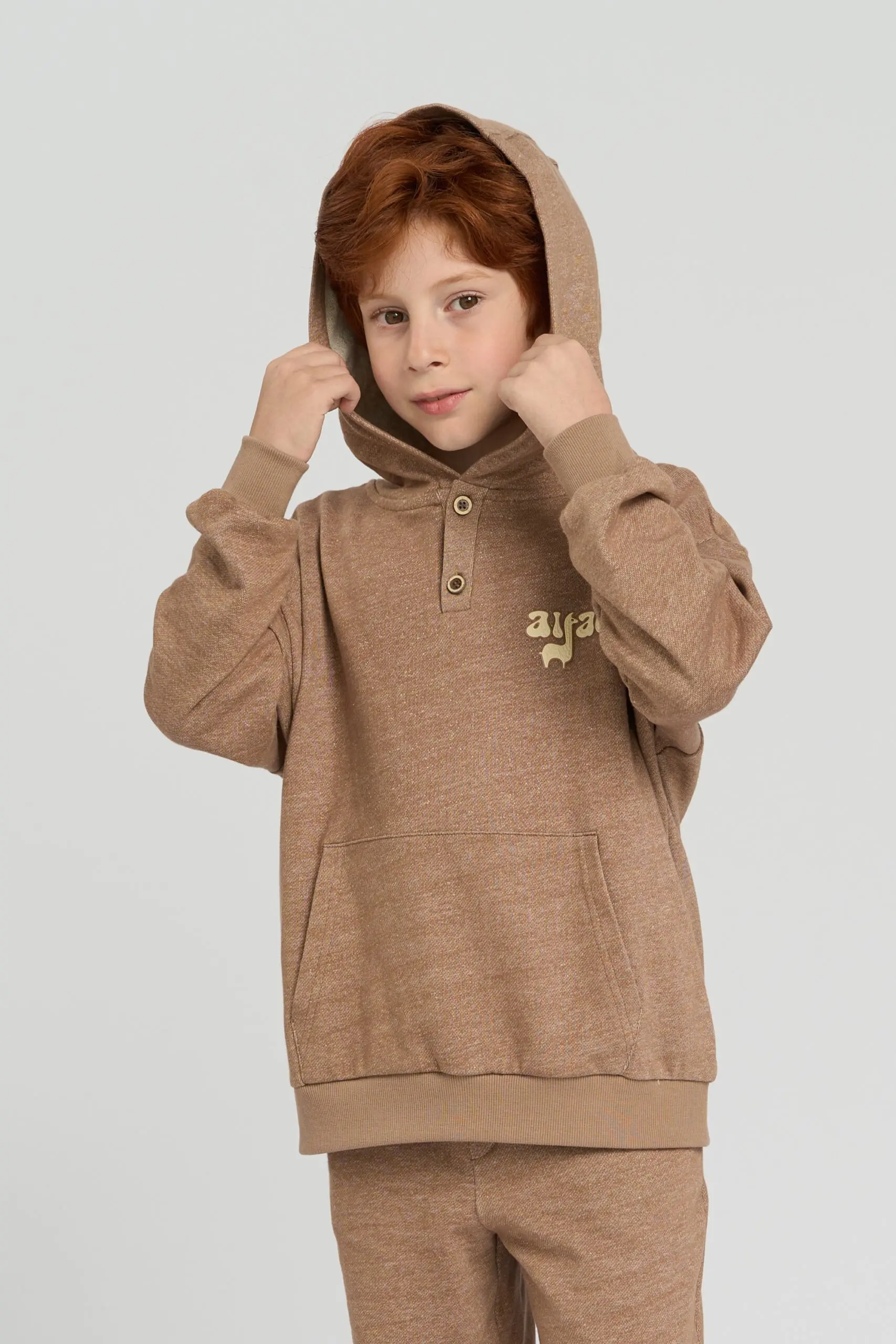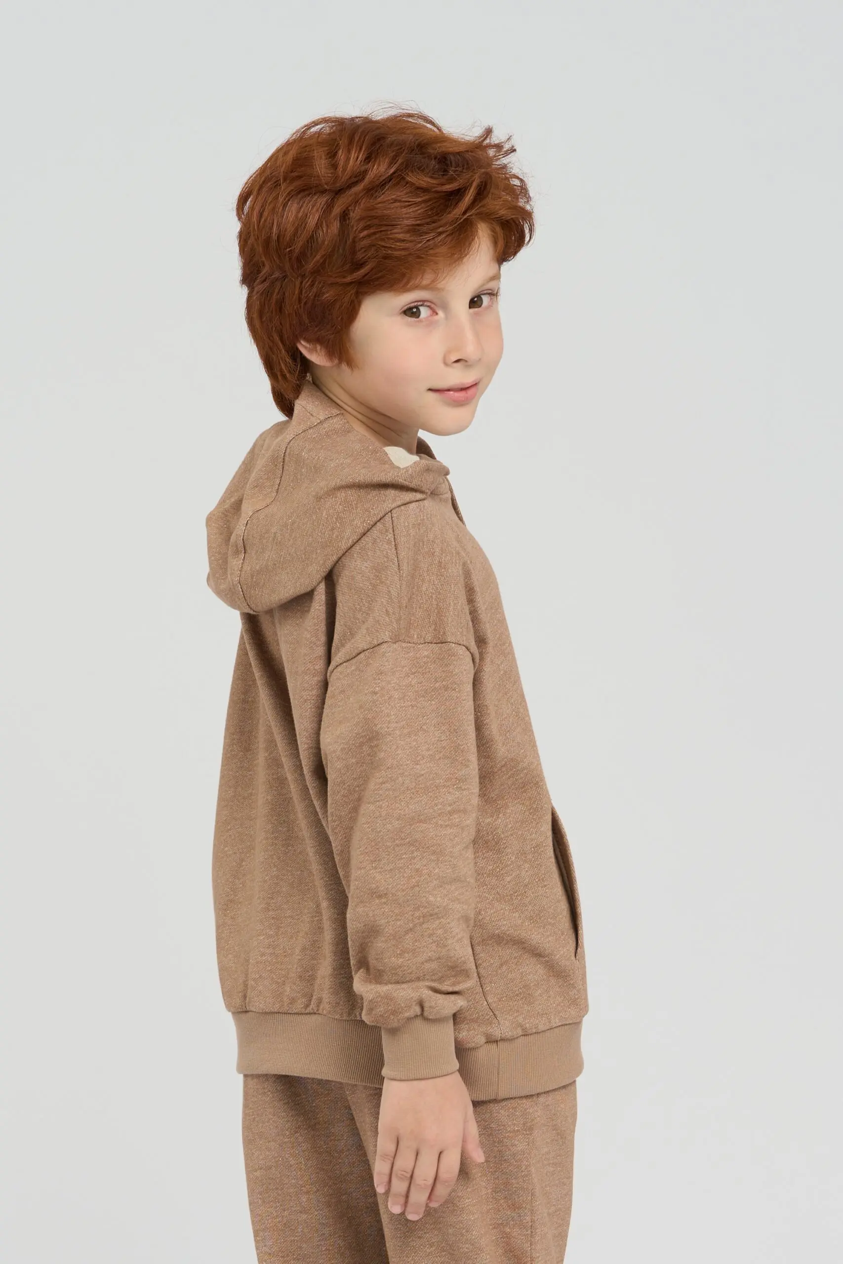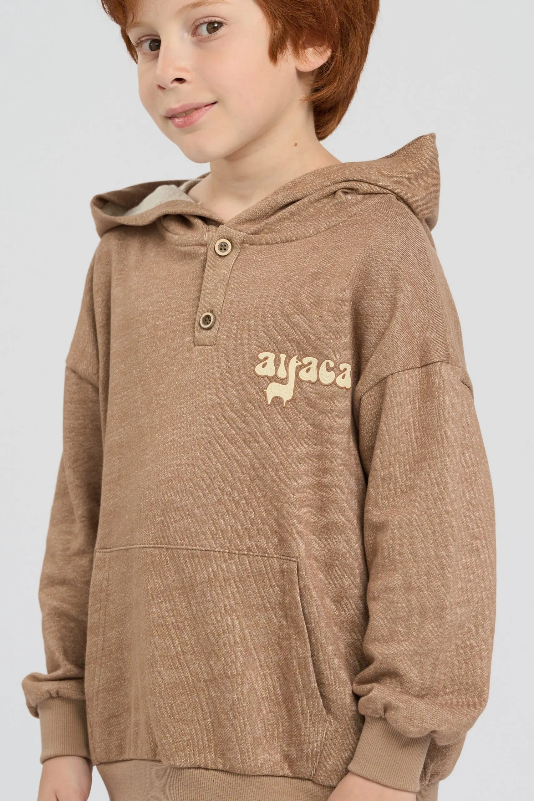 Спортивный костюм для мальчика, состоящий из худи и брюк, идеально подходит для активных детей и повседневной носки. Худи с глубоким капюшоном и застежкой на две пуговицы ... под горловиной. Карман кенгуру добавляет худи функциональности. На груди декоративный элемент с изображением альпаки. Брюки комфортного свободного силуэта, по бокам прорезные карманы. Ткань на основе натурального хлопка хорошо пропускает воздух, что особенно важно для активных детей.