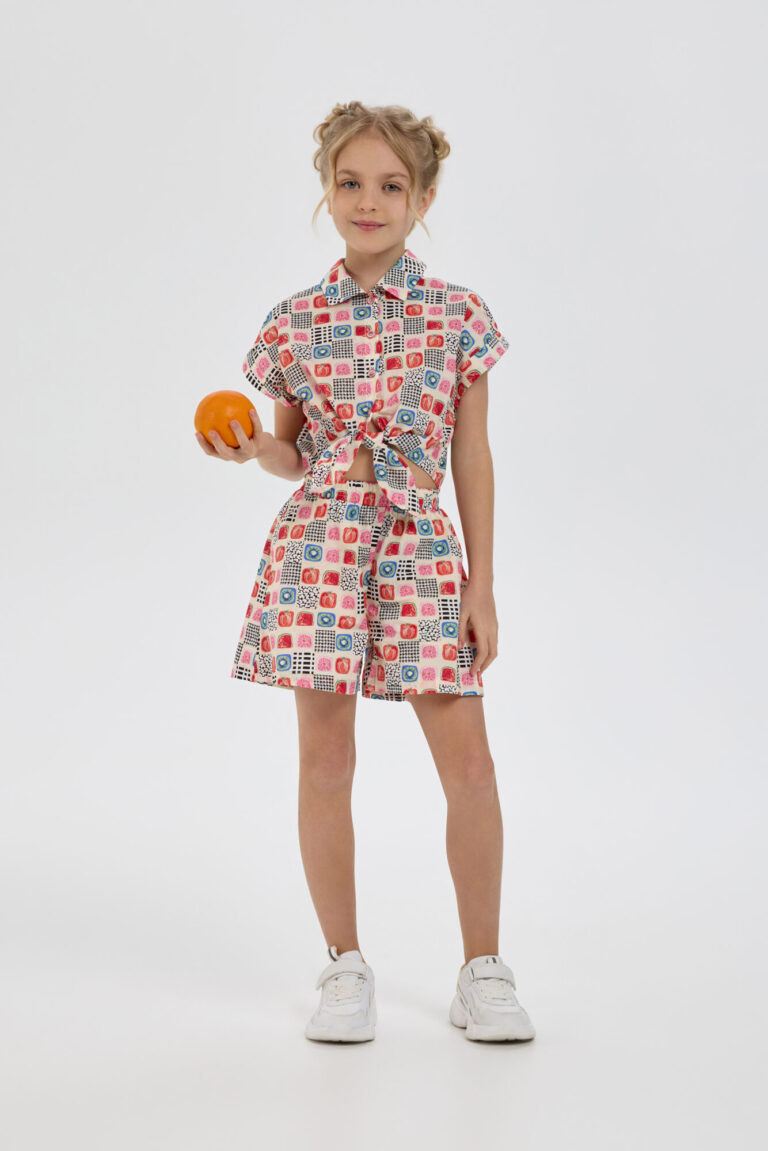 Хлопковый комплект для лета станет отличным выбором для девочки. В комплект входит рубашка с коротким рукавом и отложным воротничком. Застёгивается она на пуговицы, что очень удобно. ... На талии расположены стильные завязки. Шорты на эластичной резинке гарантируют комфортную посадку и не сковывают движений. Яркий рисунок на одежде позволяет легко комбинировать её с различной обувью и аксессуарами. Даже в сильную жару натуральный хлопок дарит ощущение удобства.