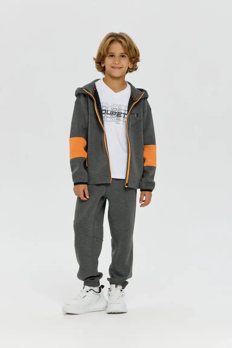 Спортивный образ мальчика отлично дополнит костюм, который станет превосходным решением для тренировок и активного времяпрепровождения. Куртка-бомбер отличается свободным кроем и акцентной контрастной застежкой-молнией. Длинные рукава заканчиваются ... эластичными манжетами. Практичные и вместительные карманы предназначены для хранения мелочей. Модный капюшон и необычные детали на рукавах придают образу оригинальность. Прямые брюки имеют эластичный пояс, который можно отрегулировать шнурком для оптимальной посадки.