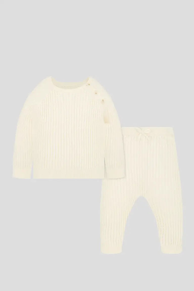 Вязаный детский костюм в сливочном цвете станет идеальным выбором для прохладных дней. Комплект включает в себя уютный лонгслив и стильные брюки. Лонгслив украшен застежкой на пуговицы, ... что облегчает процесс переодевания и добавляет оригинальности. Мягкий материал приятно ощущается на коже, не вызывает дискомфорта даже при длительном ношении. Брюки имеют эластичный пояс, что обеспечивает надежную посадку.
