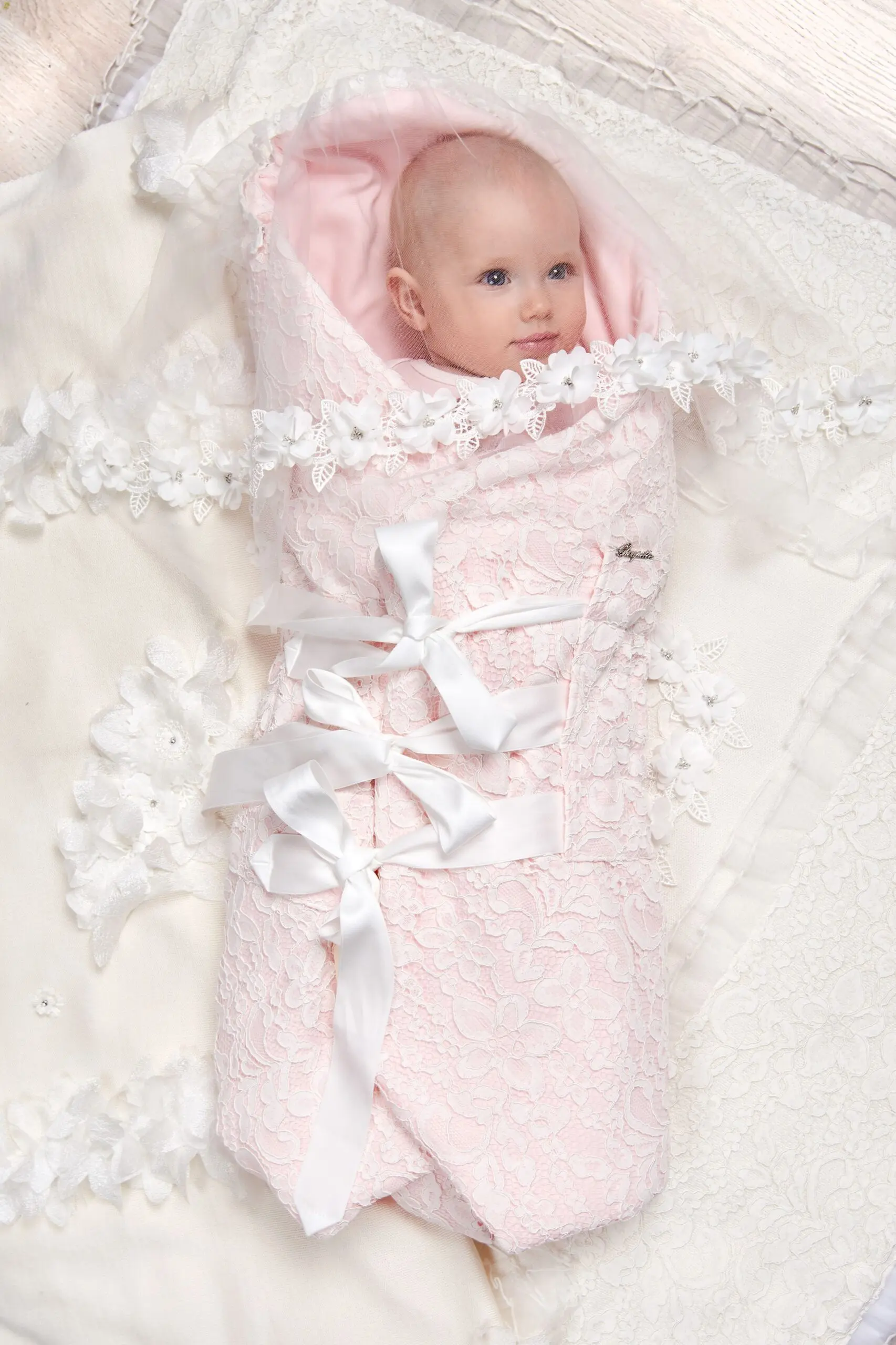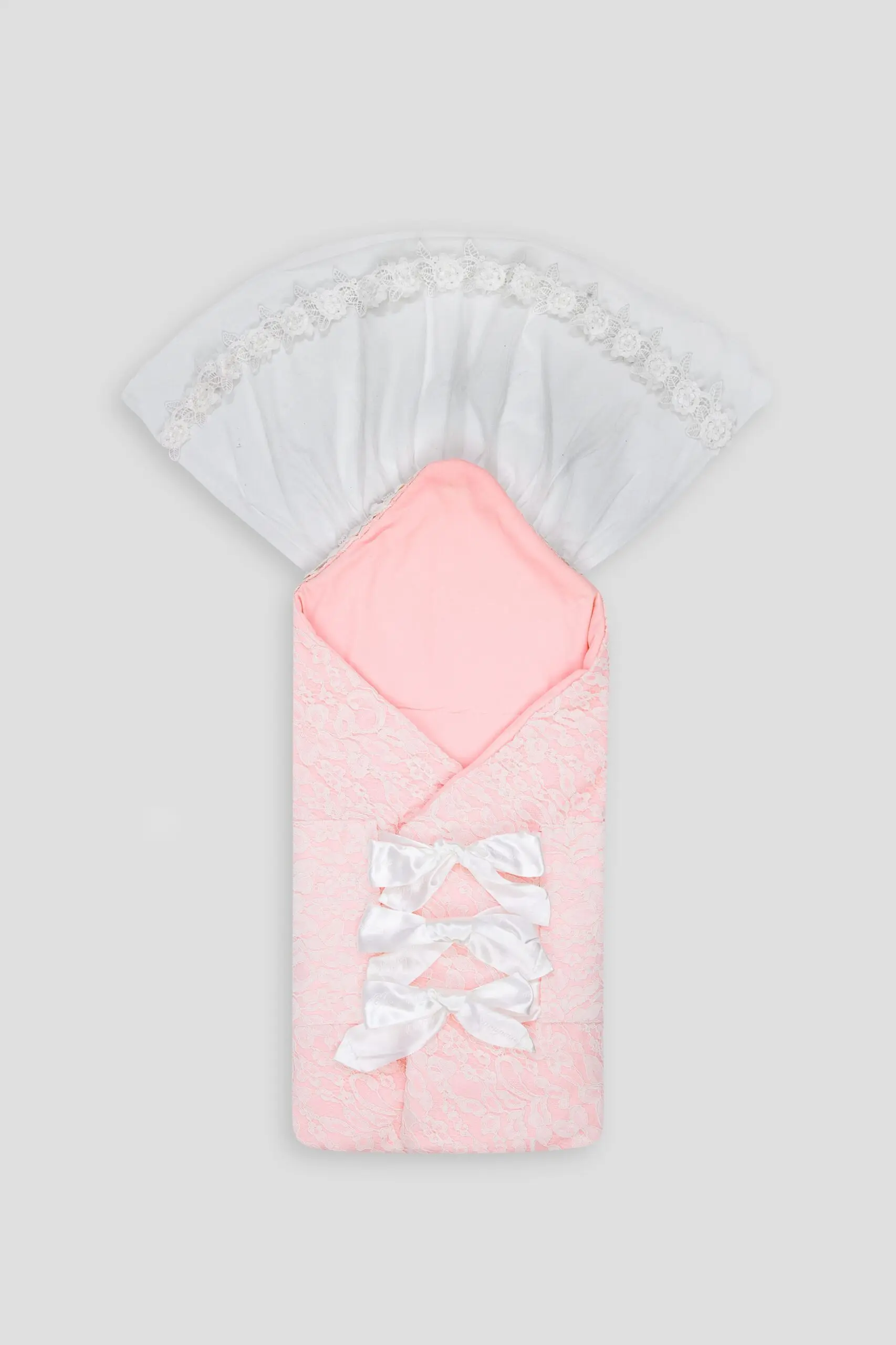 Нежно-розовый кружевной плед-конверт – то, что нужно для шикарной выписки вашей маленькой принцессы. Эта модель-трансформер необычайно практична: при необходимости она превращается в мягкий и уютный конверт ... для выписки из роддома или для прогулок в коляске в теплое время года. Конверт легко превращается в плед-одеяльце, которое можно использовать для того, чтобы укрыть малышку в кроватке. Выполненный из натуральных материалов детский плед-конверт Choupette своим теплом и нежностью дает ребенку ощущение безопасности и заботы о нем, отлично сохраняет оптимальный тепловой баланс. Эффектная отделка кружевом, текстильными цветами со стразами, атласными лентами делает этот плед-конверт для девочки элегантным и изысканным.