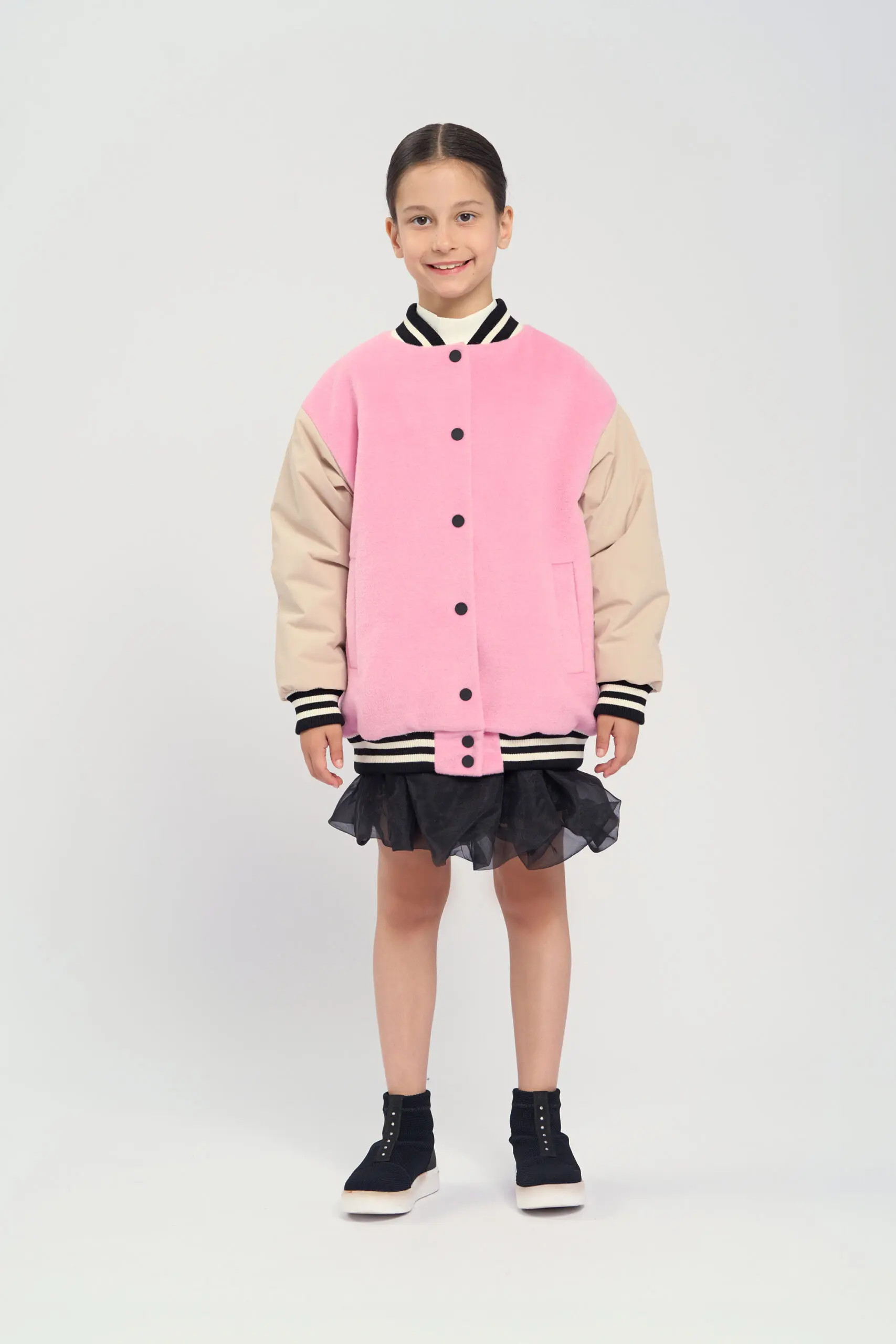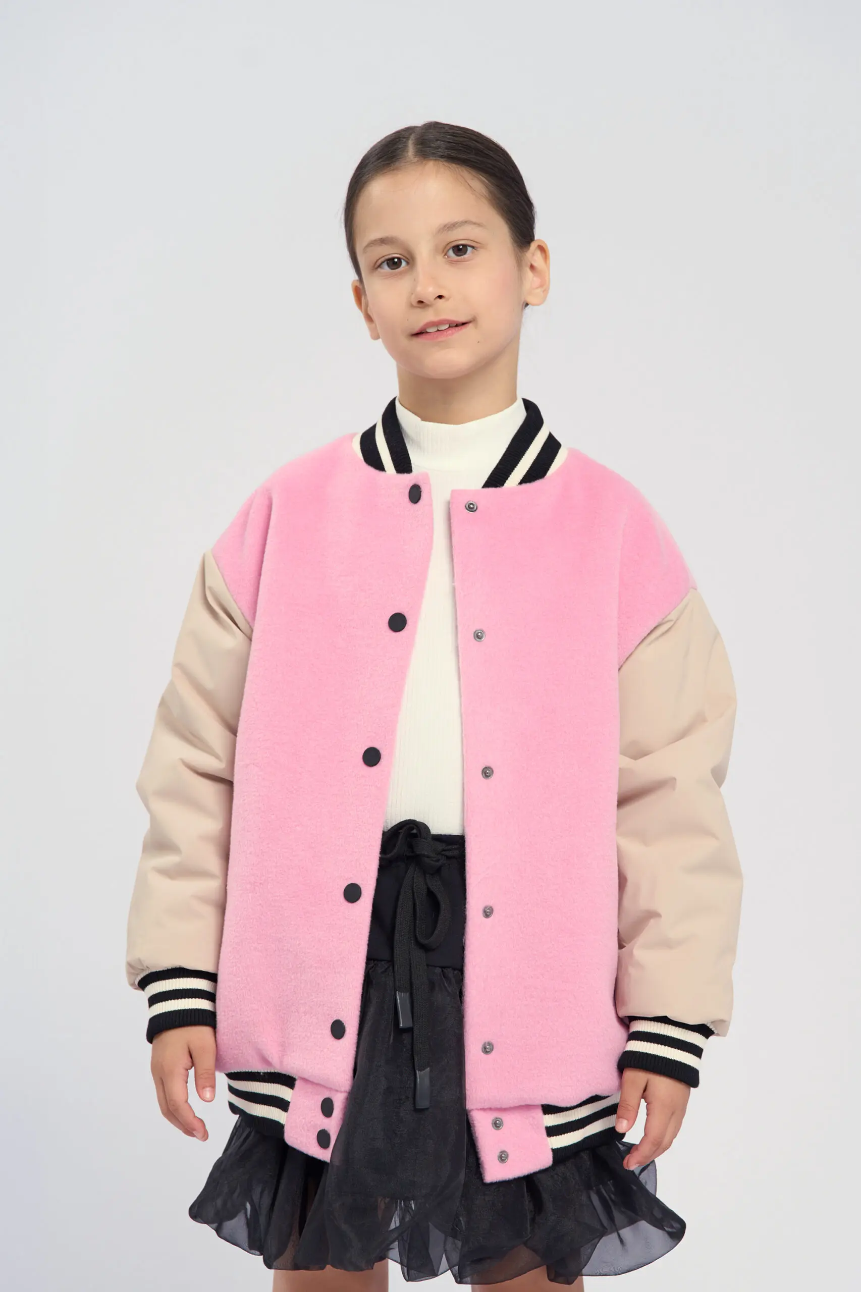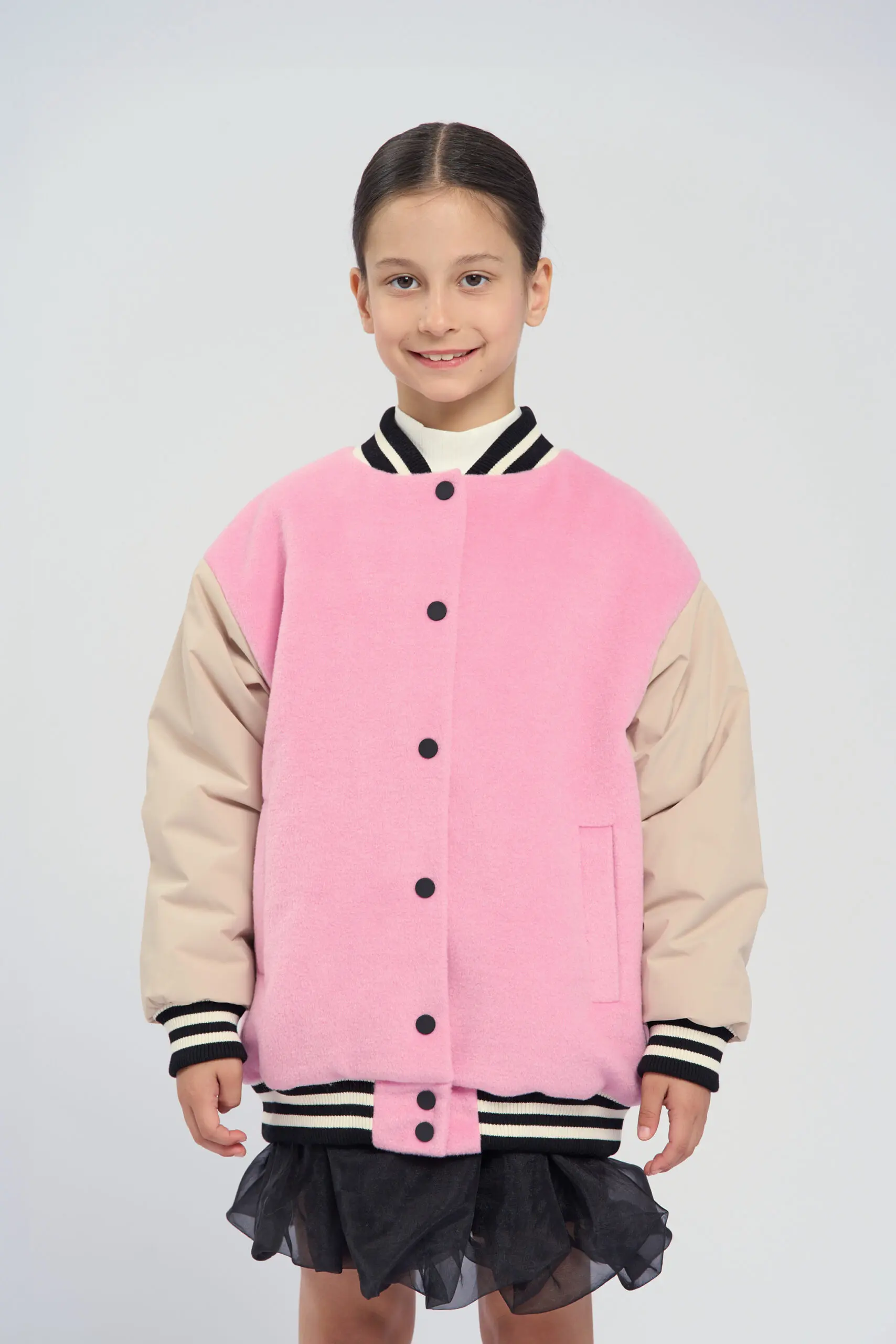 Модная куртка-бомбер для девочки имеет актуальный крой оверсайз, это позволяет создать трендовый и запоминающийся образ. Куртка выполнена в розовом цвете. Бежевые рукава создают красивый контраст. Эластичный ... воротник, манжеты и пояс оформлены полосатым трикотажем. Застежкой служат надежные кнопки. Утеплитель из полиэфирного волокна легкий и не добавляет веса одежде, при этом он обеспечивает отличную теплоизоляцию.