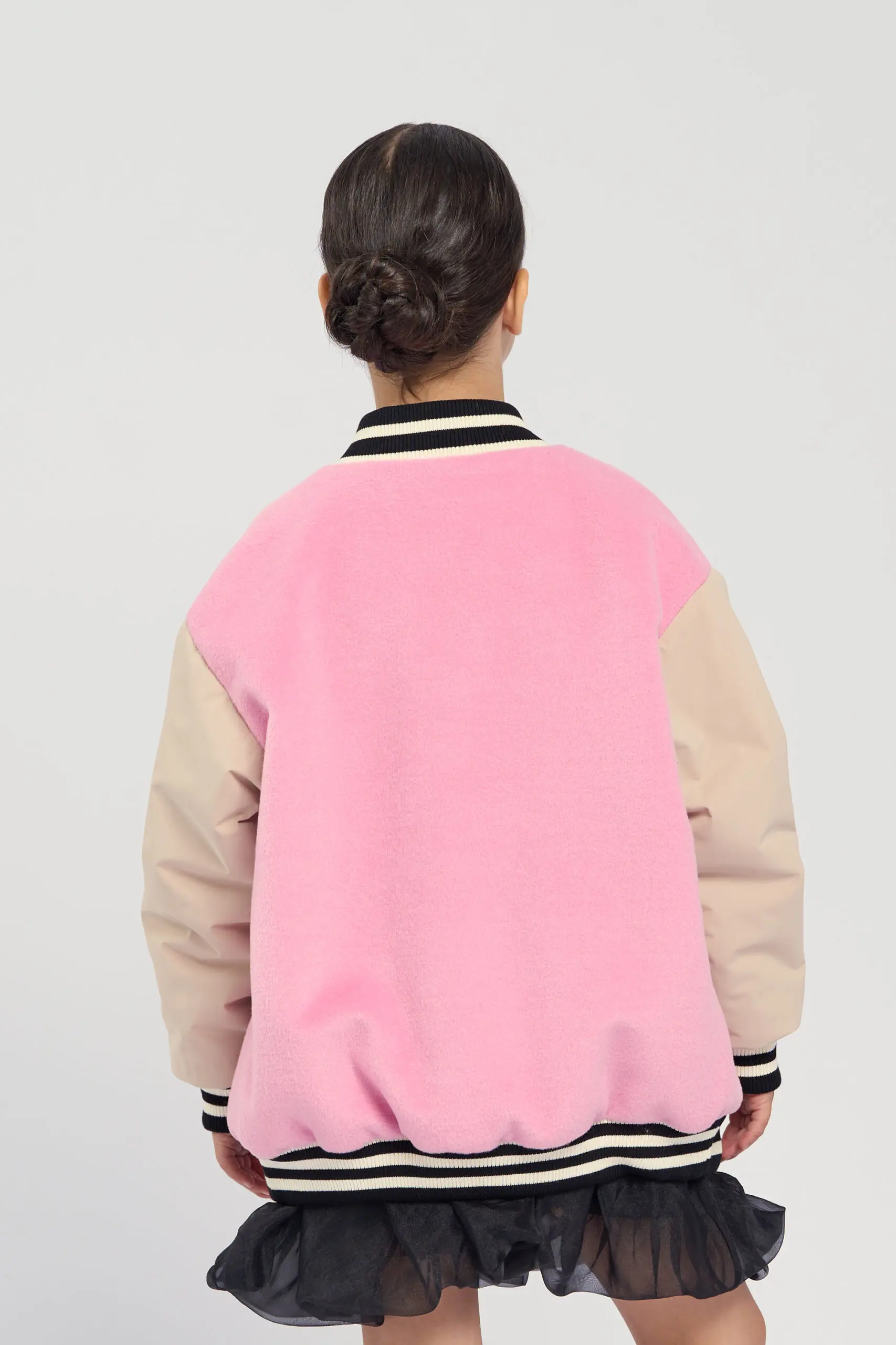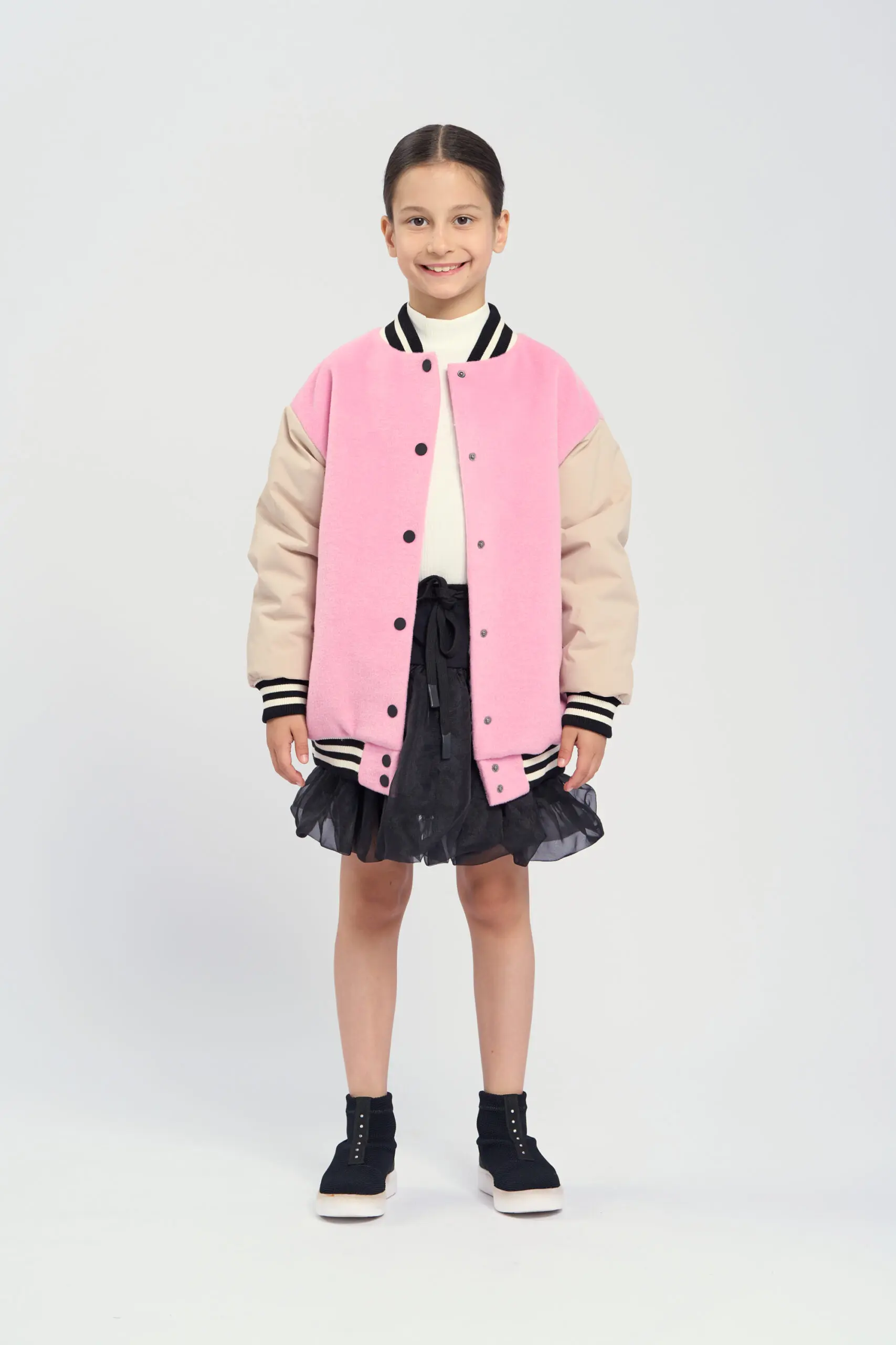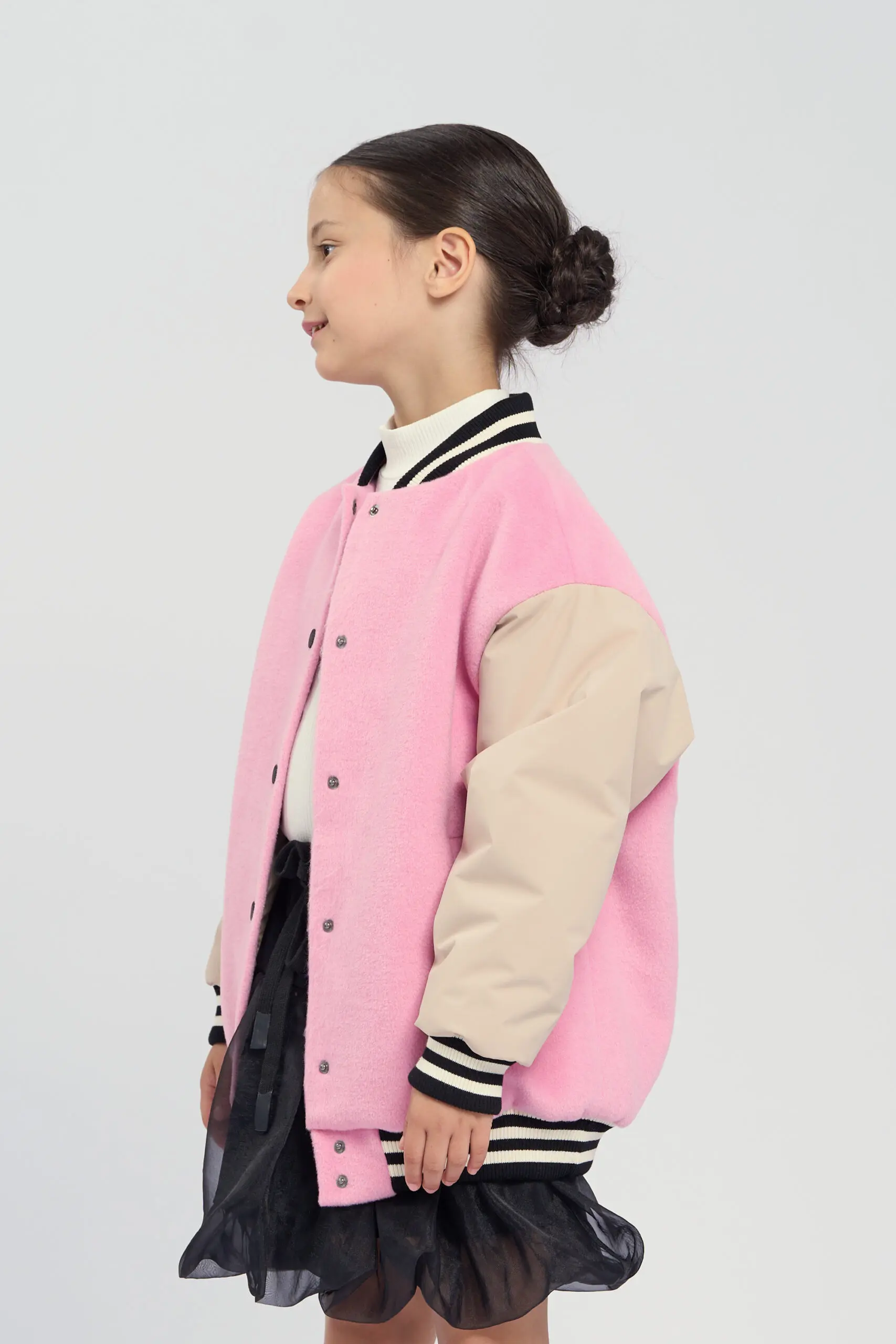 Модная куртка-бомбер для девочки имеет актуальный крой оверсайз, это позволяет создать трендовый и запоминающийся образ. Куртка выполнена в розовом цвете. Бежевые рукава создают красивый контраст. Эластичный ... воротник, манжеты и пояс оформлены полосатым трикотажем. Застежкой служат надежные кнопки. Утеплитель из полиэфирного волокна легкий и не добавляет веса одежде, при этом он обеспечивает отличную теплоизоляцию.