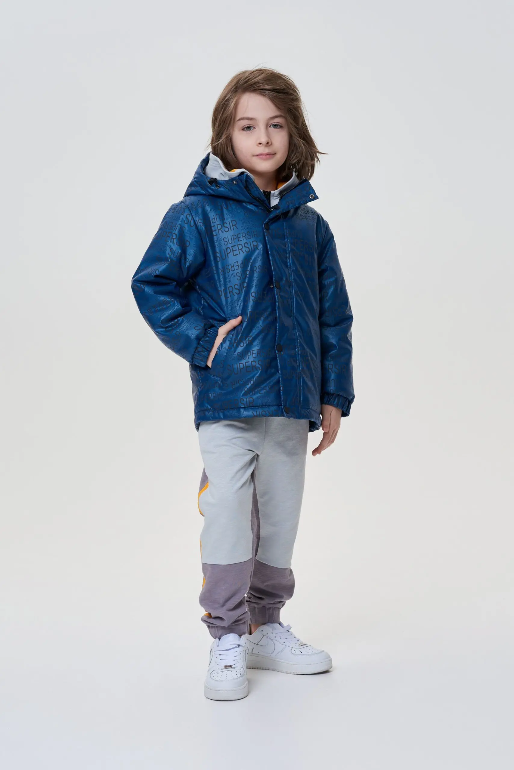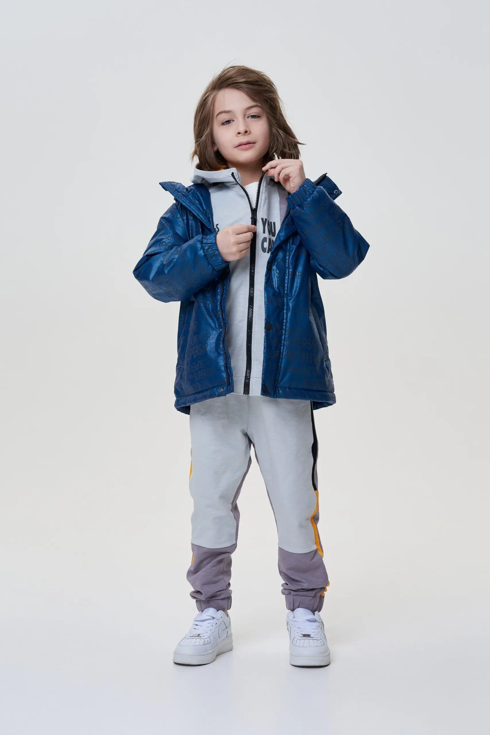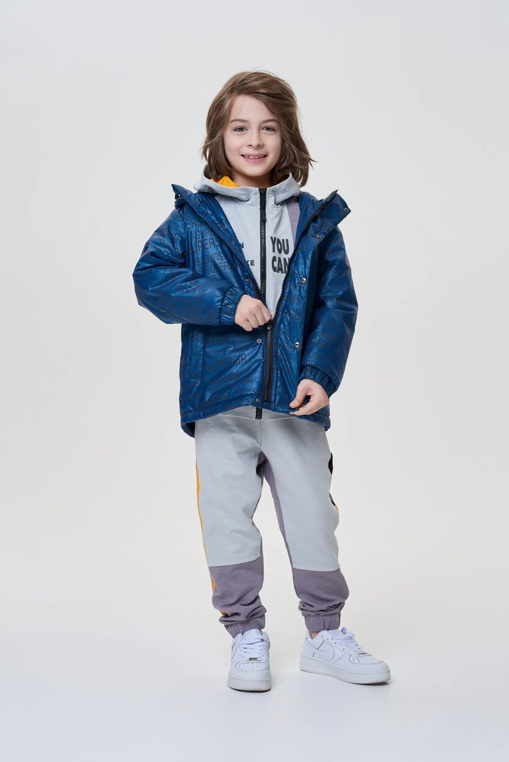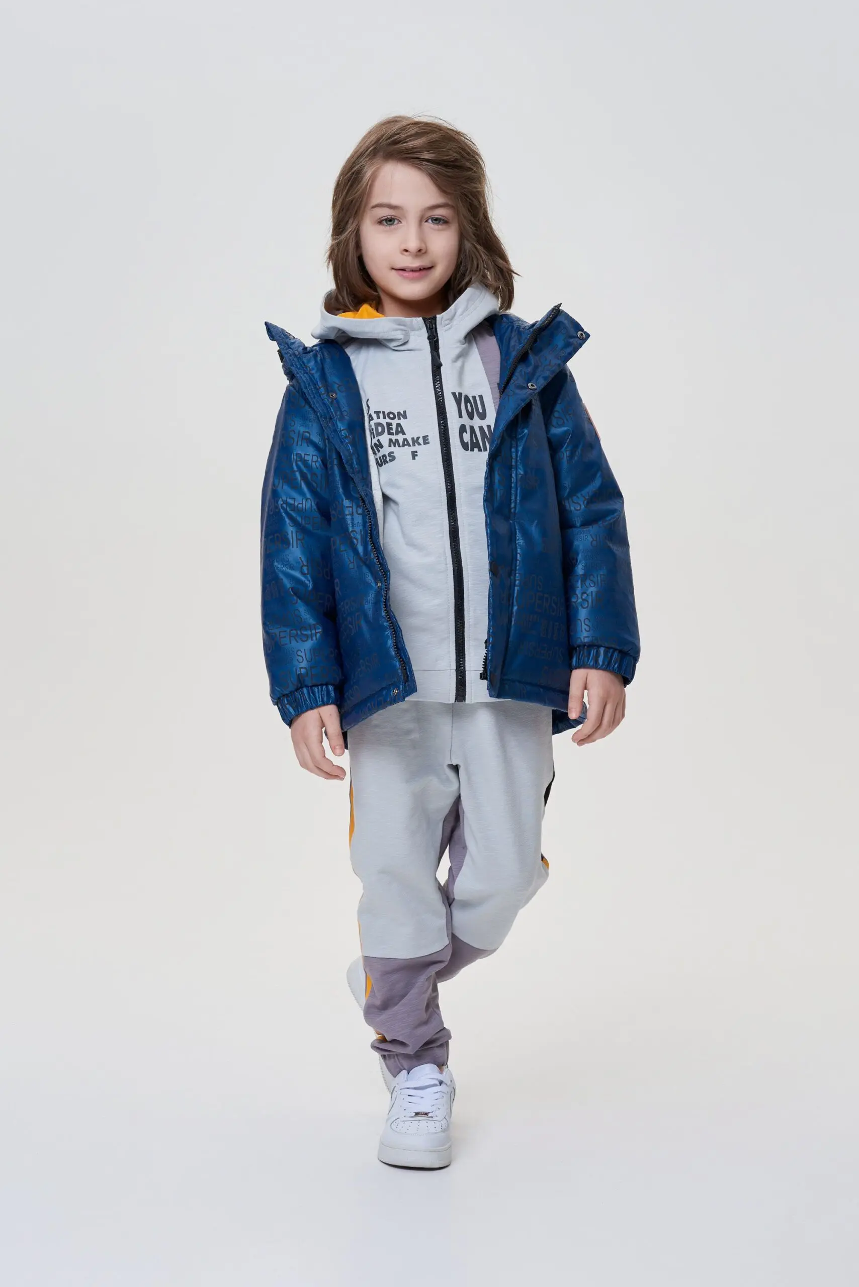 Утепленная куртка с капюшоном для мальчика соединяет в себе удобный крой и актуальную асимметрию отделки. Модель прямого силуэта, с двумя врезными карманами по бокам. Центральная застежка-молния ... прикрыта ветрозащитной планкой. Рукава на широкой резинке. Не левом рукаве и по краю правого кармана контрастные шевроны. Еще больше привлекательности модели добавляет ненавязчивый буквенный принт на синем фоне.
