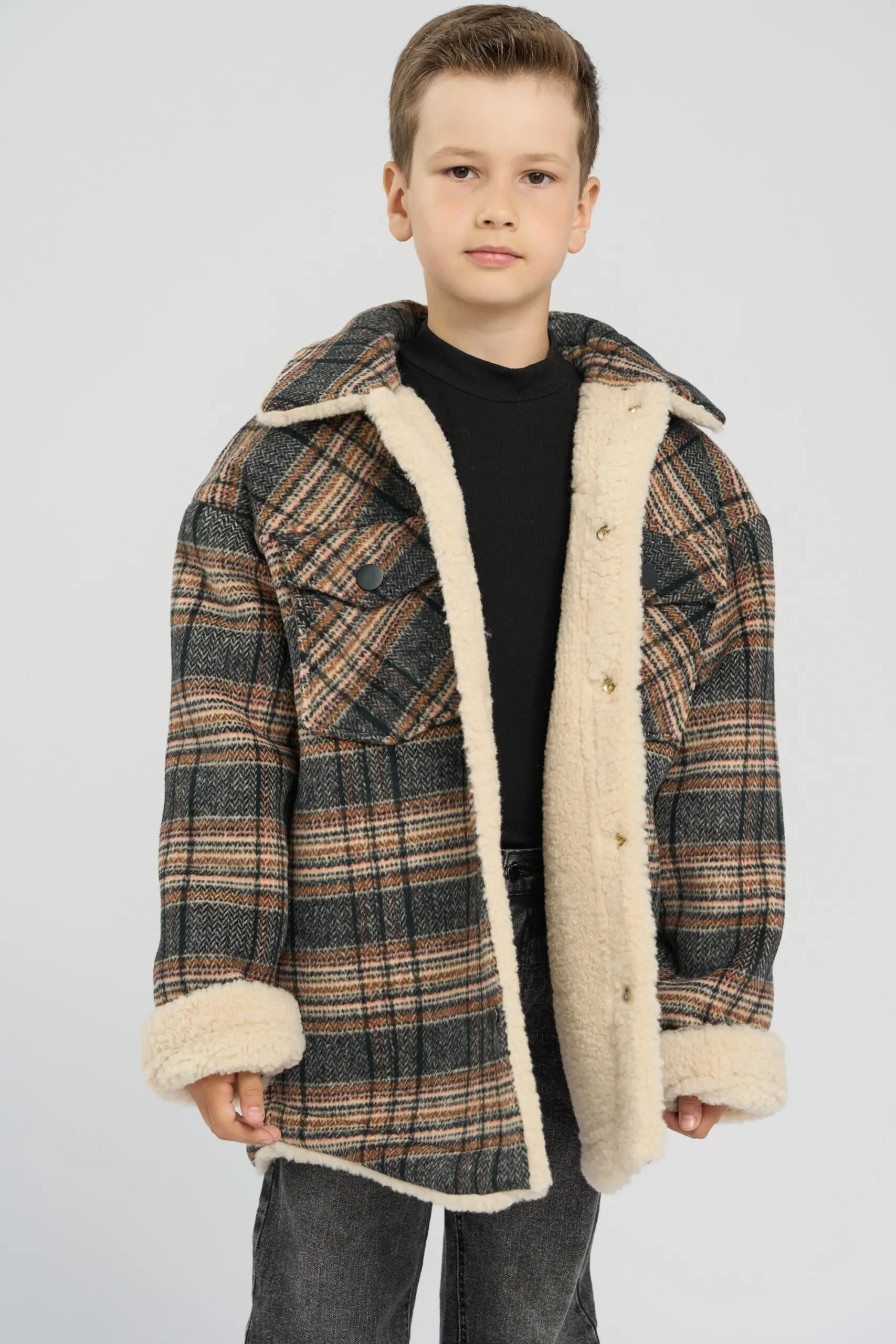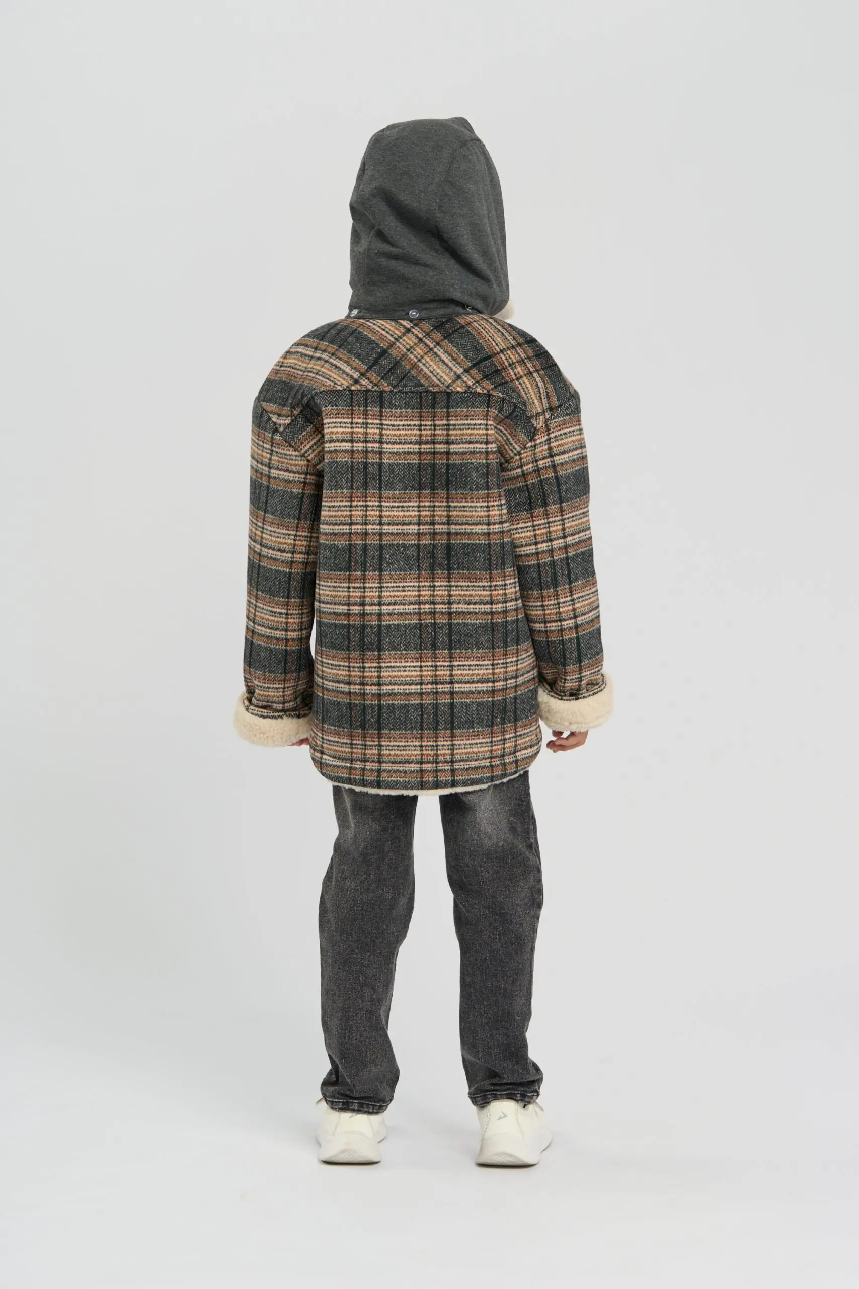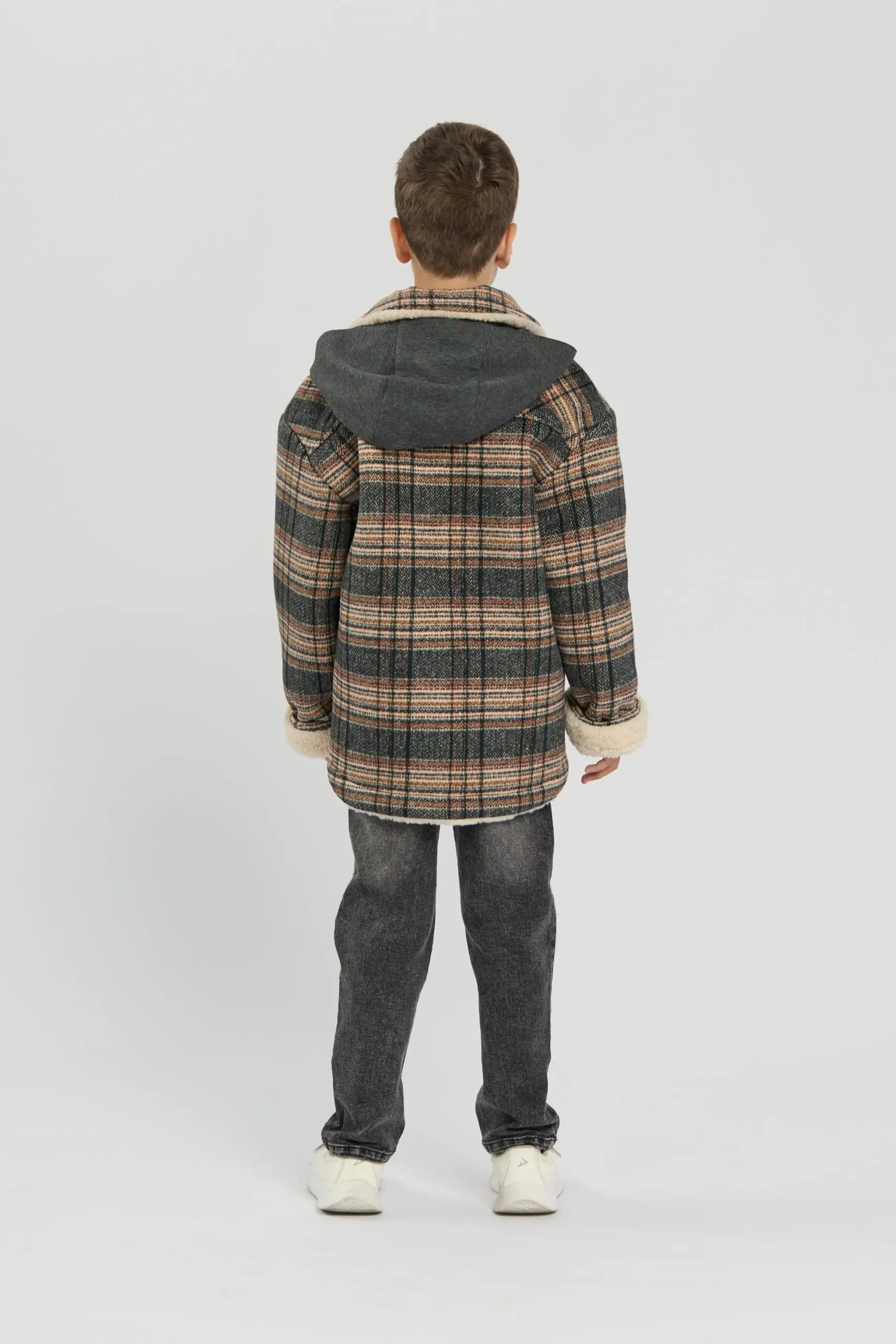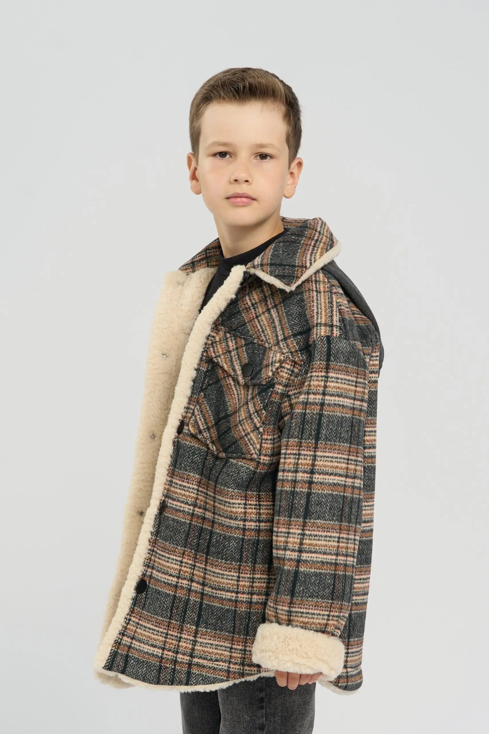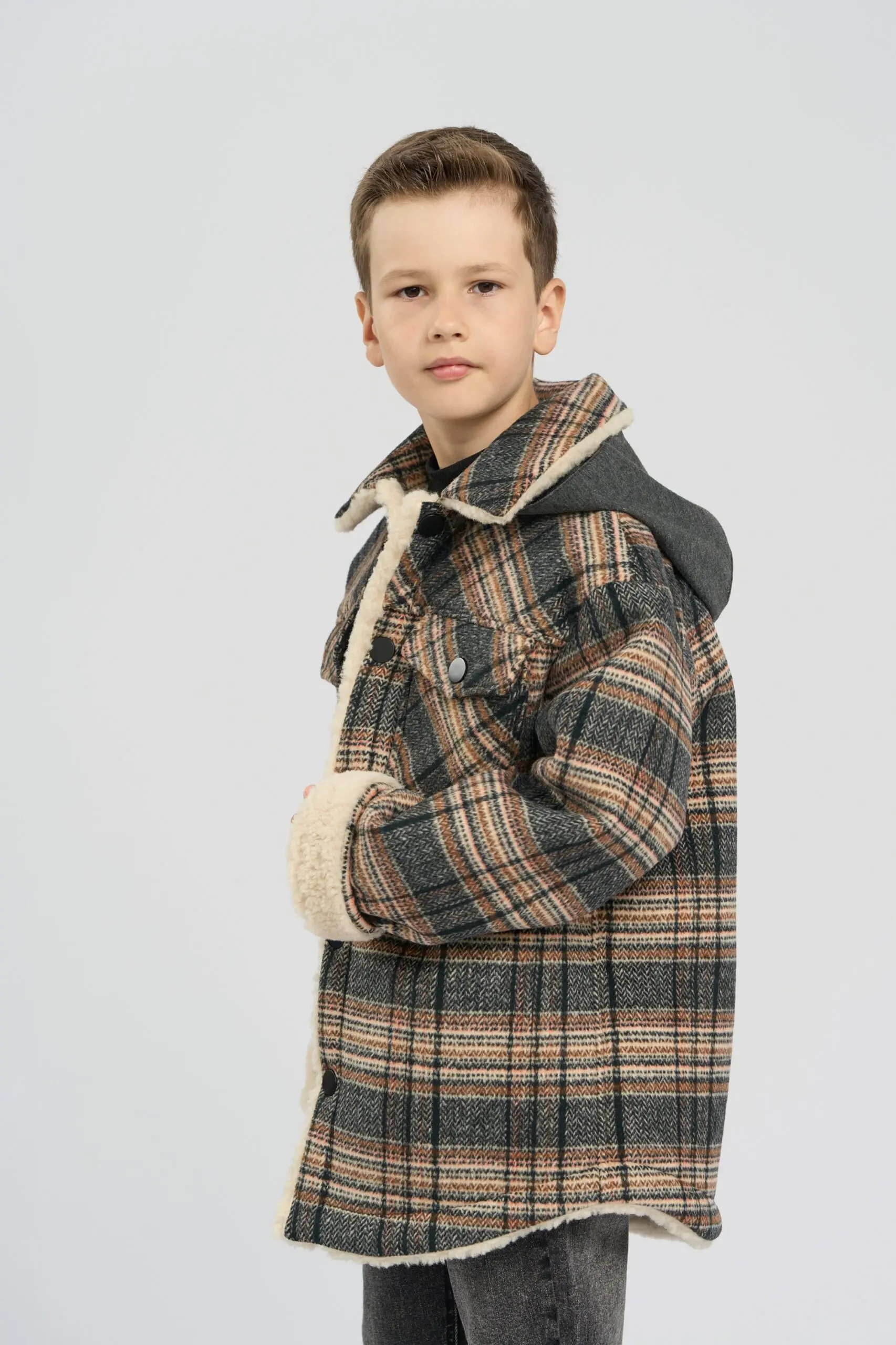 Куртка-рубашка для мальчика идеально дополнит демисезонный детский гардероб. Модель имеет актуальный рисунок в клетку. Функциональный трикотажный капюшон серого цвета служит достойной альтернативой головным уборам. При желании ... его можно снять с куртки. Фактурная отделка линии застежки и манжет мехом-тедди эффектно украшает дизайн. Комфортный прямой силуэт не сковывает движения, позволяет надевать с курткой свитеры плотной вязки. Застегивается куртка на кнопки.