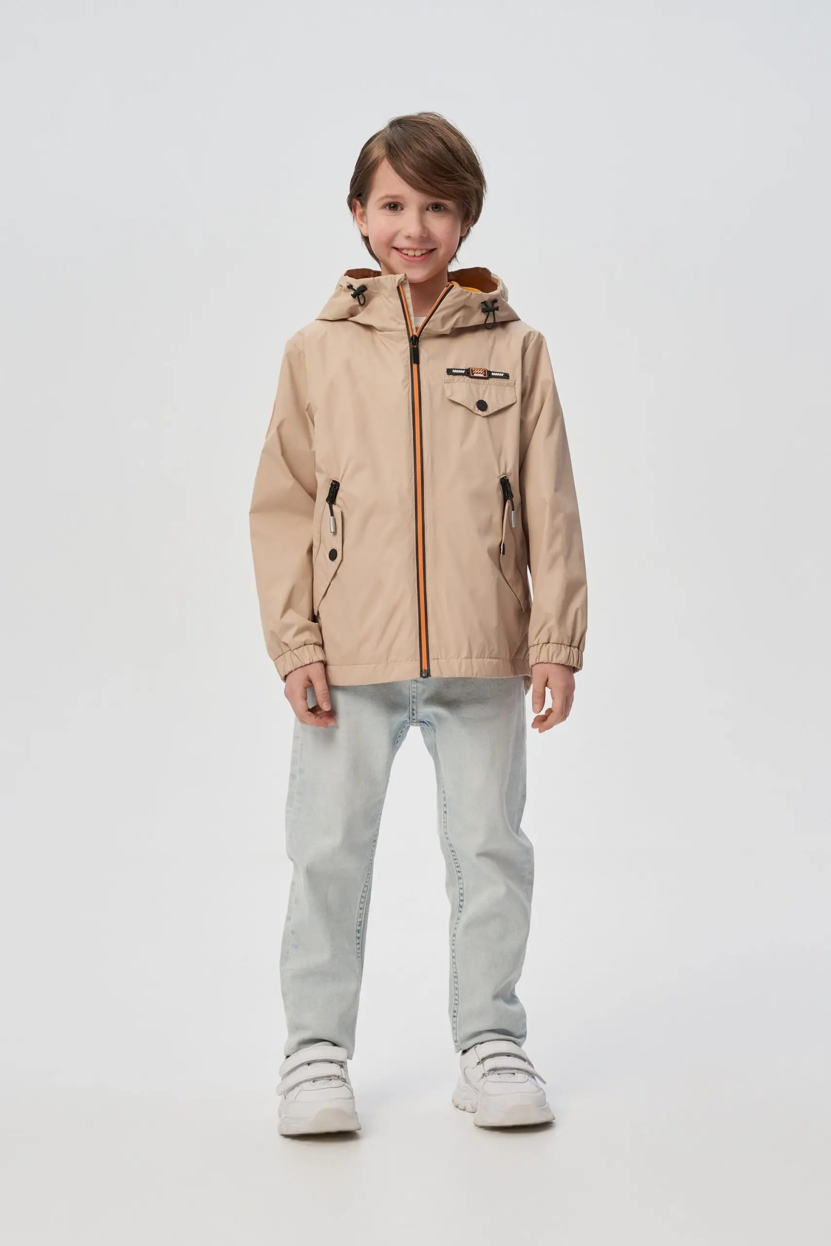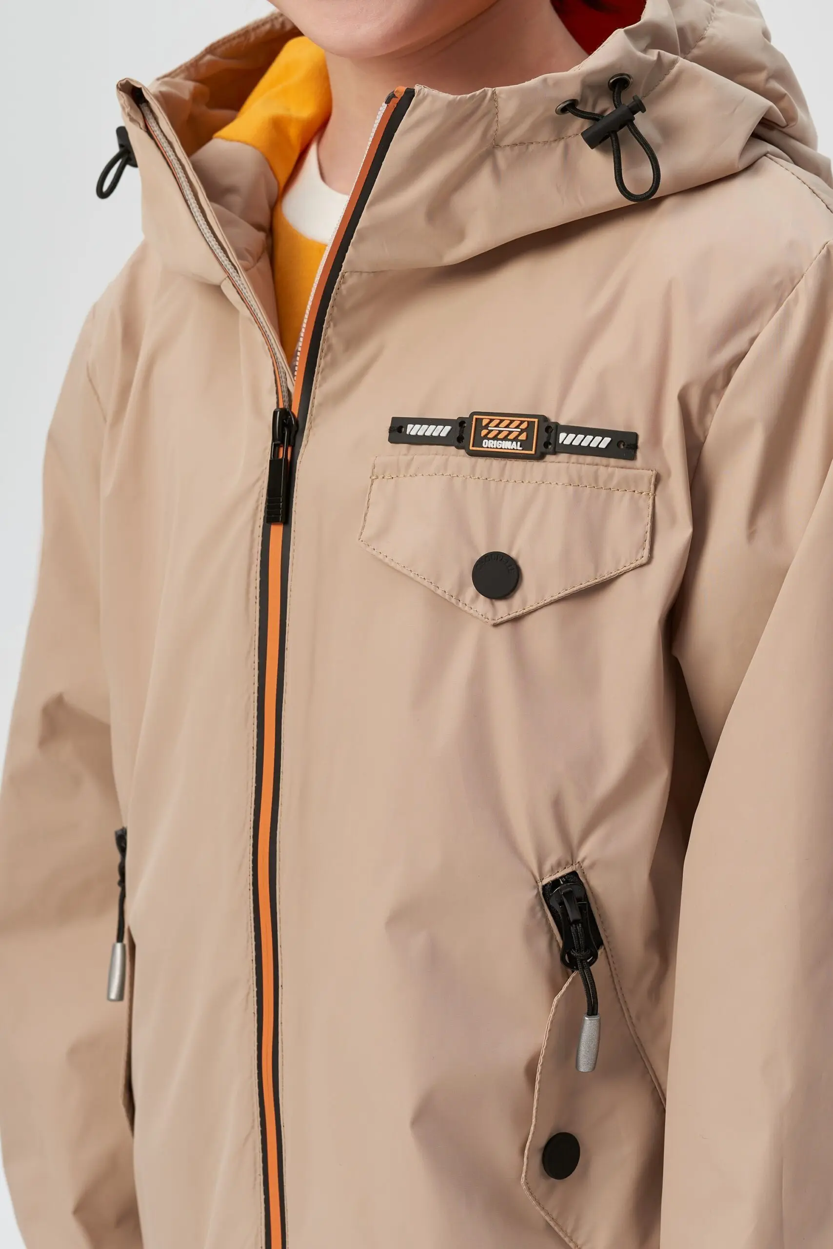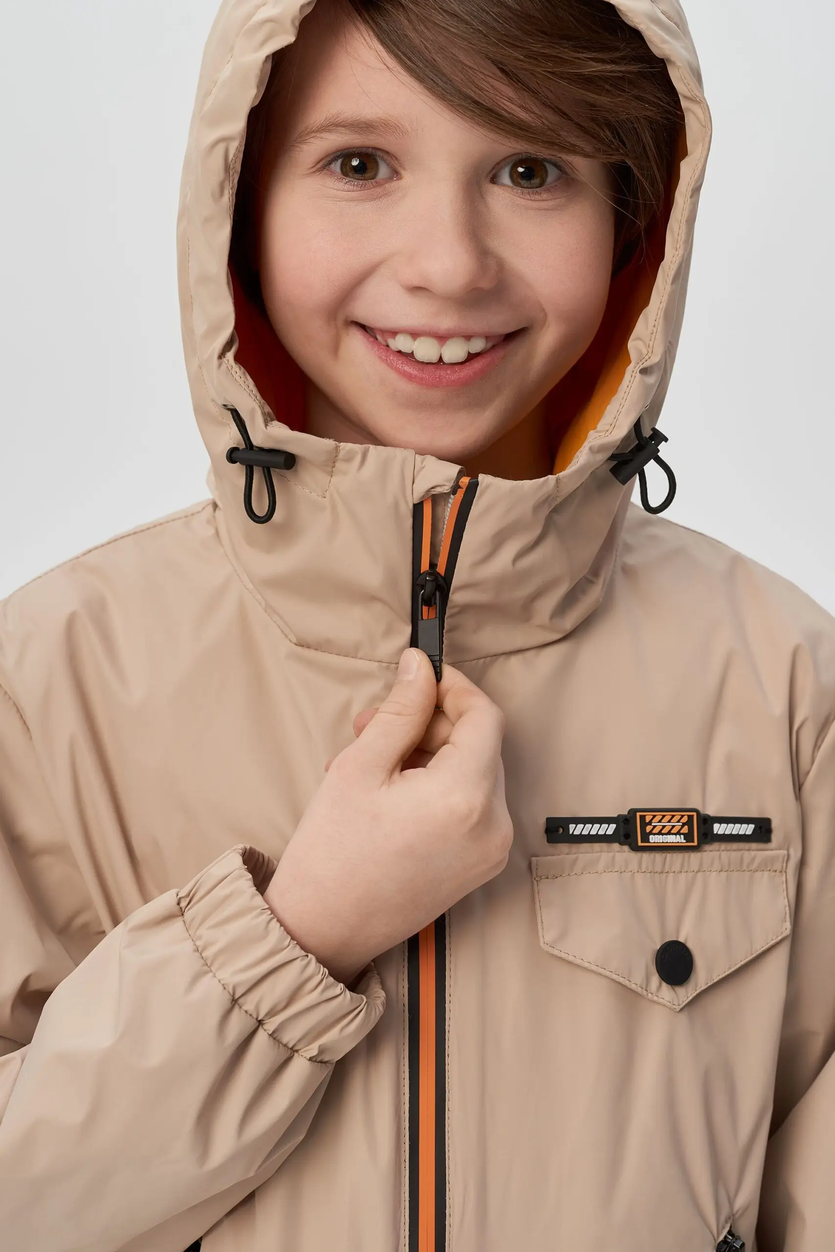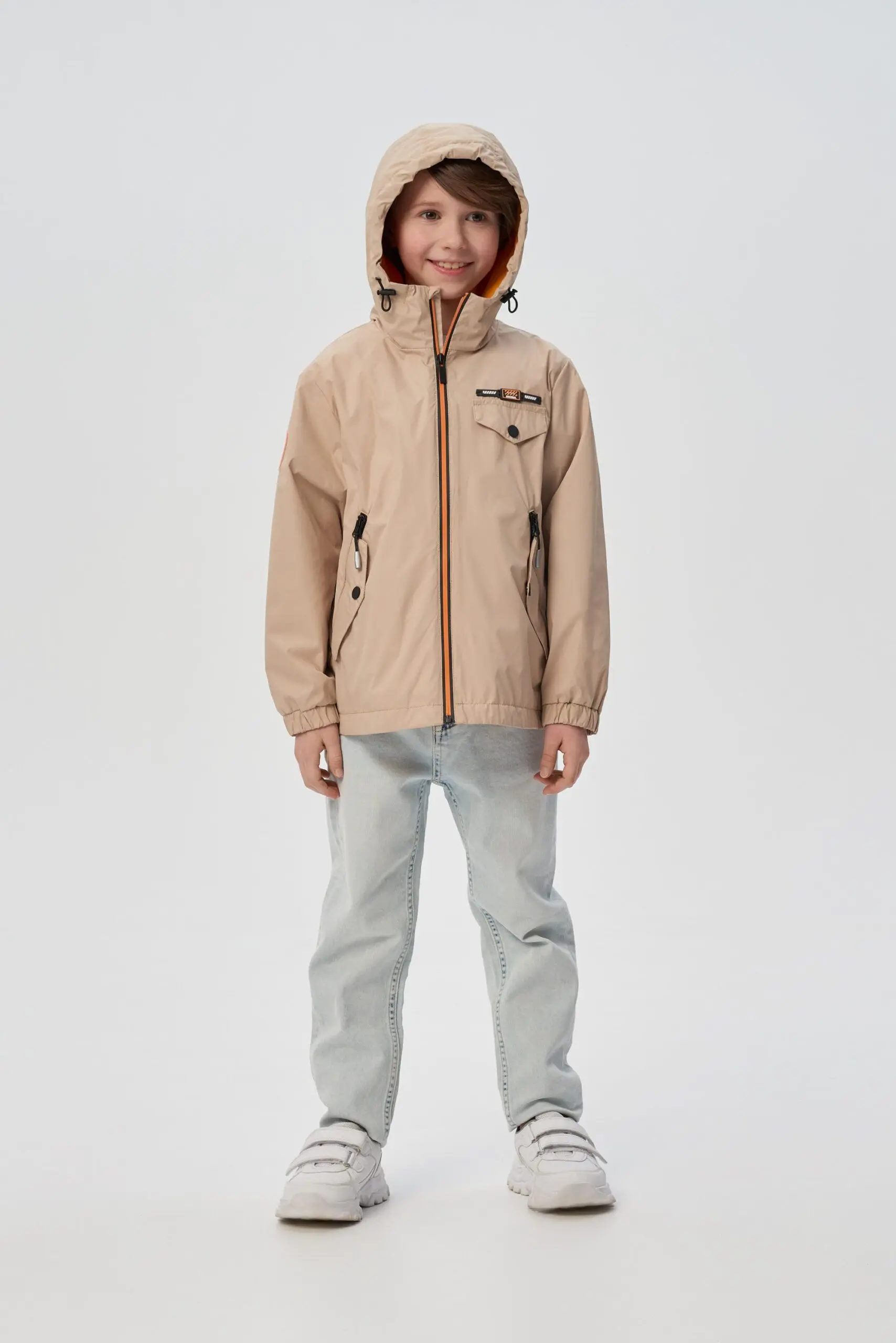 В стильной ветровке цвета охры для мальчика не страшен ни дождь, ни ветер. Модель удобного свободного кроя, с фигурной линией низа и отстегивающимся капюшоном из контрастной ... оранжевой ткани. По центру черно-оранжевая застежка на молнию. Низ рукавов собран резинкой. Боковые карманы прикрыты декоративными клапанами. На левой полочке имитация нагрудного кармана.