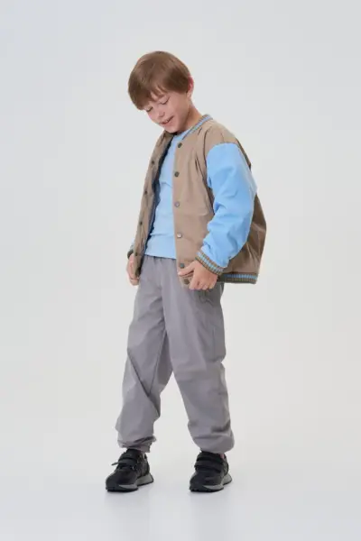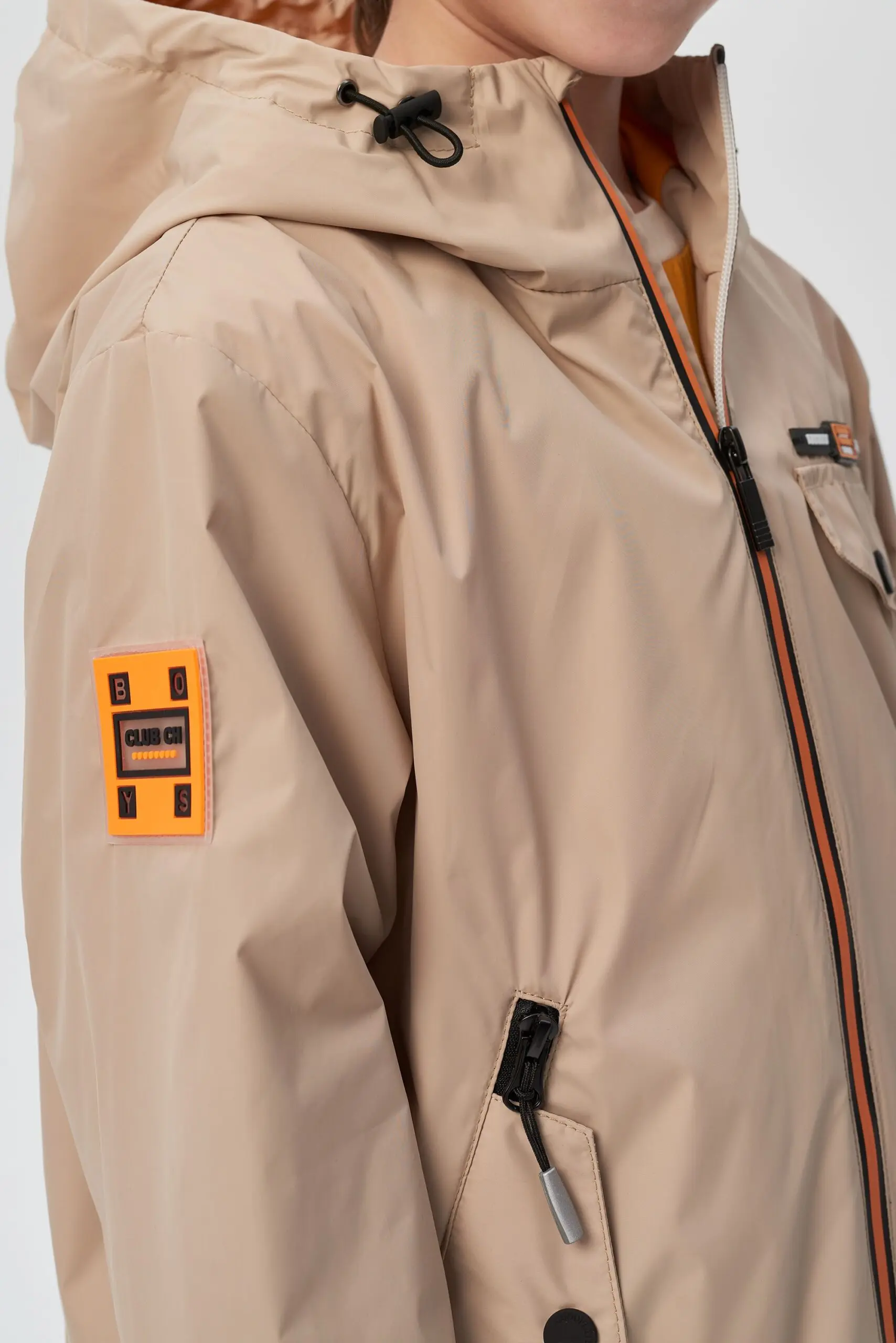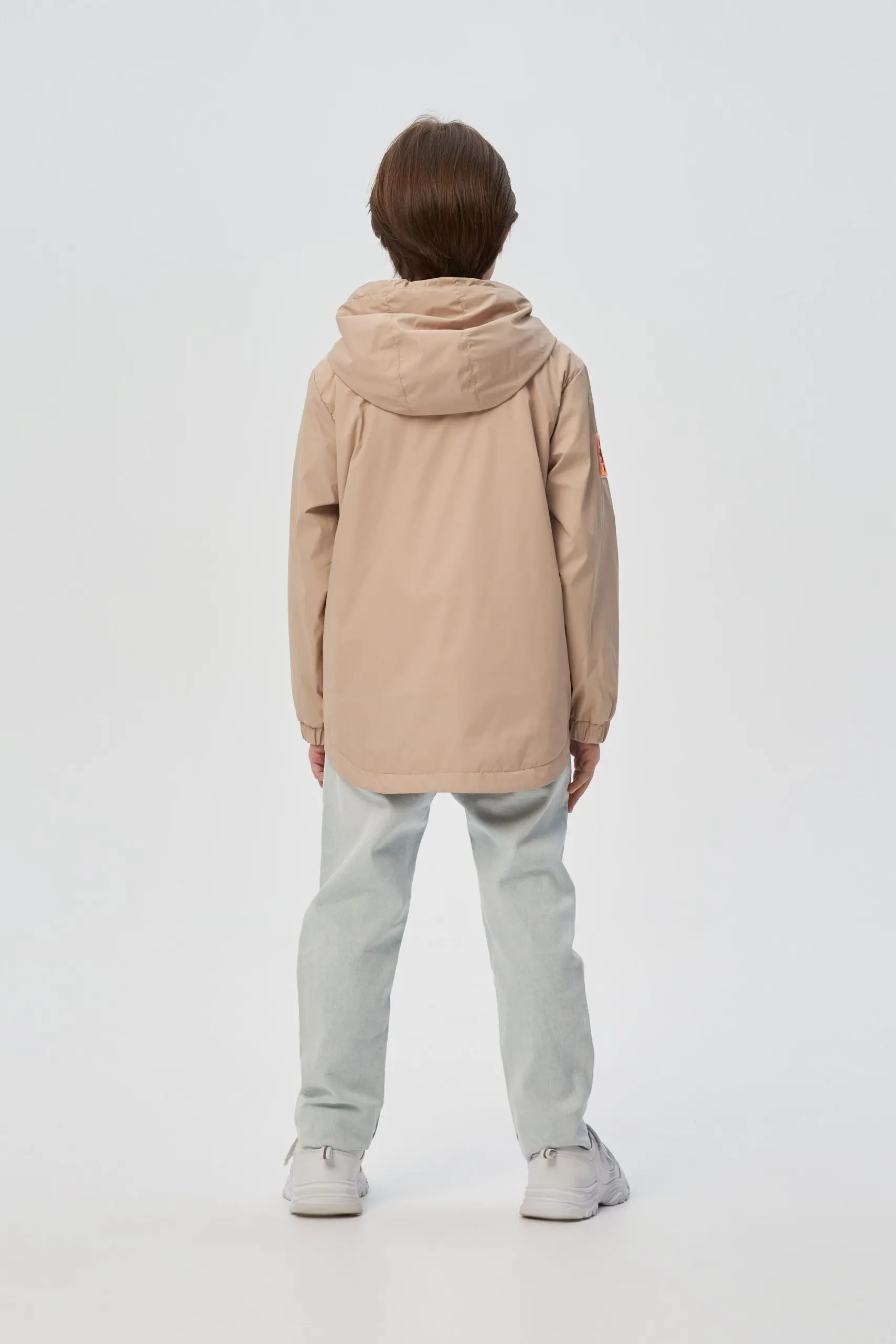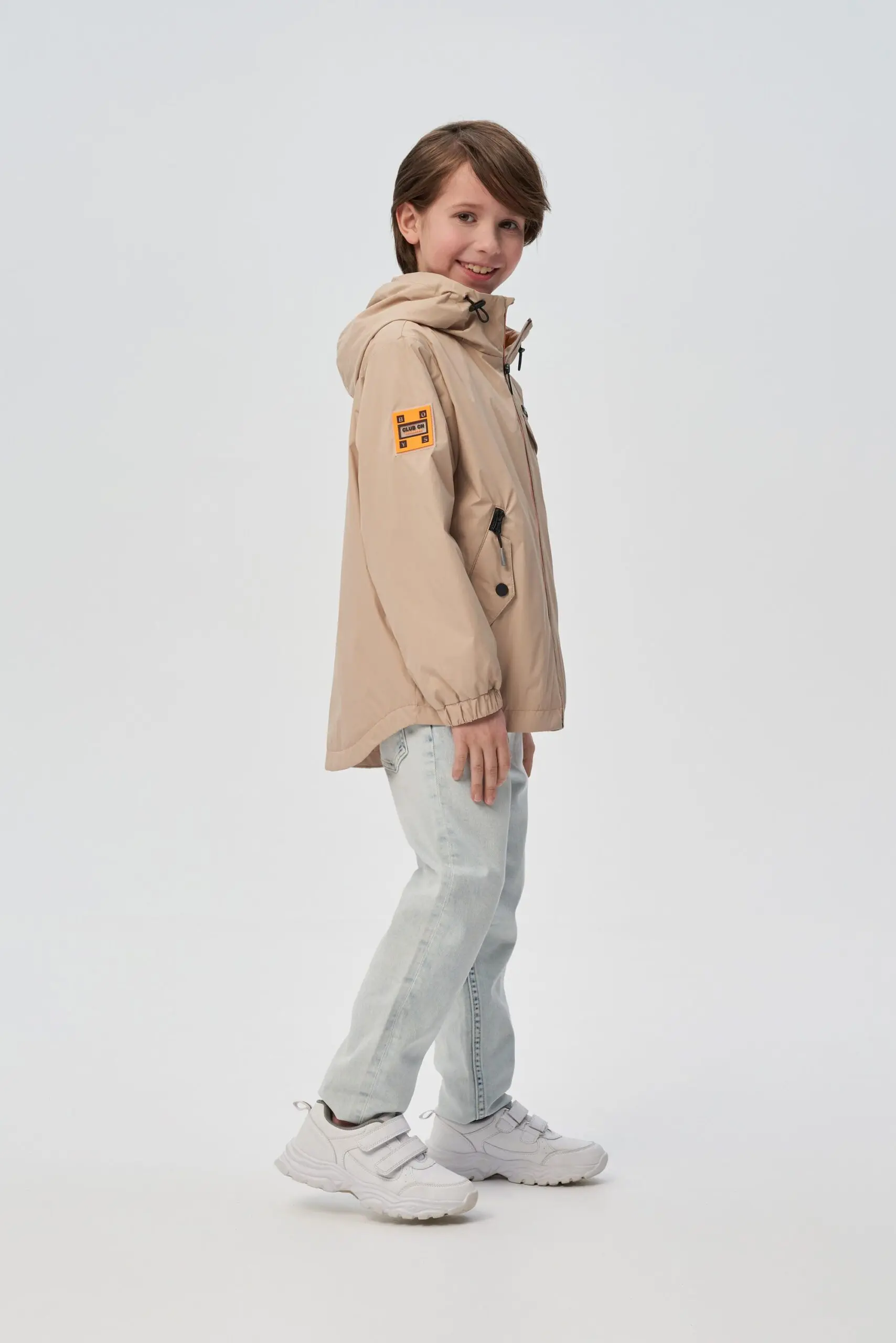 В стильной ветровке цвета охры для мальчика не страшен ни дождь, ни ветер. Модель удобного свободного кроя, с фигурной линией низа и отстегивающимся капюшоном из контрастной ... оранжевой ткани. По центру черно-оранжевая застежка на молнию. Низ рукавов собран резинкой. Боковые карманы прикрыты декоративными клапанами. На левой полочке имитация нагрудного кармана.