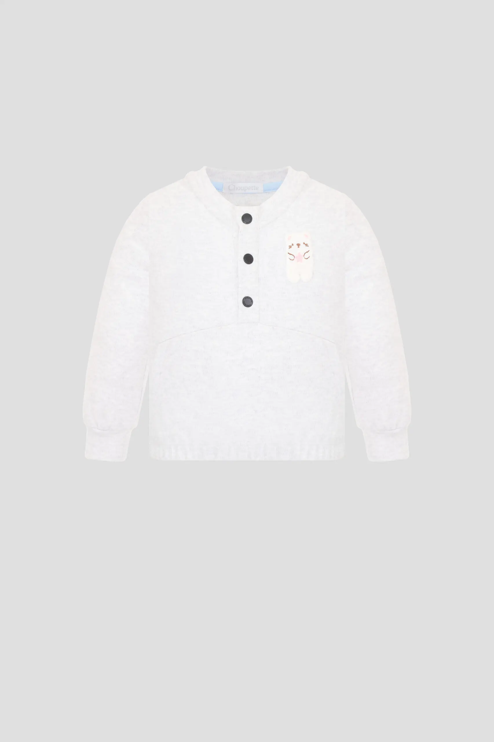 Трикотажный лонгслив серого цвета для мальчика идеально подходит на роль повседневной одежды. Модель с декором в виде мишки и застёжкой на кнопки, расположенной под круглым вырезом, ... имеет прямой силуэт. Хлопок — натуральный материал, который идеально подходит для детской одежды благодаря своим свойствам. Он не вызывает раздражения, позволяет коже дышать и впитывает влагу, обеспечивая комфорт в жаркую погоду и при активных движениях.