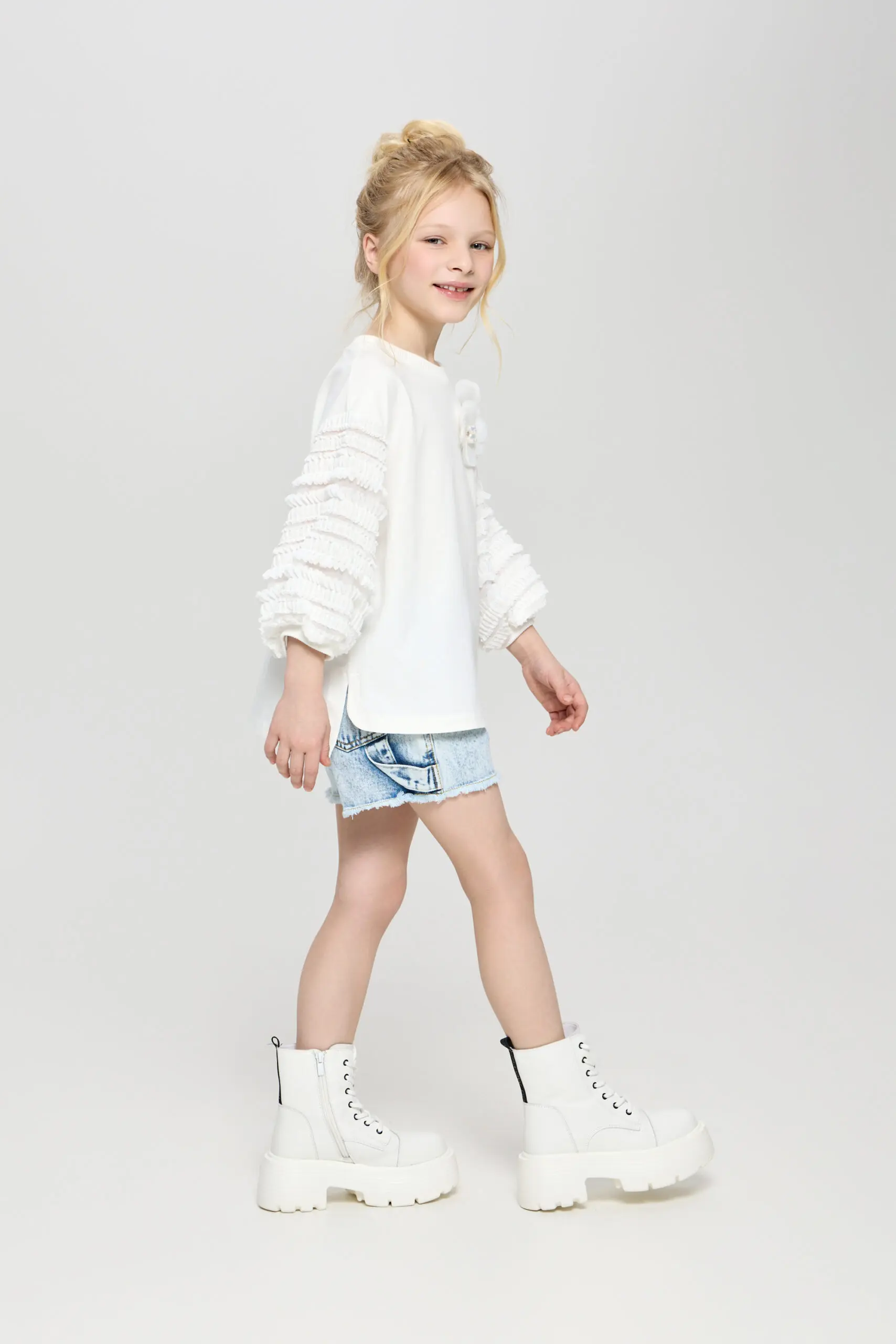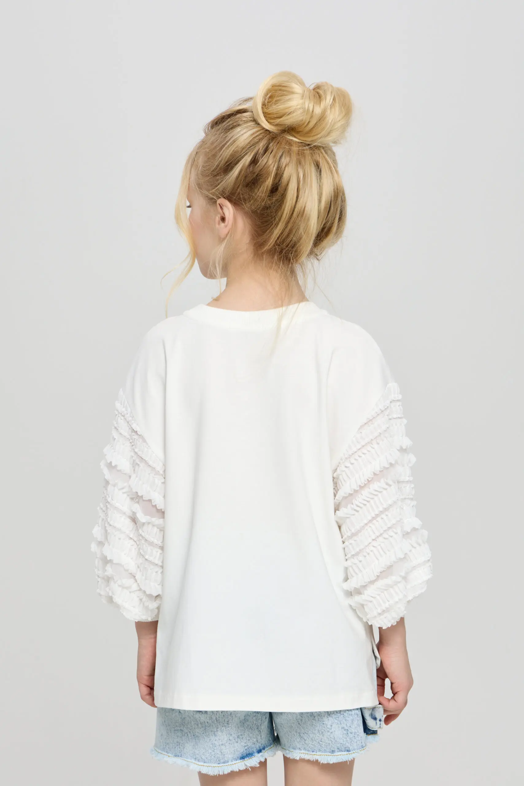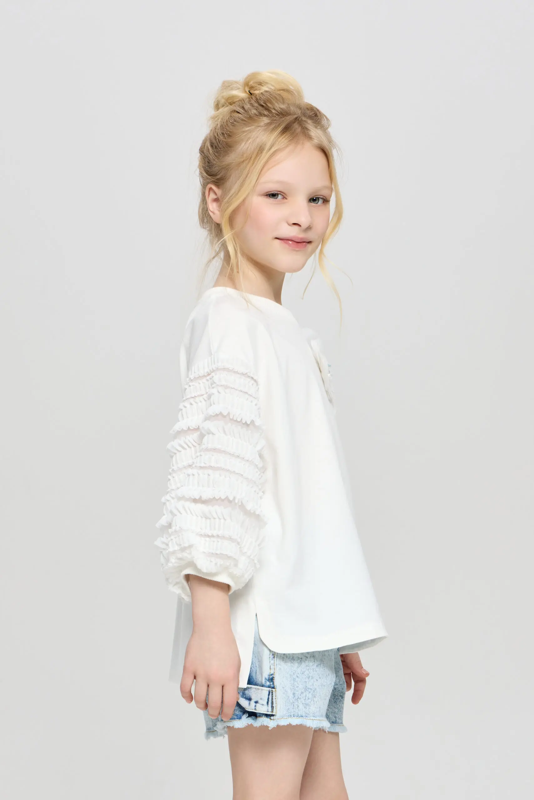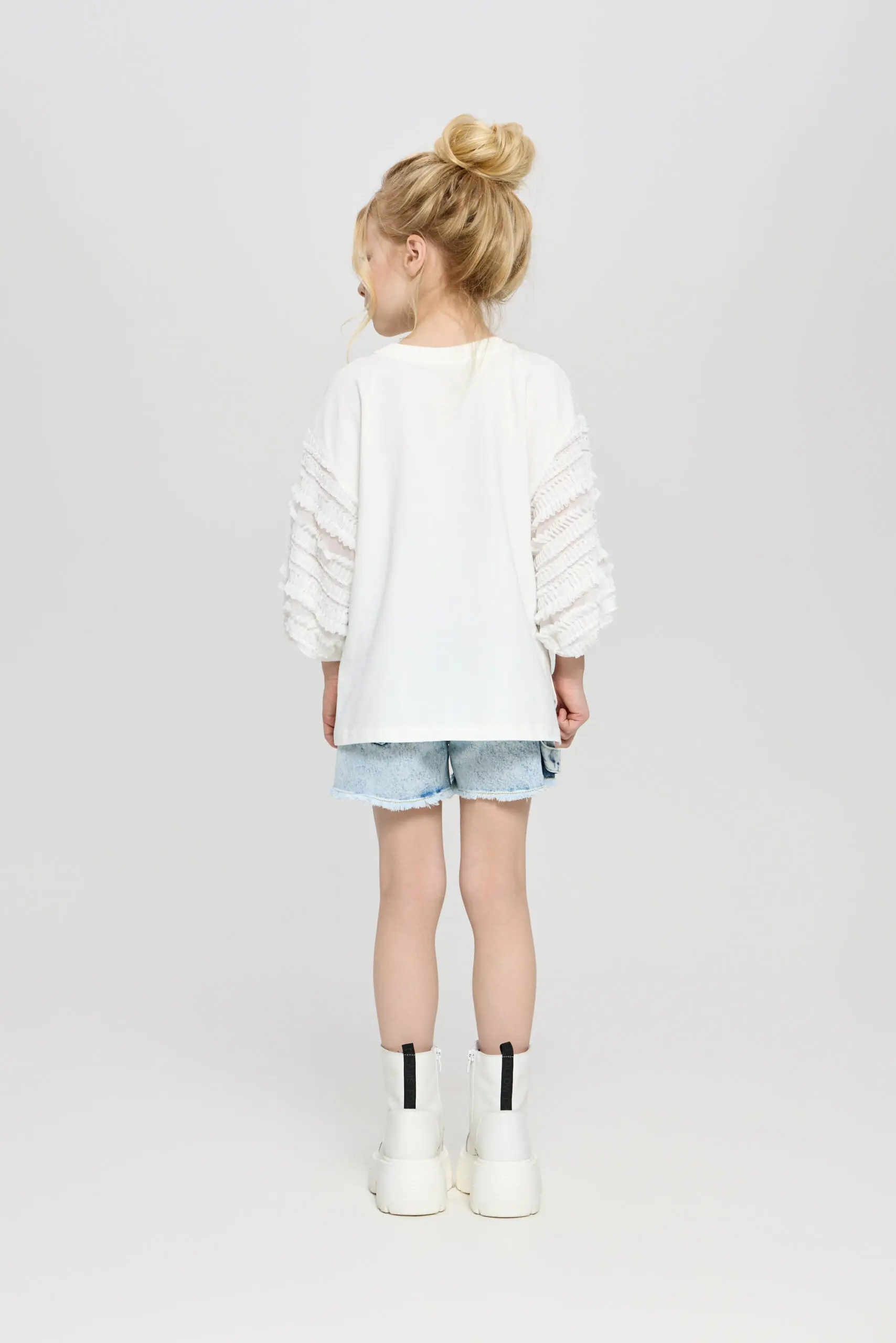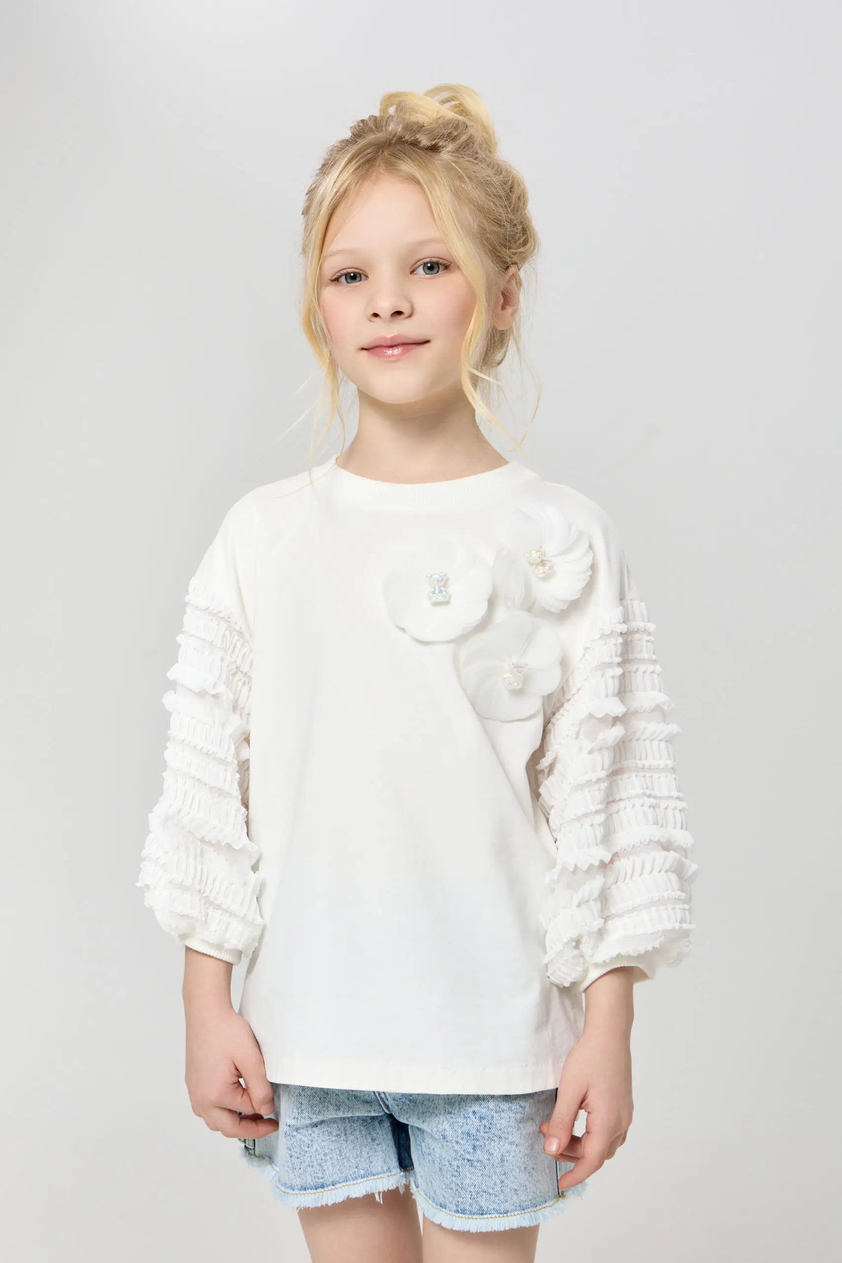 Белый лонгслив для девочки украшенный эффектным декором отлично подойдет для создания стильных образов. Модель свободного кроя с заниженной линией плеча и удлинённой спинкой выглядит очень стильно ... и современно. Объёмные рукава и дизайнерский декор привлекают внимание. Универсальная модель идеально подходит как для повседневного использования, так и для праздника. Лонгслив прекрасно комбинируется с джинсами, леггинсами шортами или юбками.