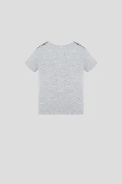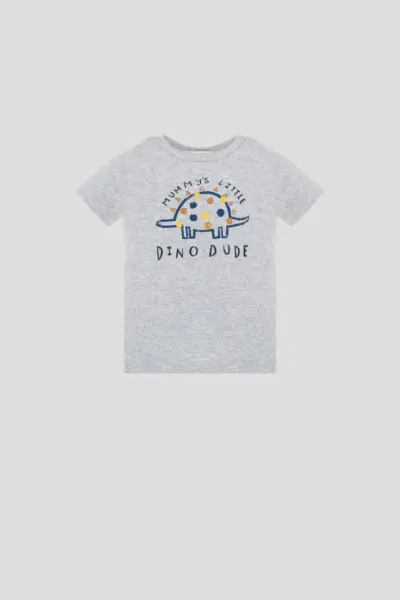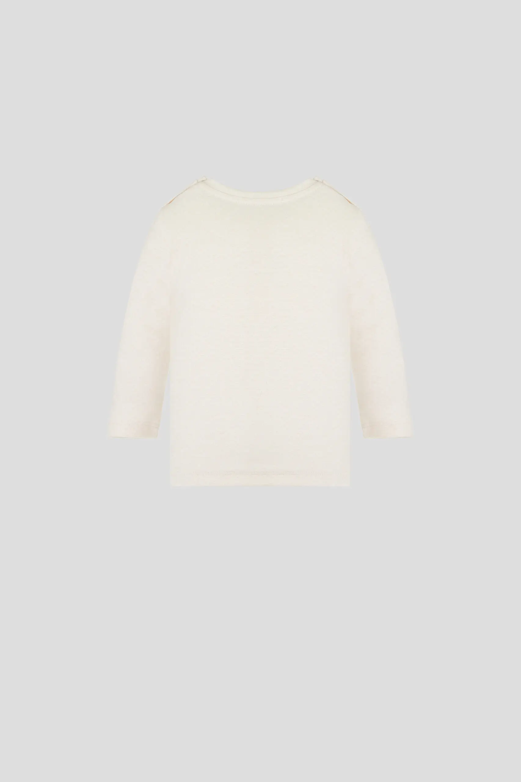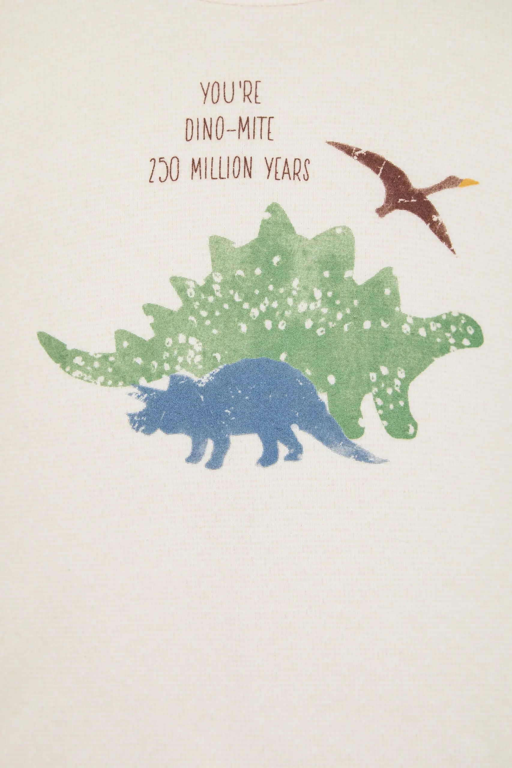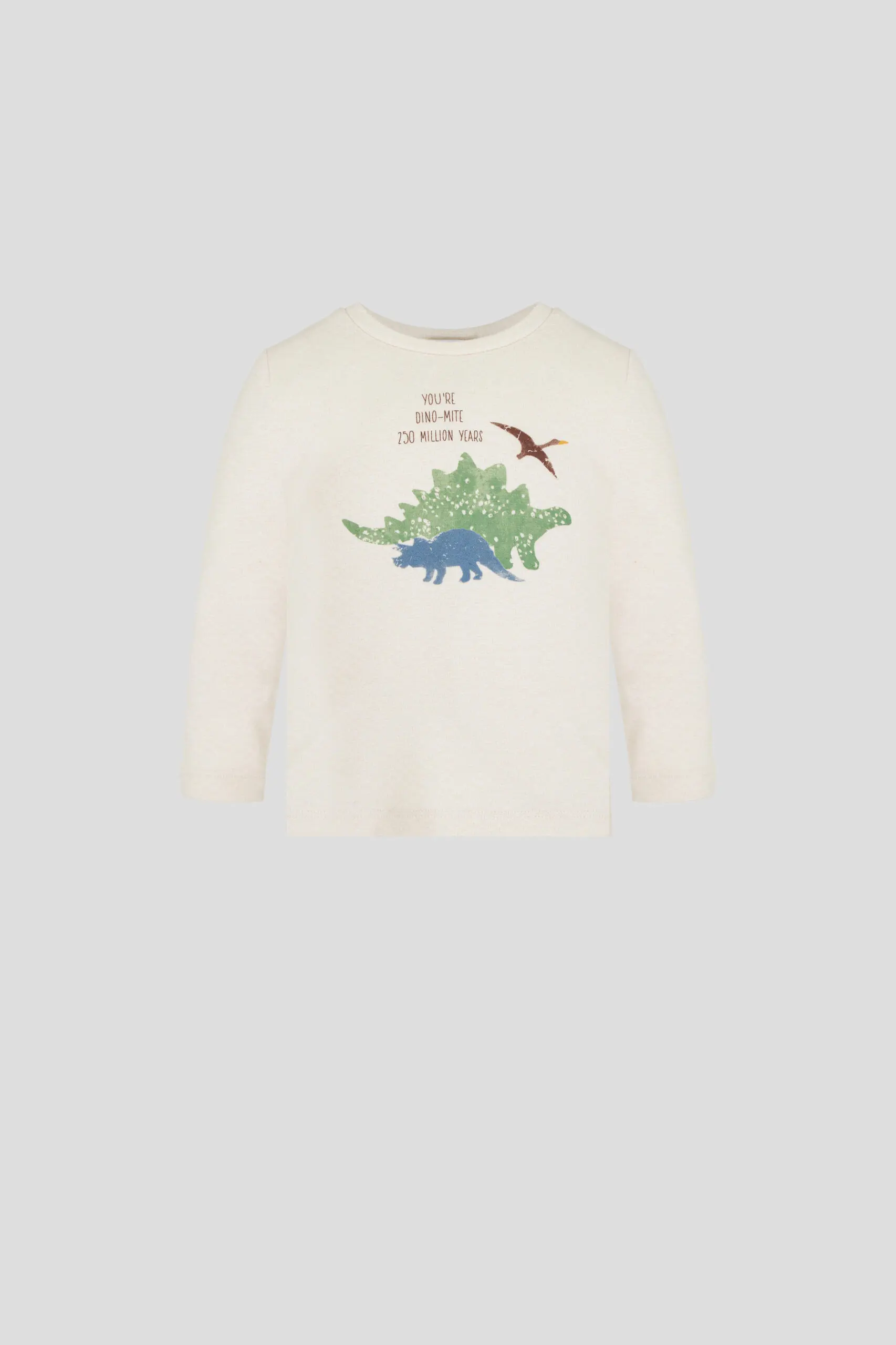 Лонгслив с принтом выполнен в бежевом цвете. Модель свободного кроя имеет застежку на кнопки, расположенную на плечевом шве, ускоряет процесс переодевания малыша. Украшает лонгслив дизайнерский принт ... в виде динозавра.