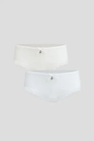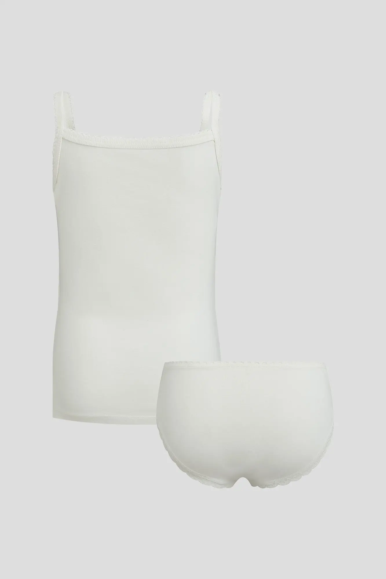 Комплект нижнего белья для девочки цвета экрю. Майка облегающего кроя на узких бретельках с бантиком и кружевом по верхнему краю и трусиками с классической посадкой, с ... широким бочком, бантиком и отделкой кружевом по краям. Комплект выполнен из высококачественного хлопка с добавлением эластана, который улучшает посадку майки и трусиков на фигуре ребенка и снижает риск деформации при стирке.