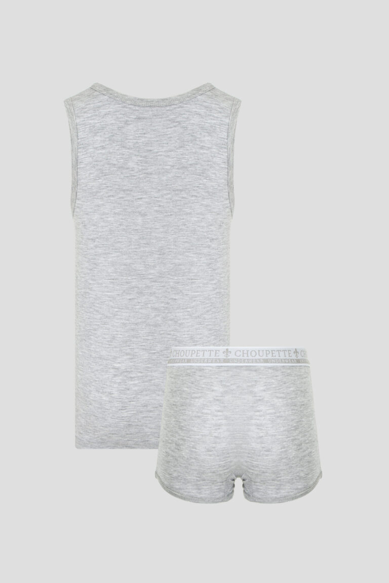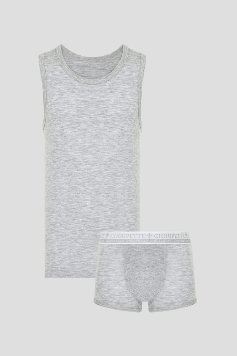 Комплект нижнего белья серого цвета для мальчика. Майка классического кроя, прилегающего силуэта и трусы-боксеры повторяющие контуры тела с эластичным поясом с логотипом Choupette. Комплект выполнен из ... микромодала с добавлением эластана. Микромодал это ткань, получаемая из древесной целлюлозы букового дерева. Ткань очень гладкая, мягкая и приятная на ощупь. Микромодал гипоаллергенен, "дышит", впитывает и испаряет влагу. Материал не деформируется и не линяет после стирки. Даже после месяцев носки и стирки детское нижнее бельё остаётся таким же мягким, гладким и уютным как в первый раз.