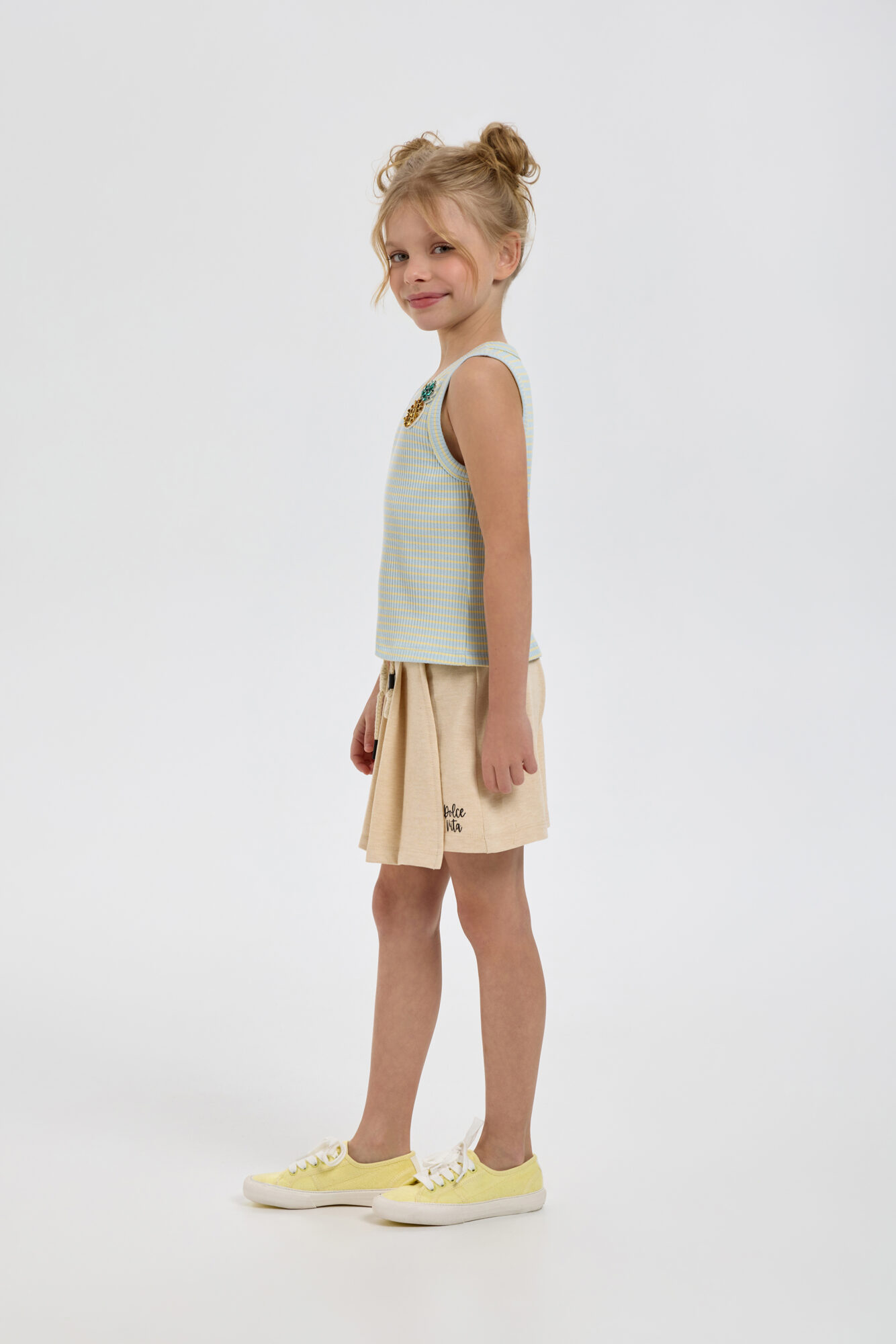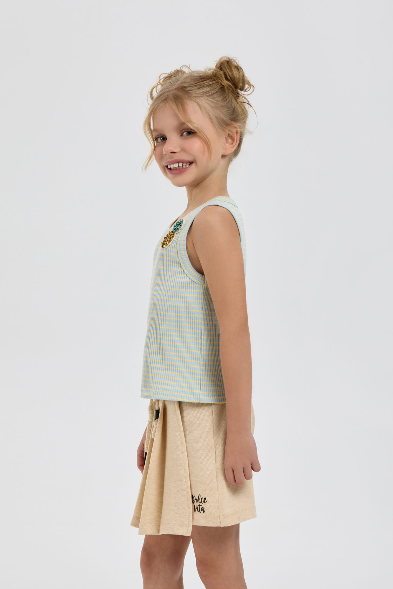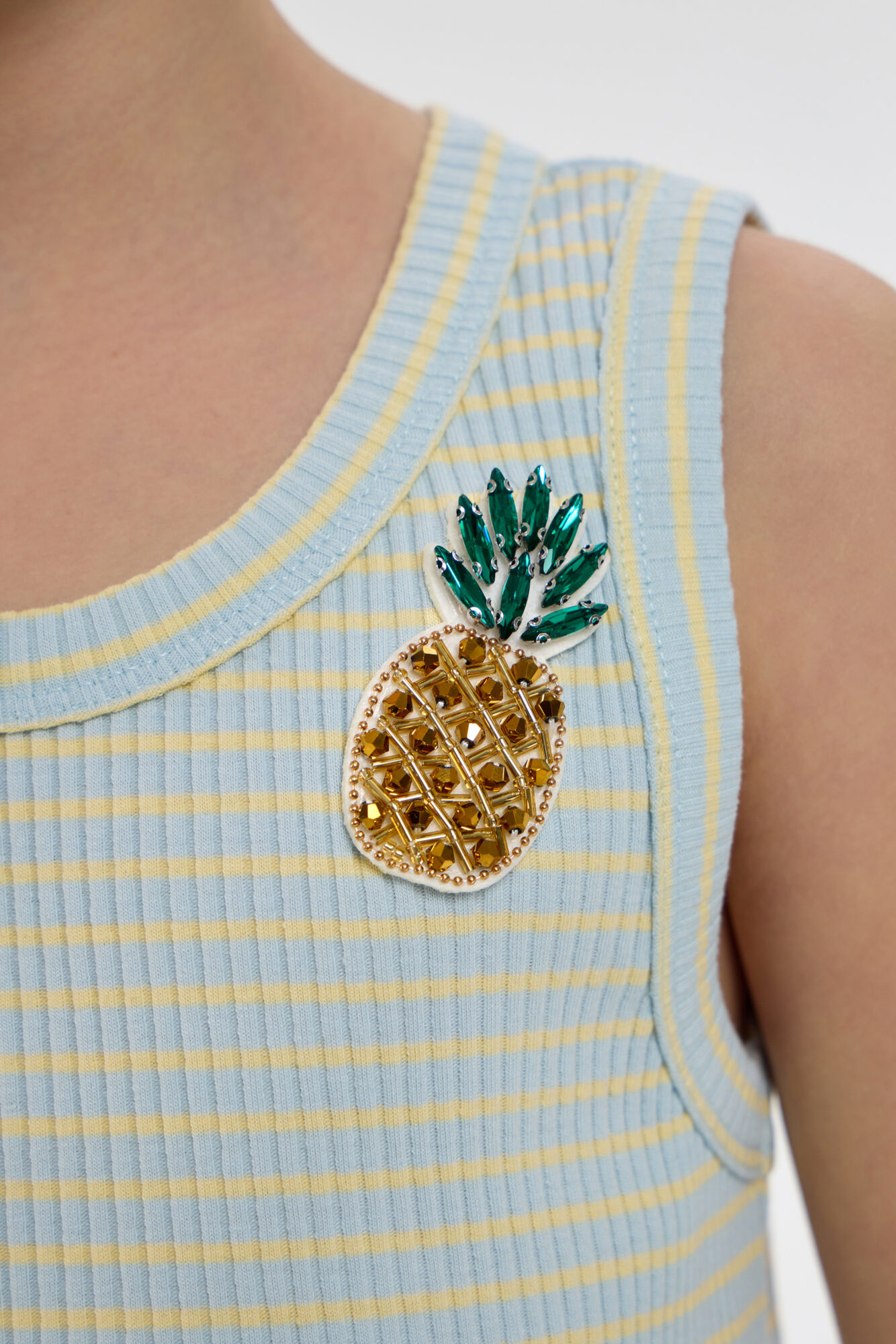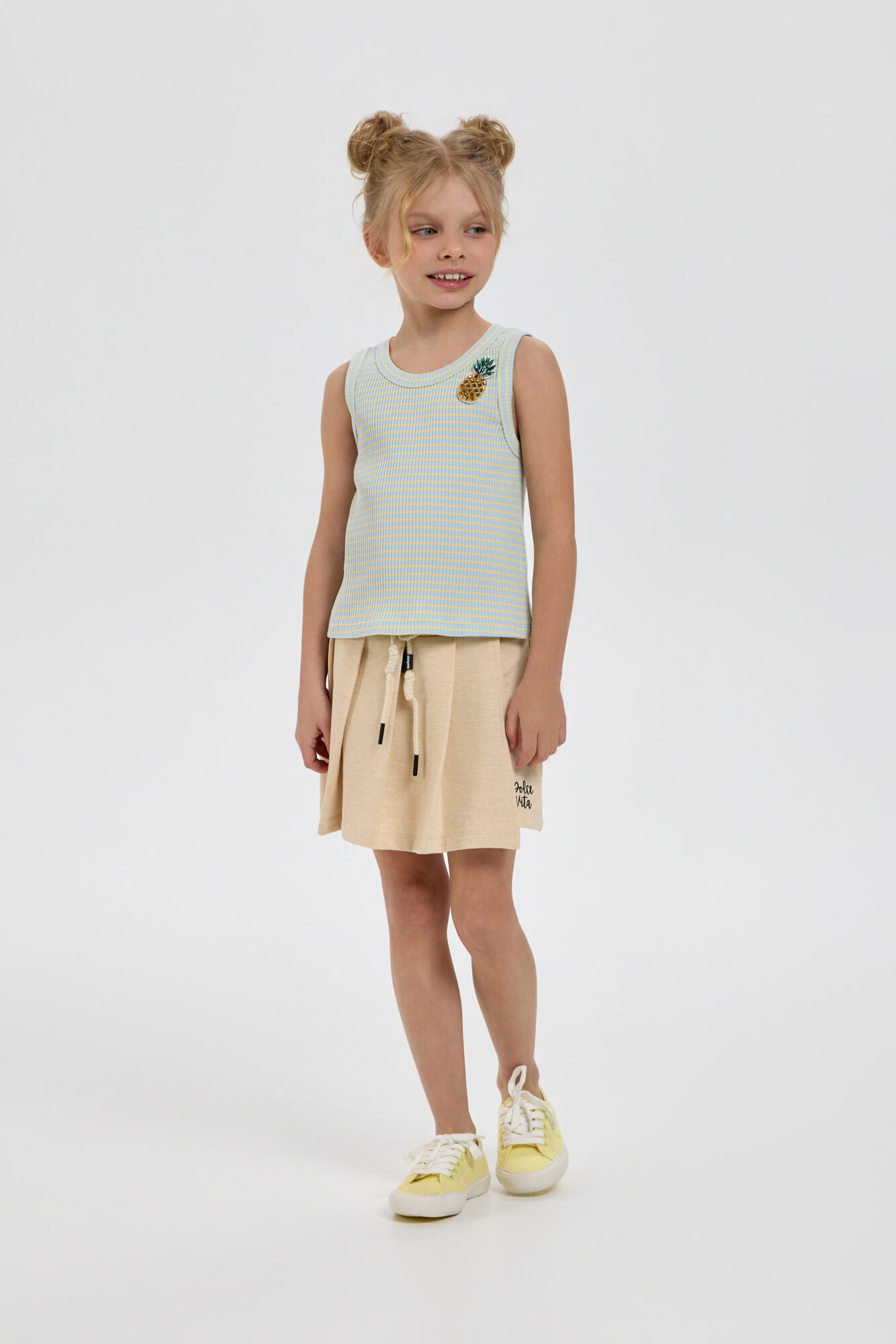 Топ с декоративными элементами для девочки является обязательной основой летнего образа. Изделие свободного силуэта на модных бретелях выполнено из рельефного хлопкового трикотажа. Круглый вырез горловины и ... проймы аккуратно обработаны контрастной окантовкой. Броское украшение в виде ананаса создает яркий акцент и делает модель особенно запоминающейся. Эта вещь идеально комбинируется с юбками, шортами, джинсами или брюками. Образ можно дополнить модными кроссовками или яркими босоножками.