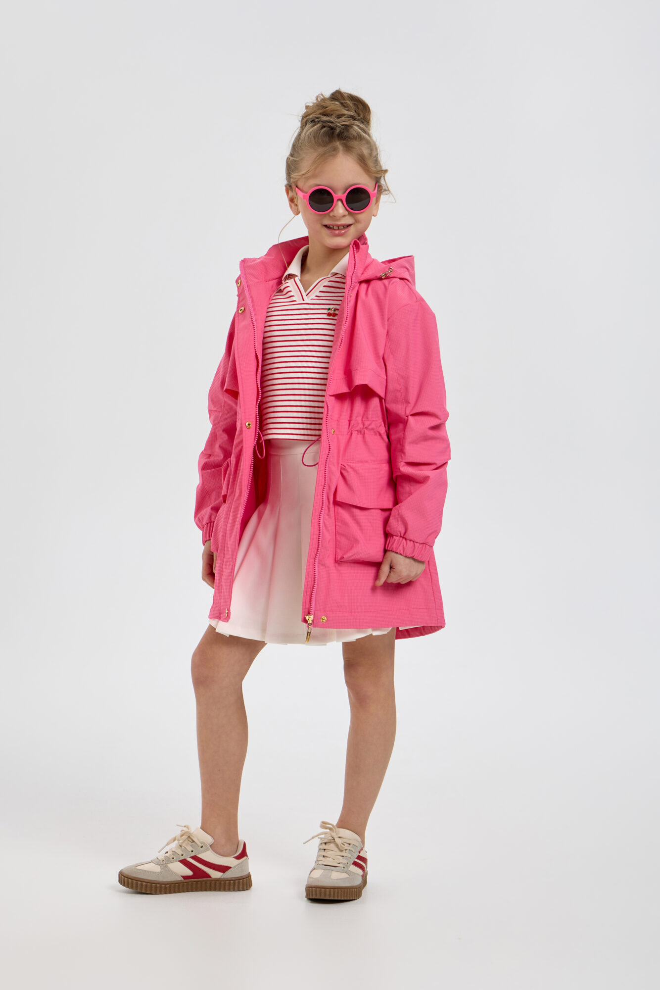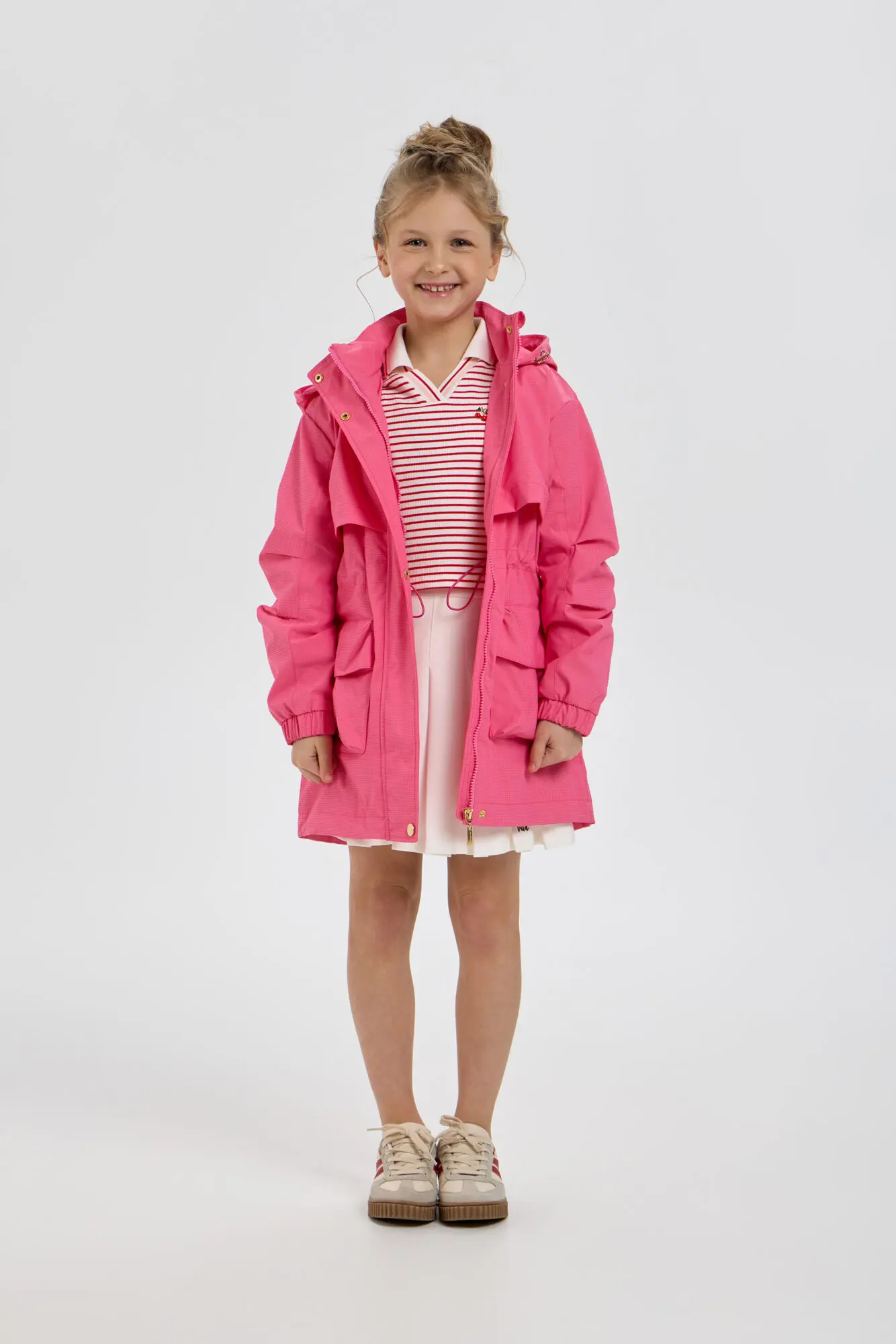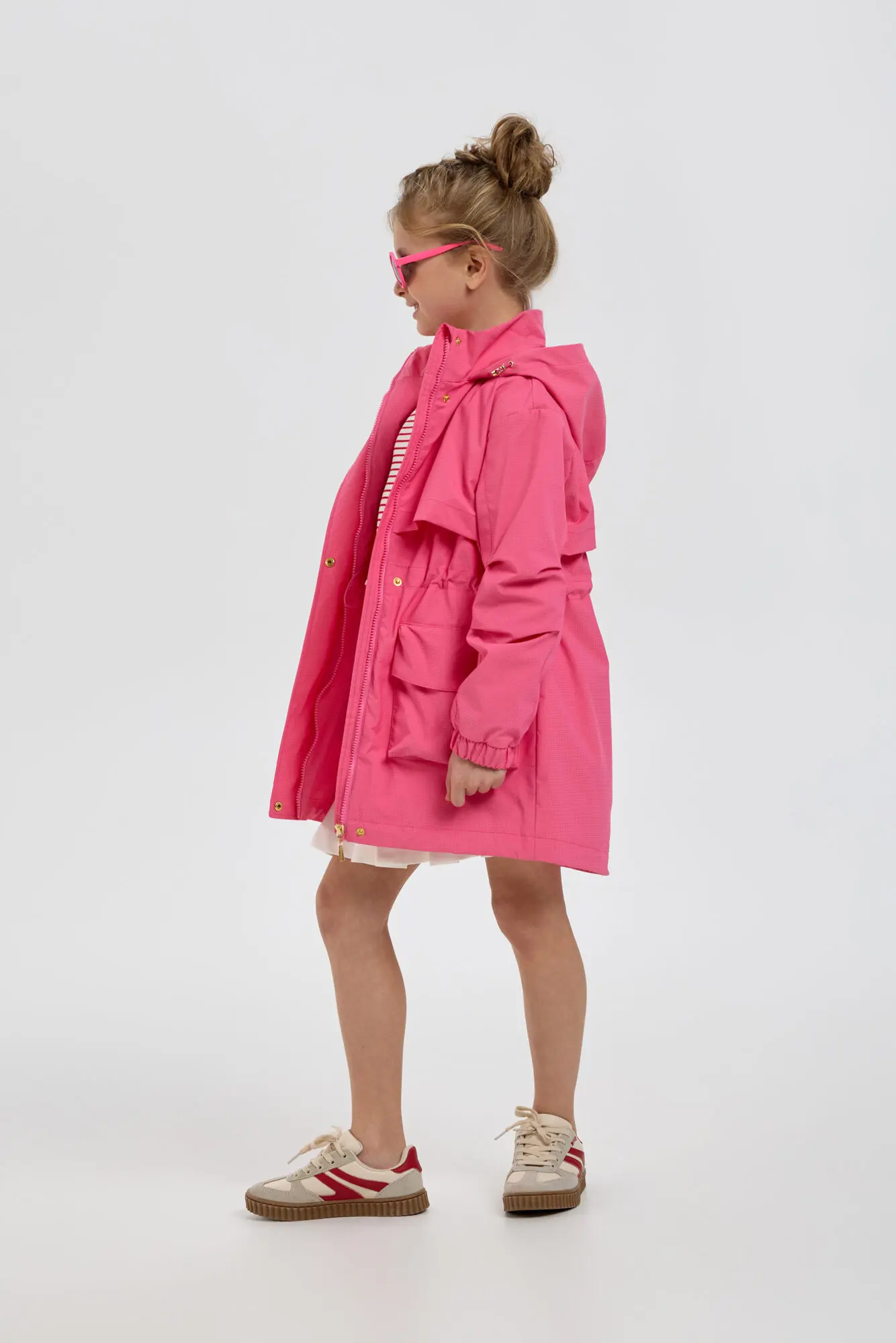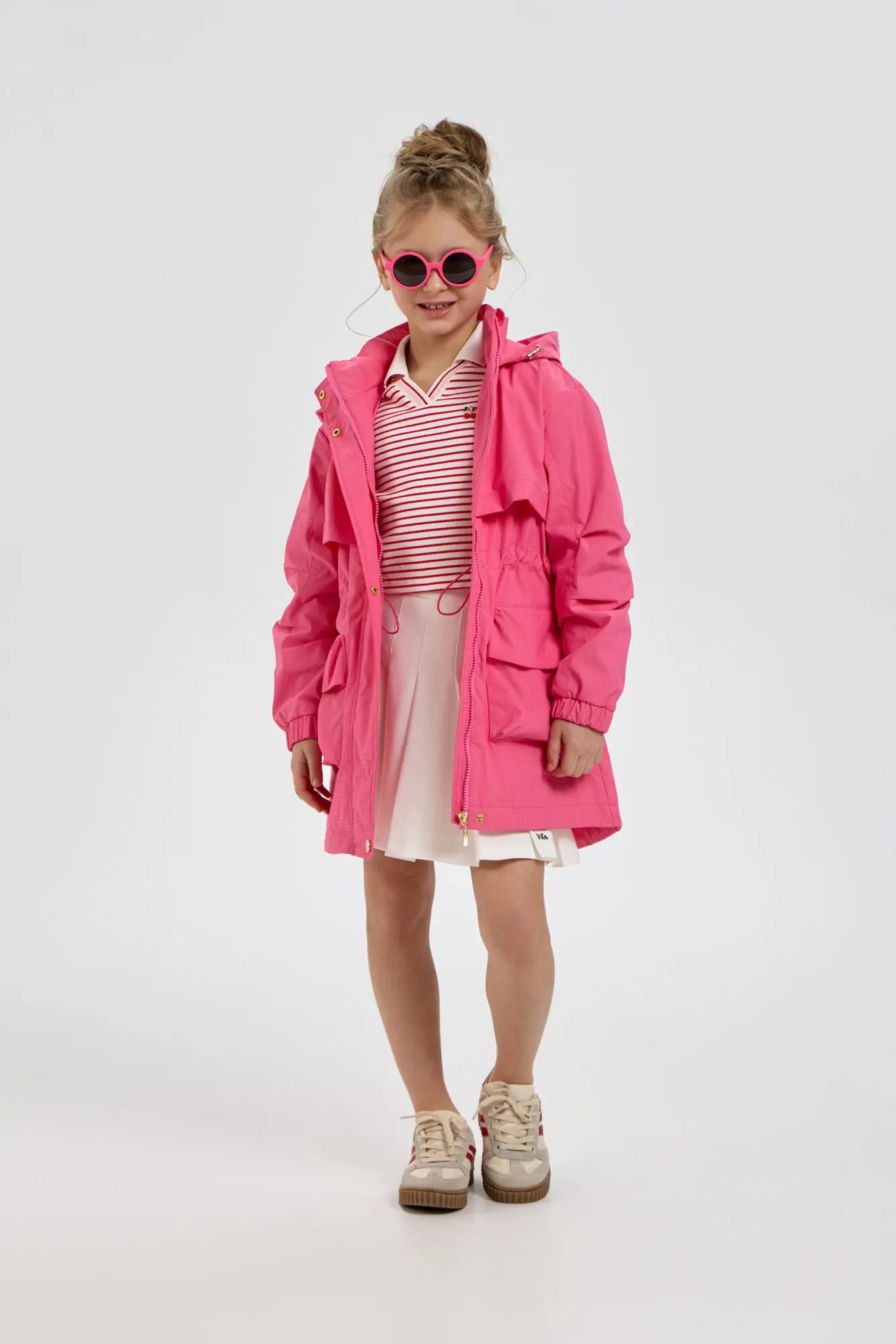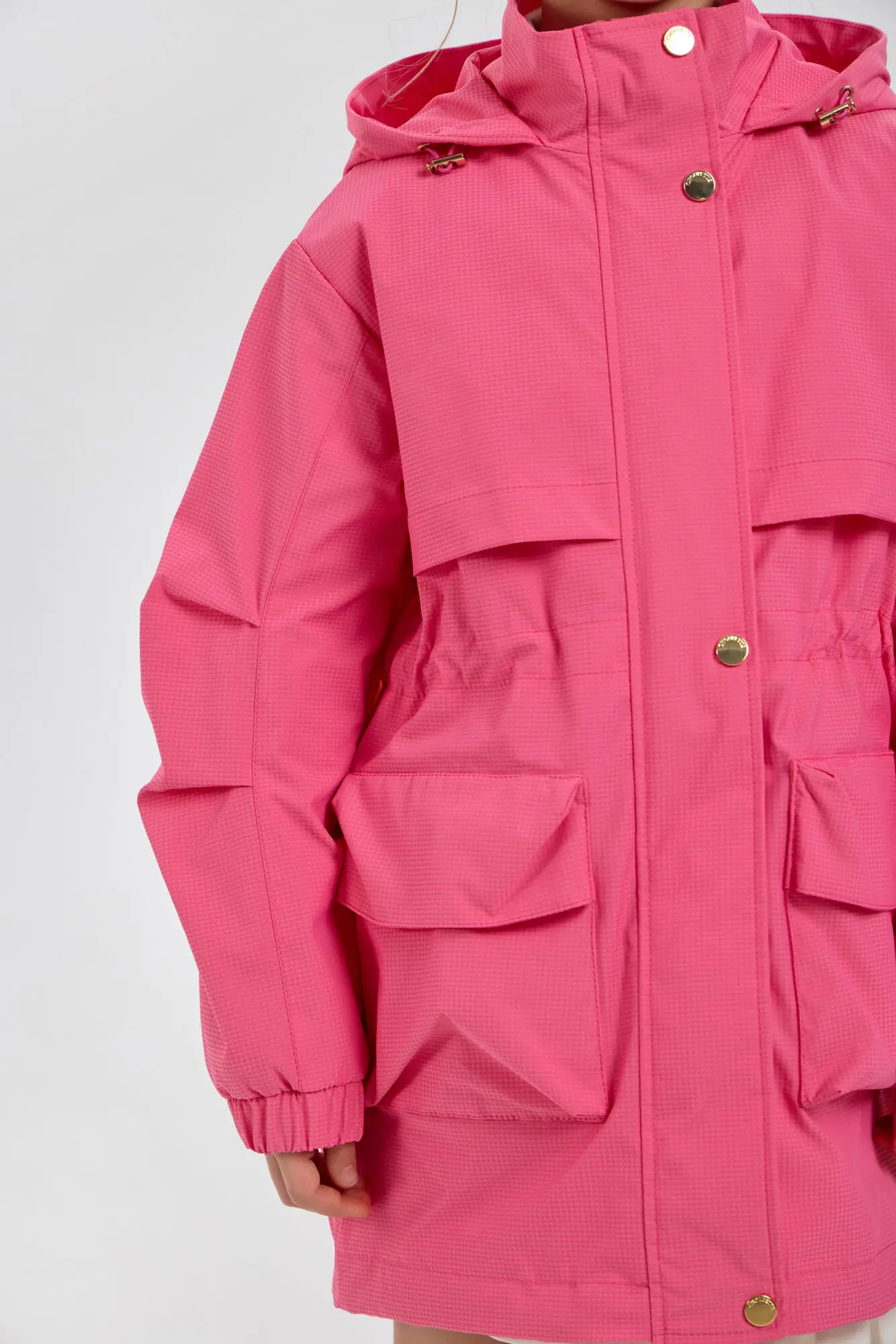 Стильный плащ в насыщенном ягодном цвете станет прекрасным дополнением к весеннему гардеробу девочки. Он выполнен в свободном силуэте и застегивается на удобную комбинацию молнии и пуговиц. ... Практичные элементы включают просторный капюшон и вместительные карманы. Внутренняя кулиска со стопором дает возможность регулировать объем под индивидуальные особенности ребенка. Универсальный плащ легко сочетается с различными элементами детской одежды.