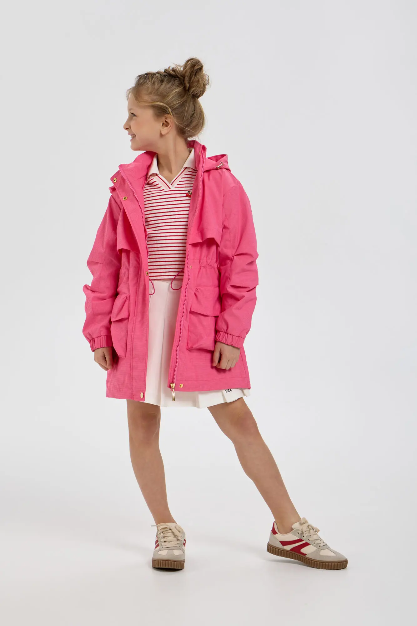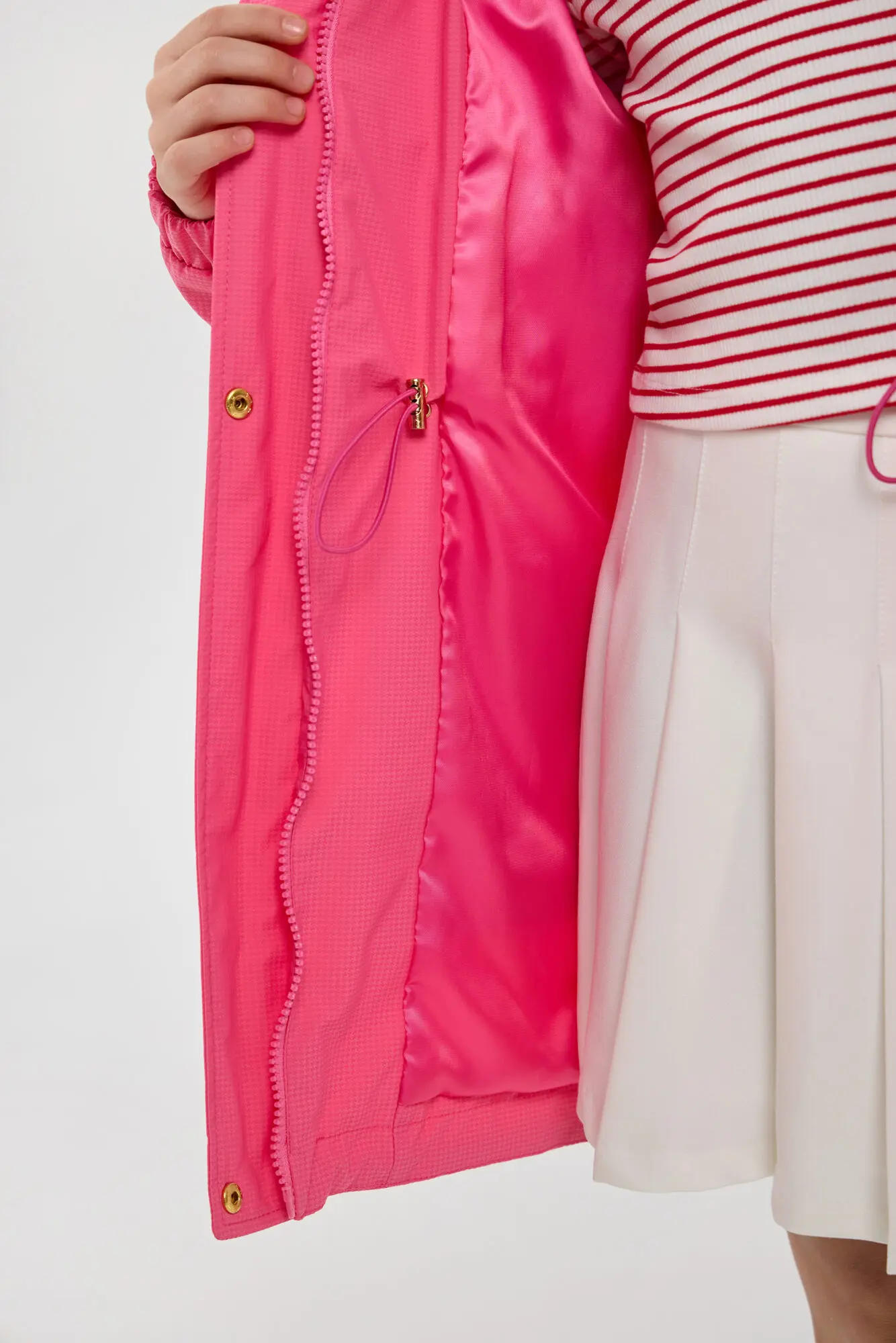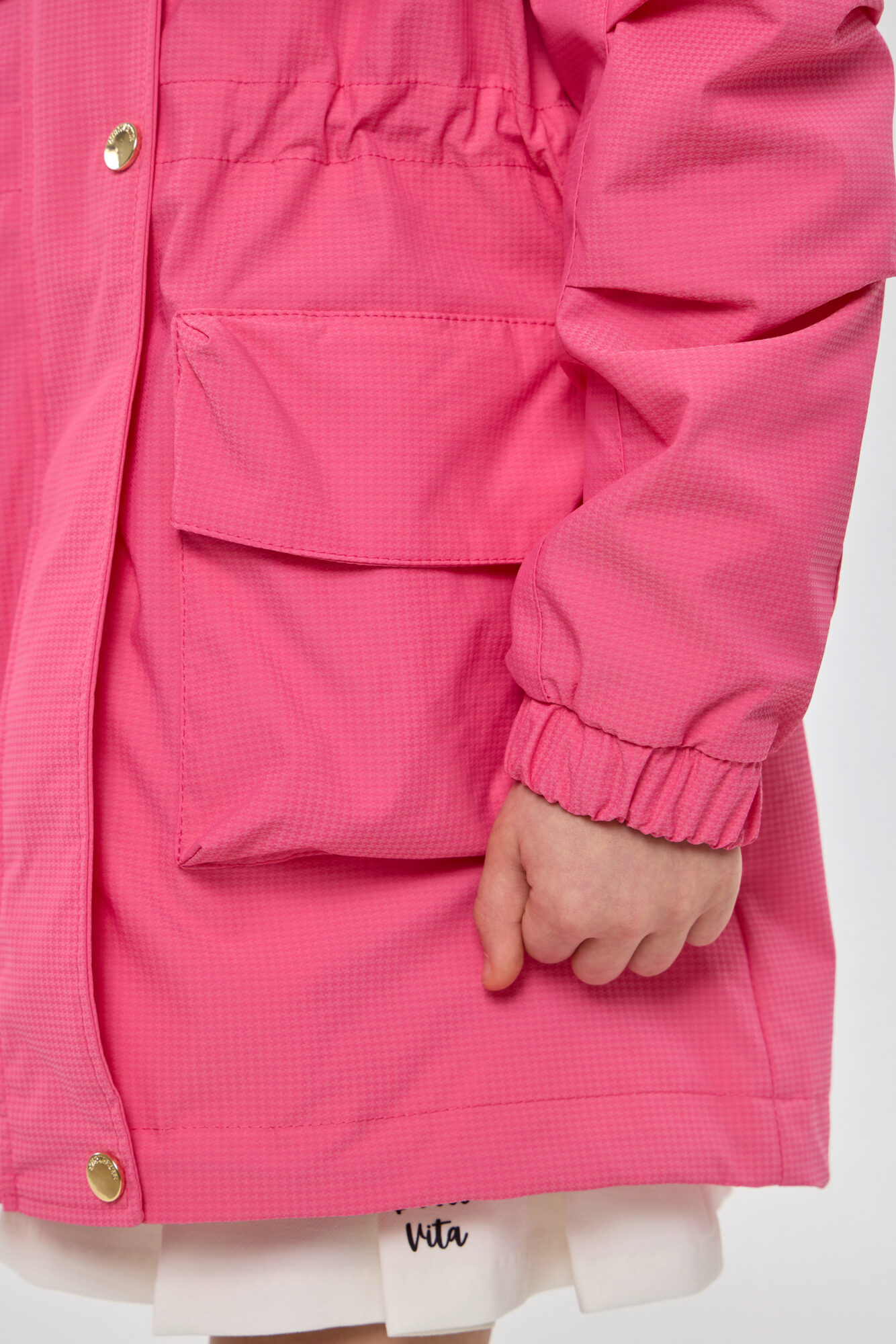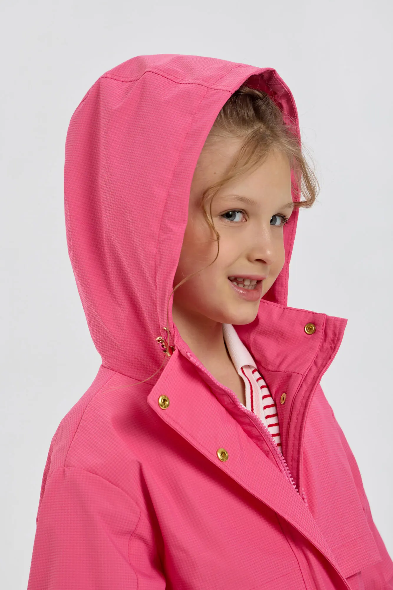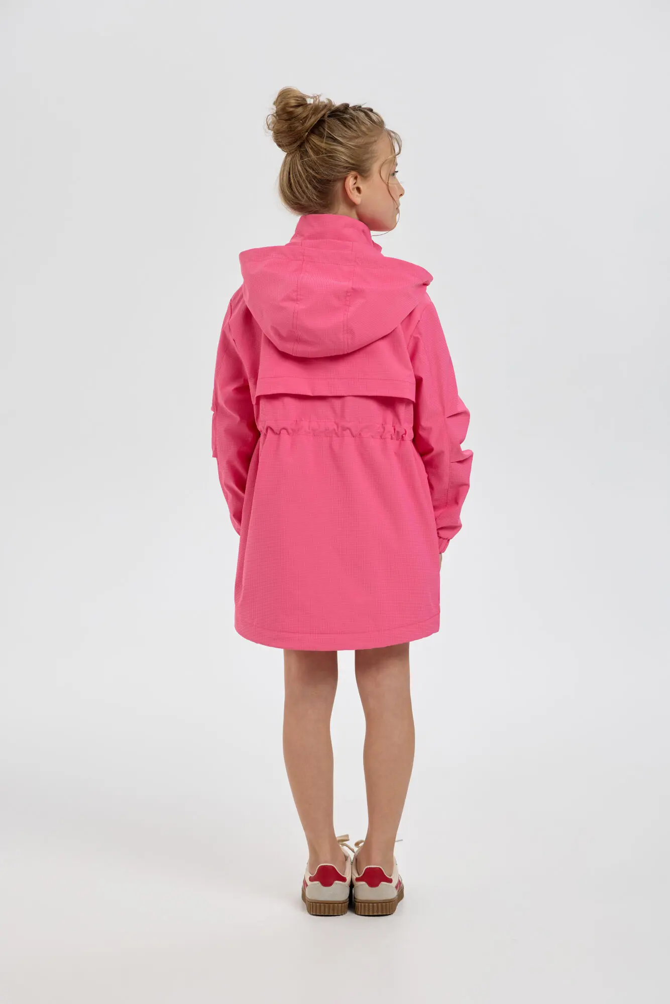 Стильный плащ в насыщенном ягодном цвете станет прекрасным дополнением к весеннему гардеробу девочки. Он выполнен в свободном силуэте и застегивается на удобную комбинацию молнии и пуговиц. ... Практичные элементы включают просторный капюшон и вместительные карманы. Внутренняя кулиска со стопором дает возможность регулировать объем под индивидуальные особенности ребенка. Универсальный плащ легко сочетается с различными элементами детской одежды.