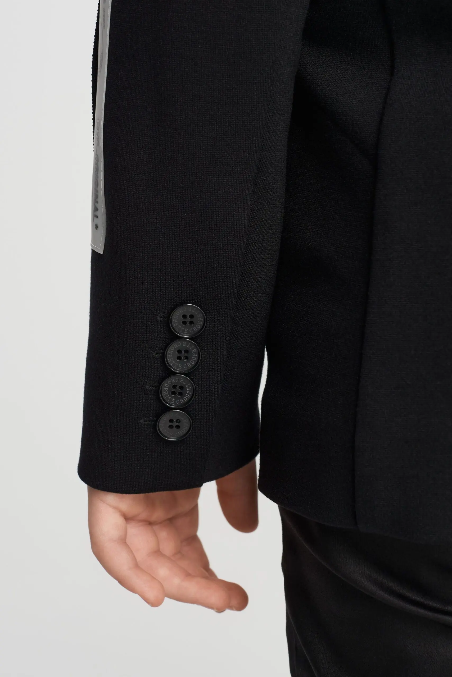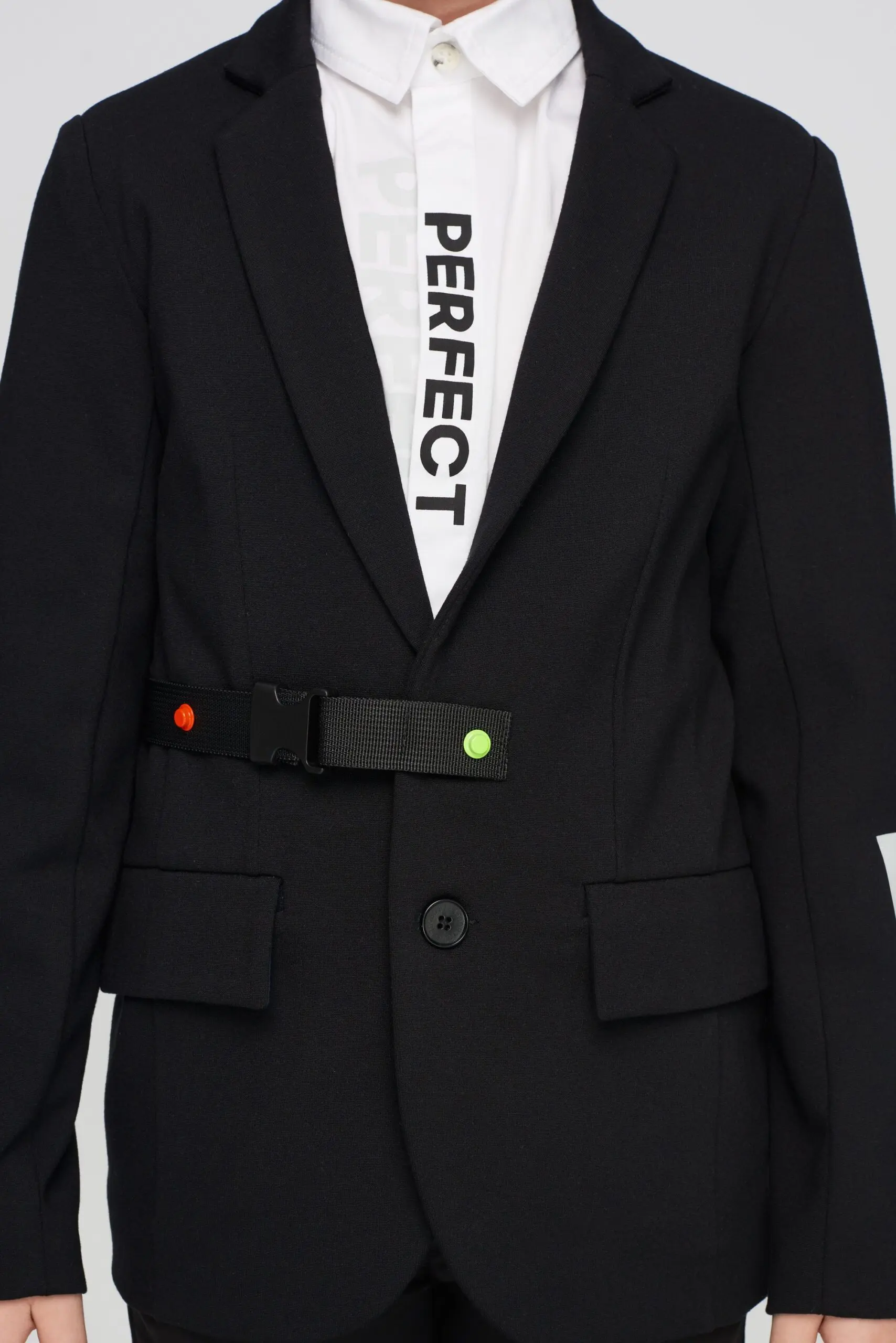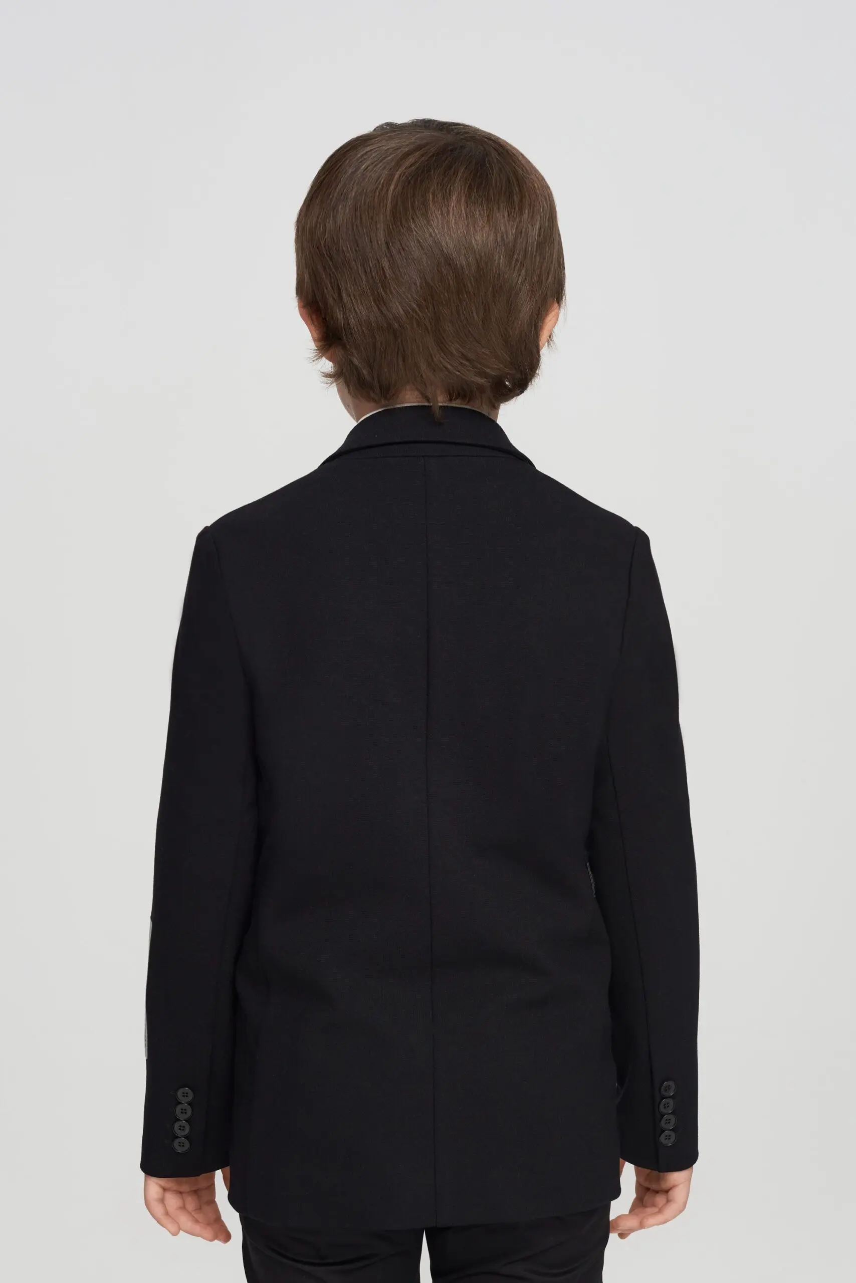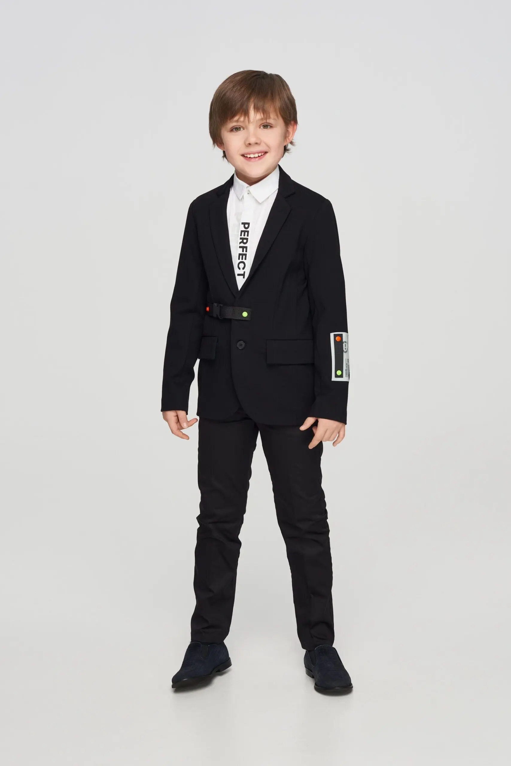 Нарядный пиджак из джерси для мальчика — это идеальный выбор для особых случаев, когда необходимо выглядеть элегантно и стильно. Полуприлегающий силуэт, V-образный вырез с отложным воротником ... придает образу строгий вид. Два кармана с клапанами не только добавляют функциональности, но и служат стильным акцентом, делая пиджак более универсальным. Он прекрасно подходит как для торжественных мероприятий, так и для повседневной носки. Добавление дизайнерского ремня и стильной нашивки на рукаве делает эту модель поистине уникальной, выделяя её среди других нарядных пиджаков. Черный цвет — это классика, которая никогда не выйдет из моды. Он легко комбинируется как с классическими брюками, так и с джинсами, что позволяет создать множество различных образов.