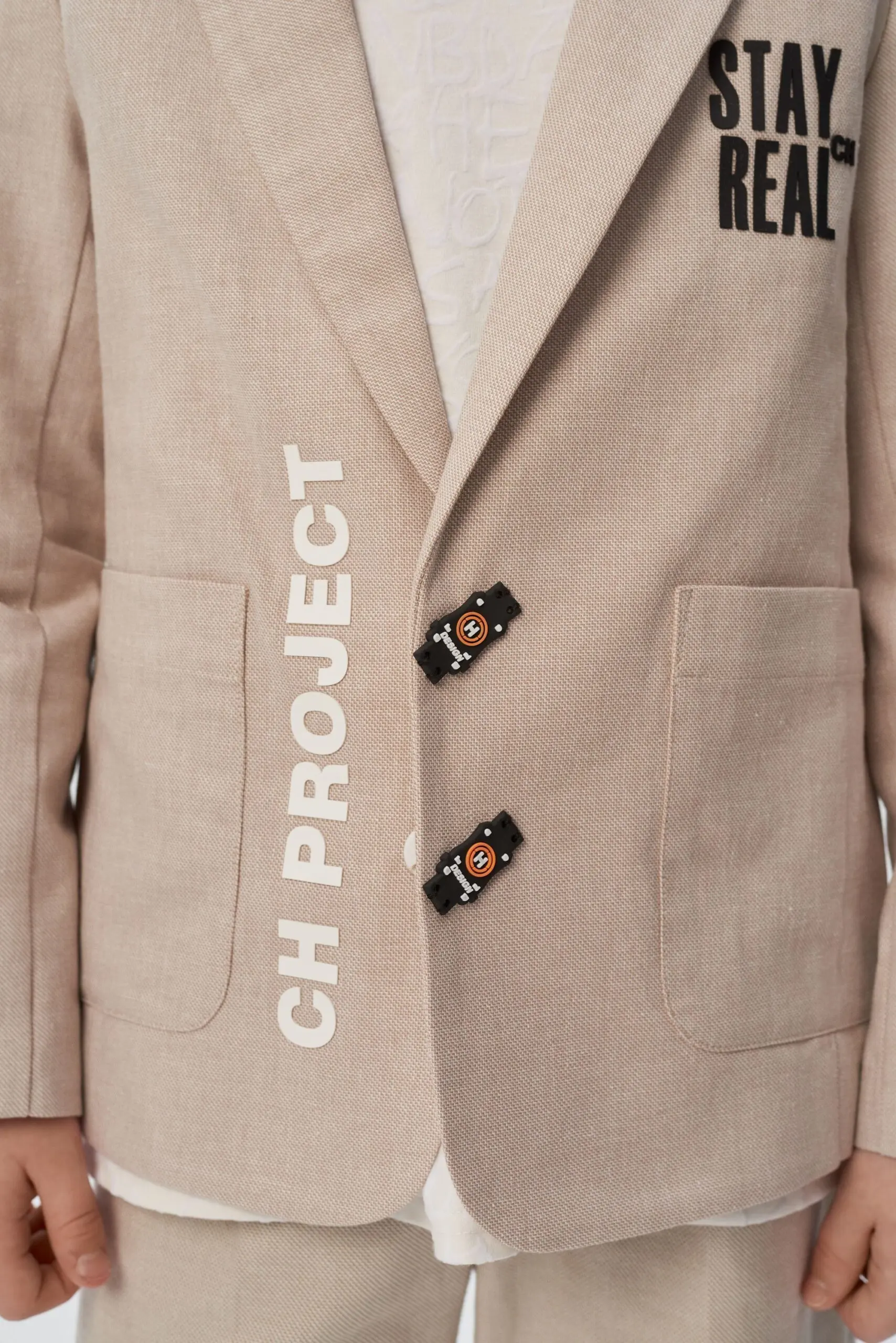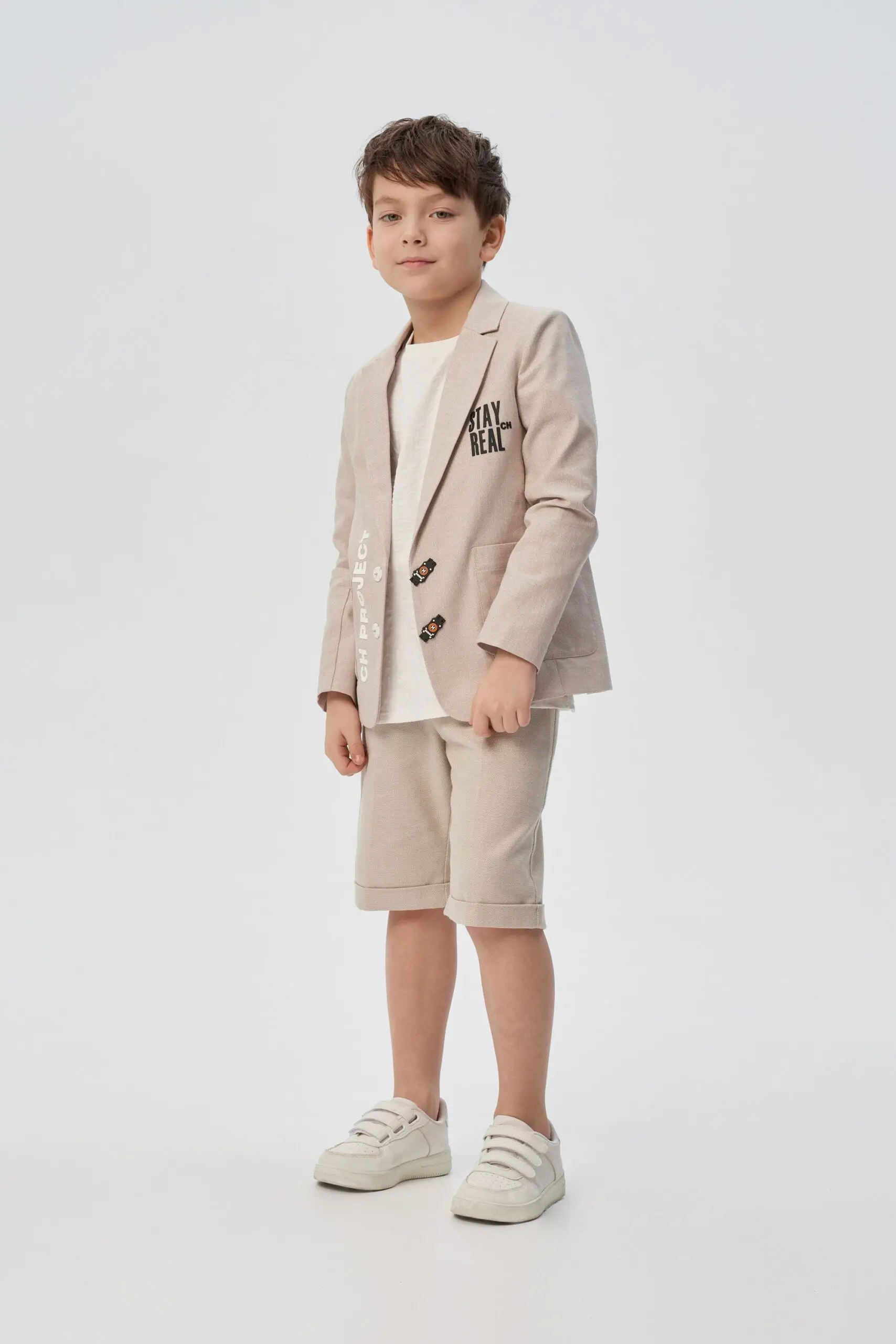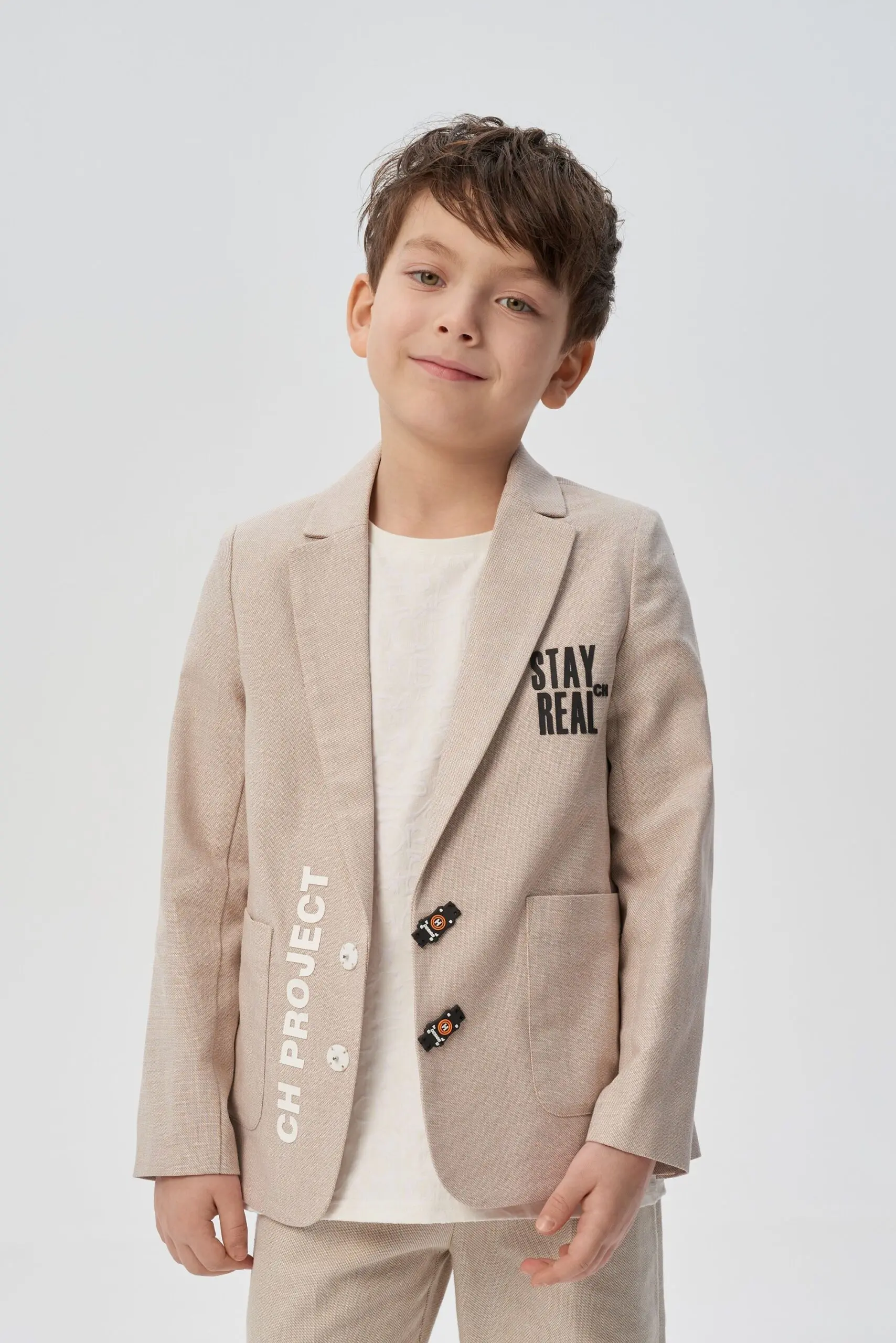Стильный однобортный пиджак для мальчика — незаменимая вещь на случай торжественных мероприятий в школе или детском саду. Великолепная модель полуприлегающего силуэта выполнена из плотной хлопковой ткани ... благородного песочного цвета. Застежка на две черные пуговицы необычной формы. Спереди два накладных кармана. Контрастные буквенные принты на обеих полочках вносят в дизайн изделия оттенок непринужденности.