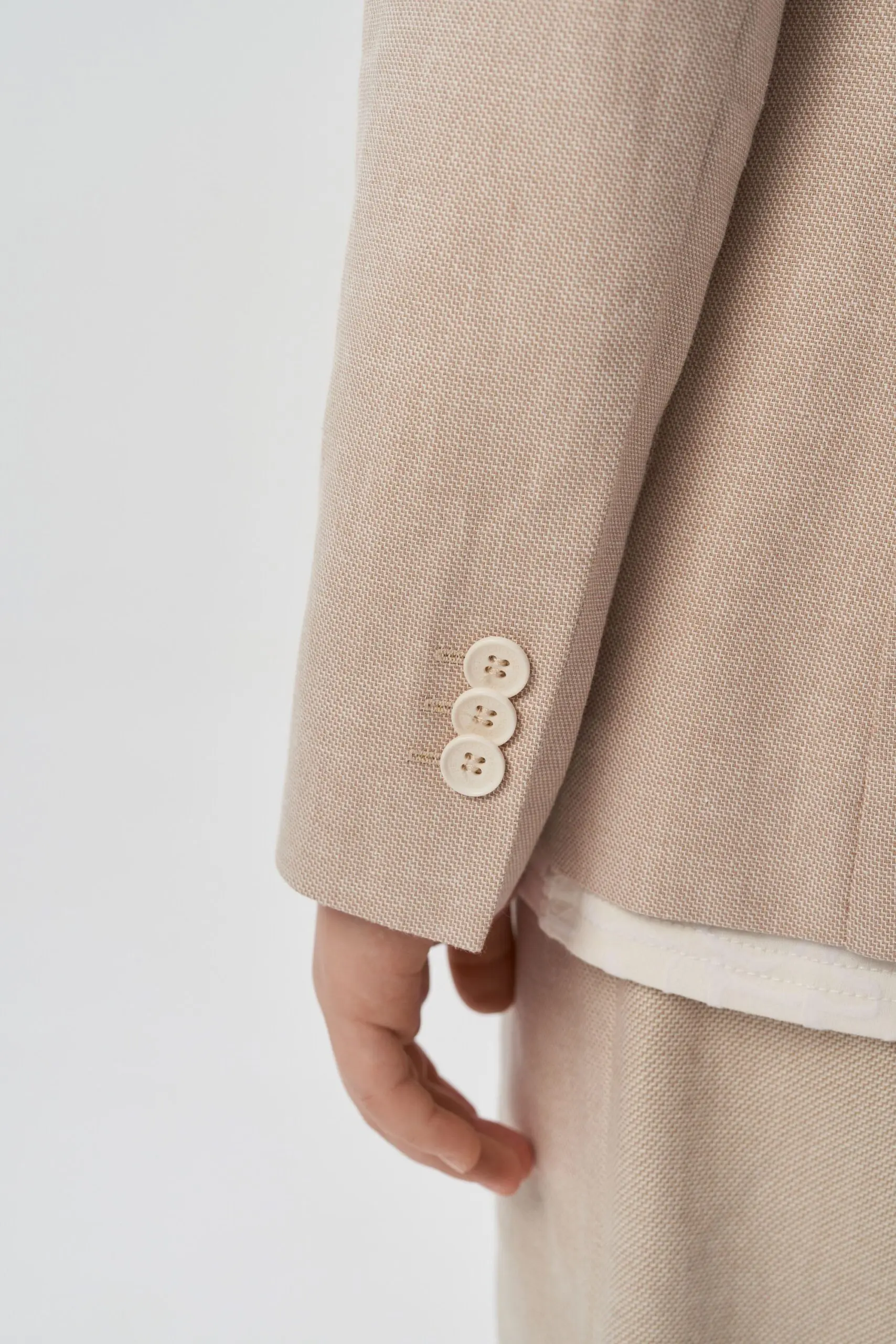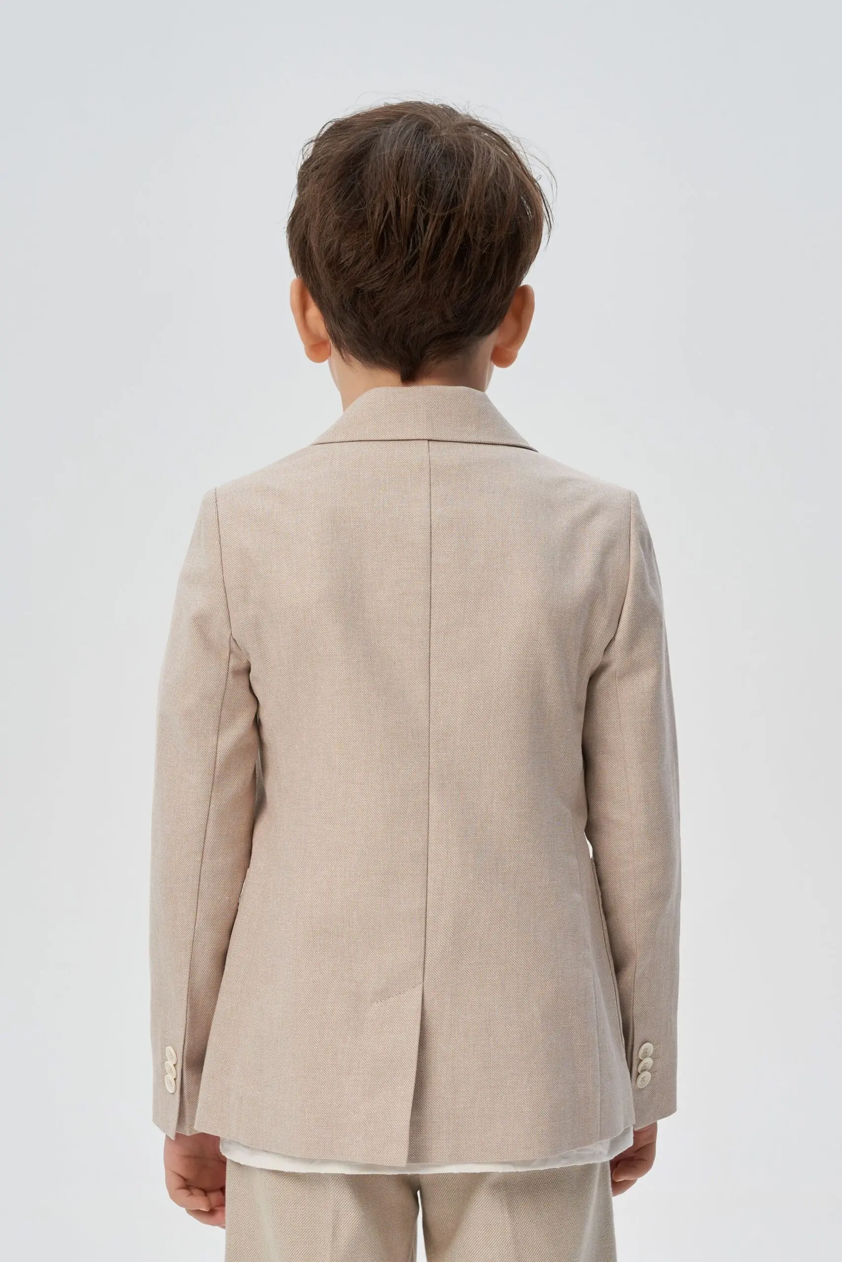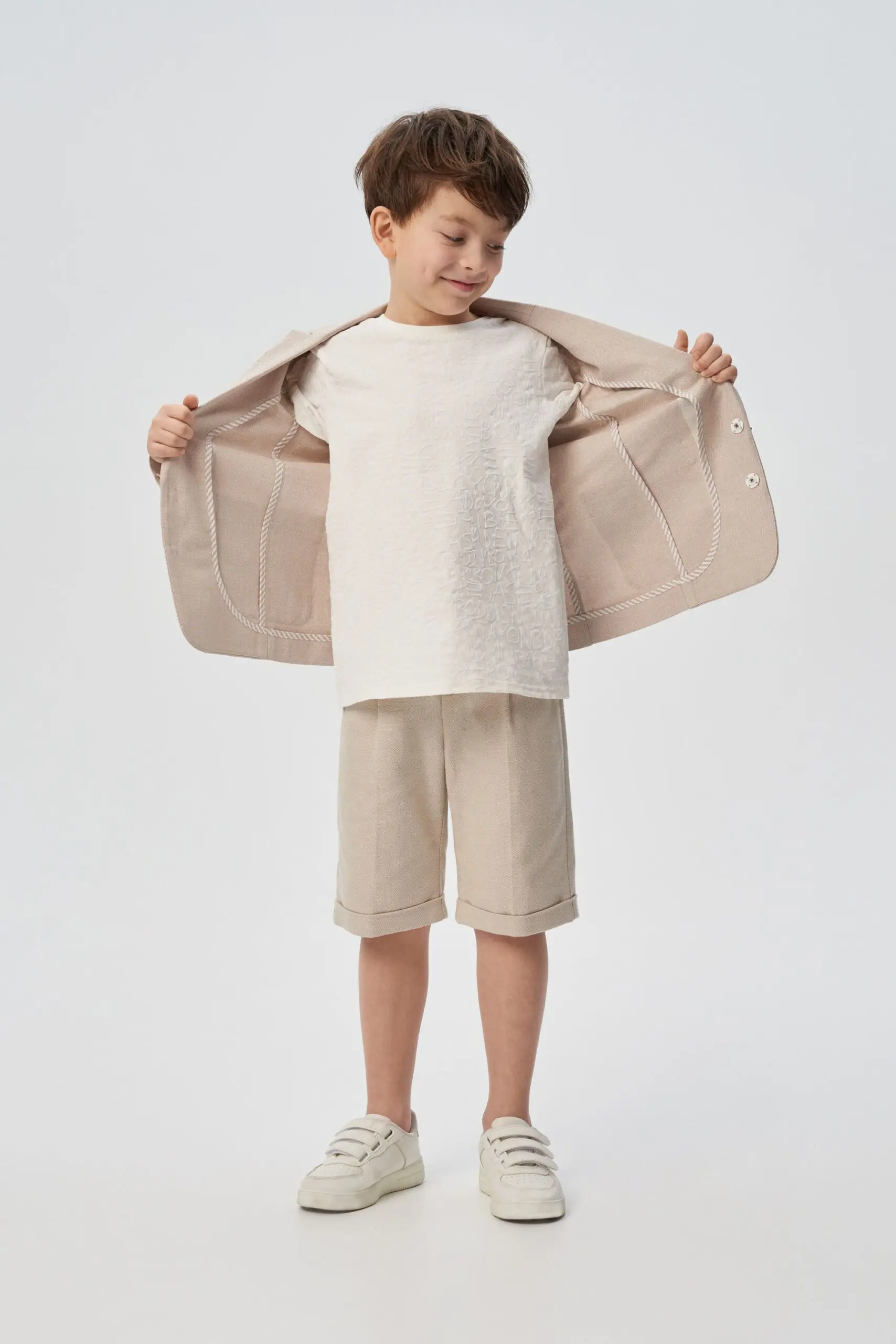 Стильный однобортный пиджак для мальчика — незаменимая вещь на случай торжественных мероприятий в школе или детском саду. Великолепная модель полуприлегающего силуэта выполнена из плотной хлопковой ткани ... благородного песочного цвета. Застежка на две черные пуговицы необычной формы. Спереди два накладных кармана. Контрастные буквенные принты на обеих полочках вносят в дизайн изделия оттенок непринужденности.