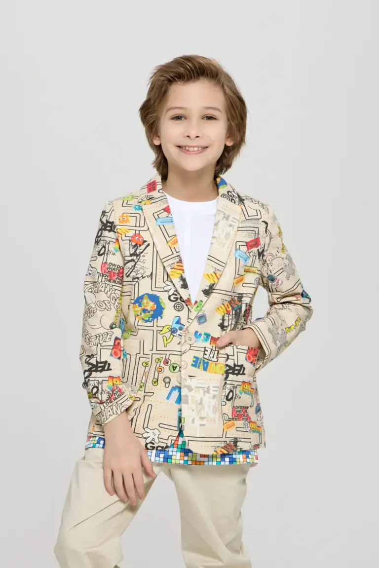 Пиджак для мальчика выполнен из мягкого и приятного на ощупь материала. Его украшает уникальный дизайнерский рисунок, превосходно выделяющийся на фоне песочного оттенка. Пиджак характеризуется модным и ... актуальным фасоном. Благодаря комфортному пошиву, он не сковывает движений, что важно для энергичных ребят. Пиджак подойдет как для повседневных выходов, так и для праздничных случаев. Эта модель станет элегантным акцентом в детском гардеробе.