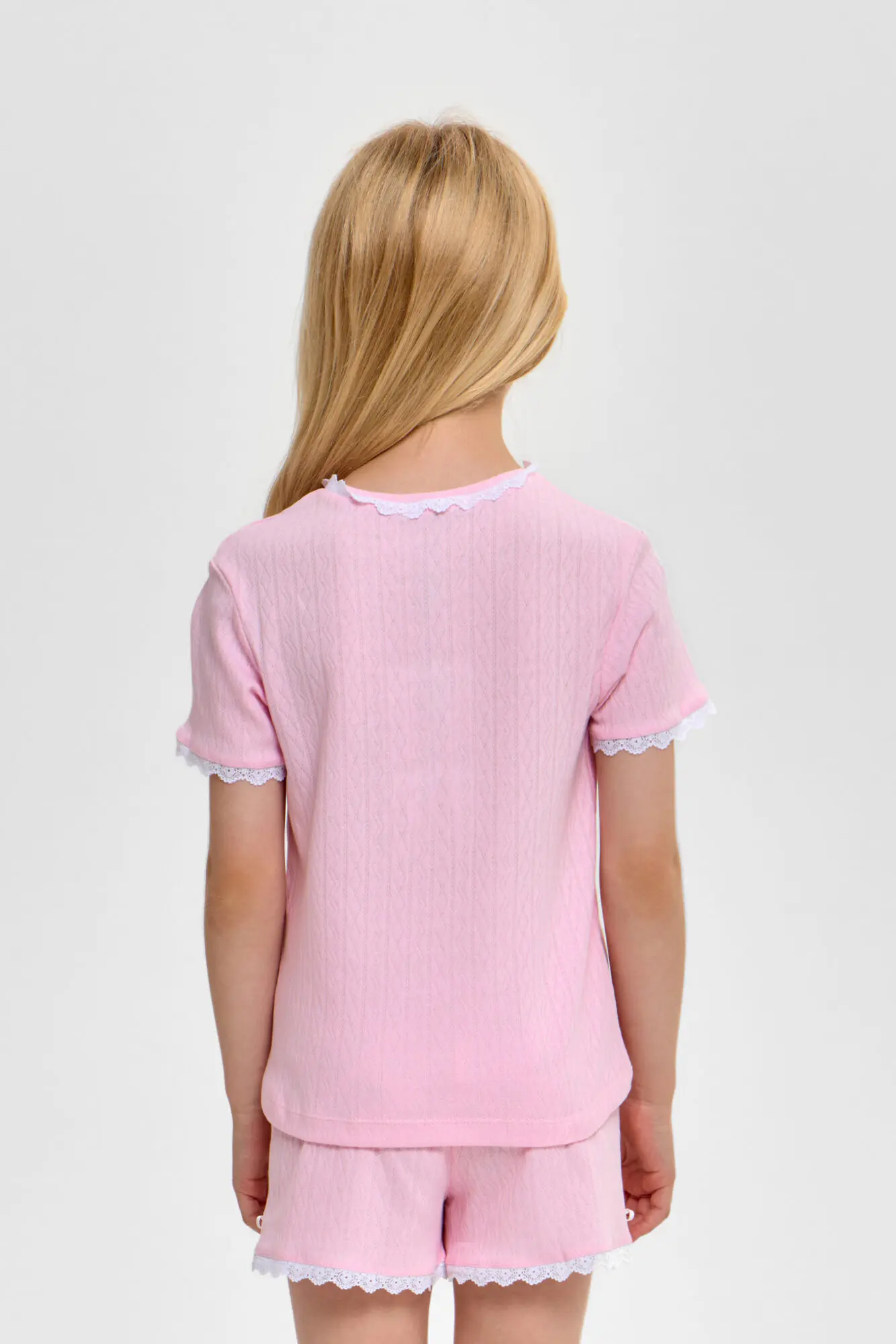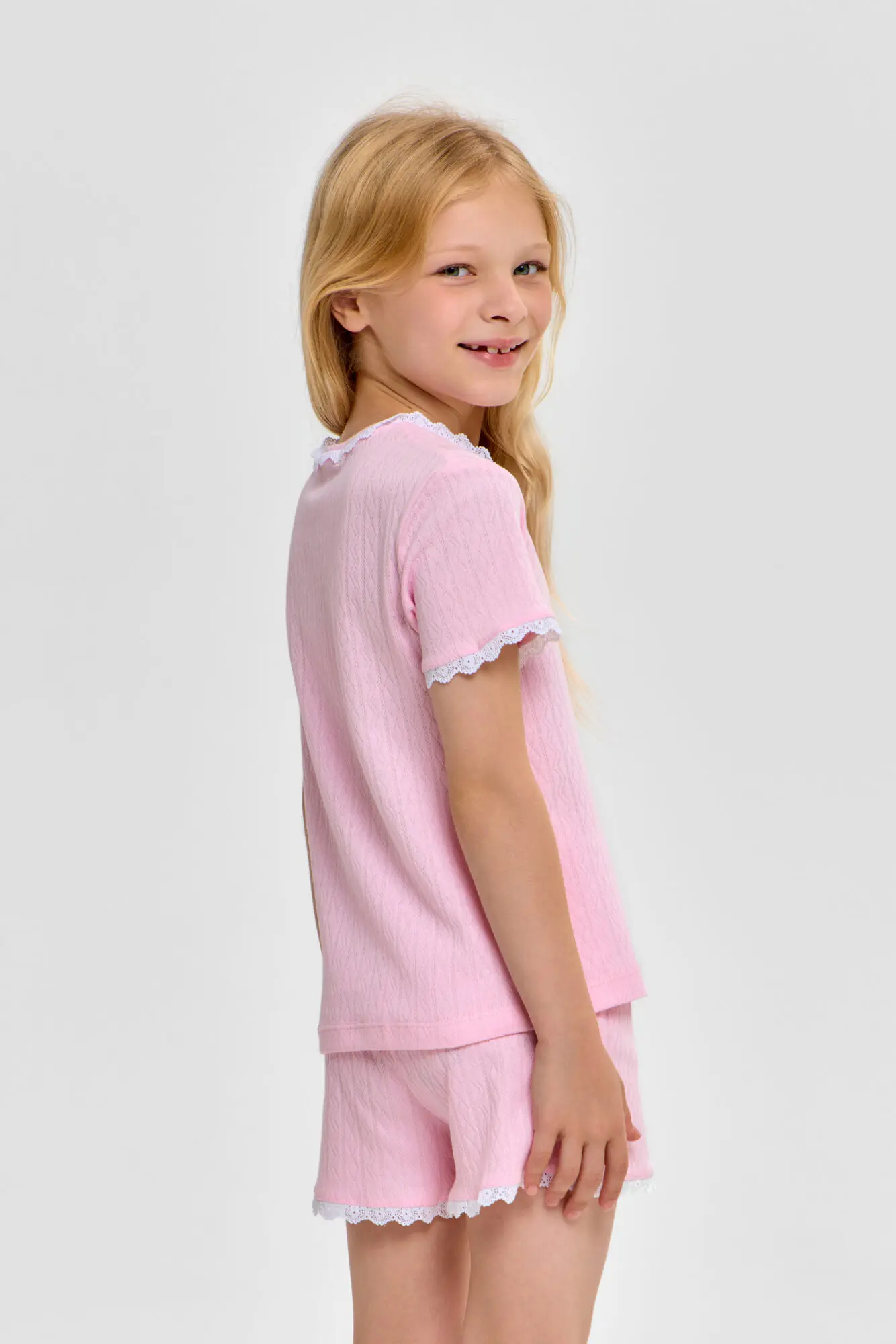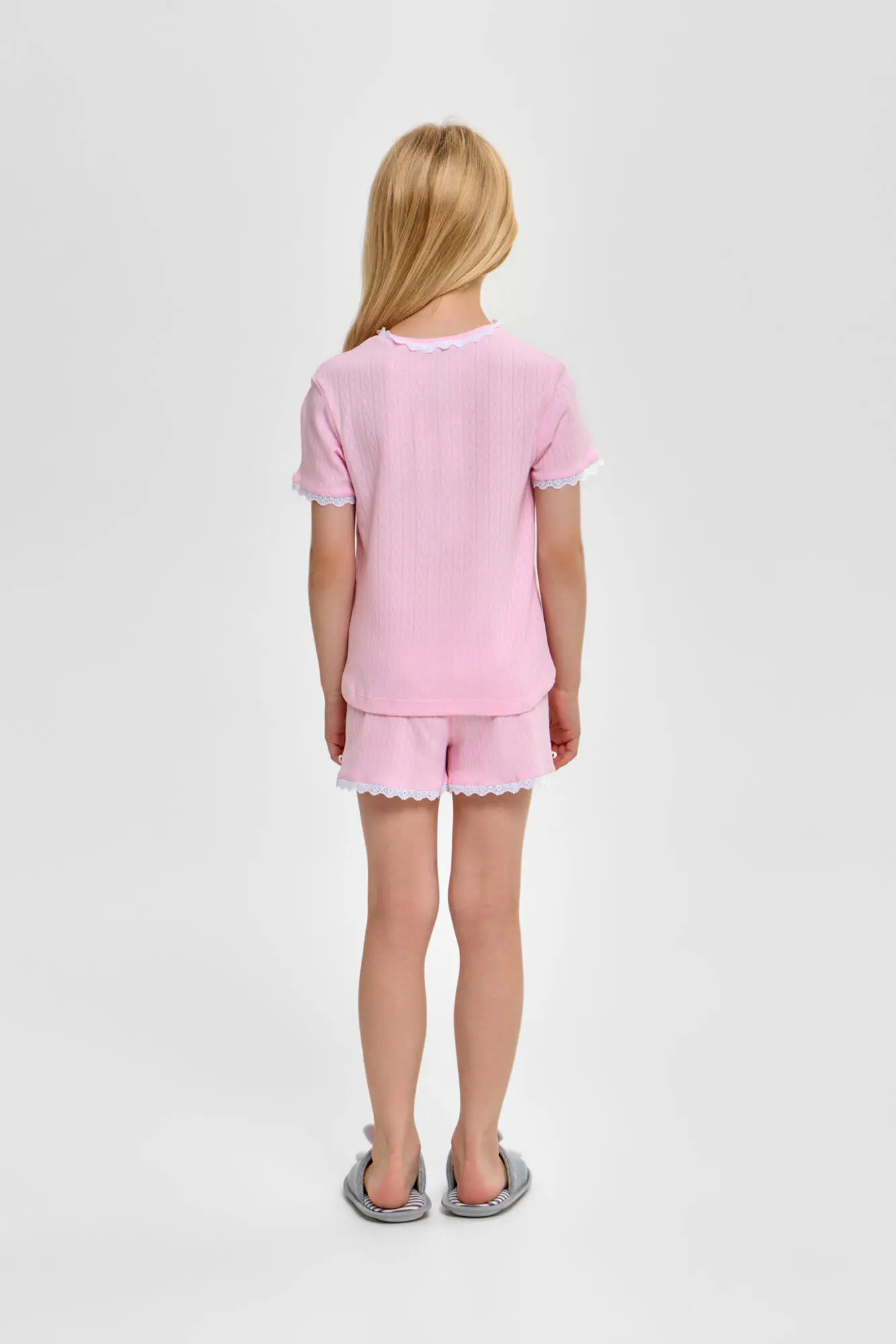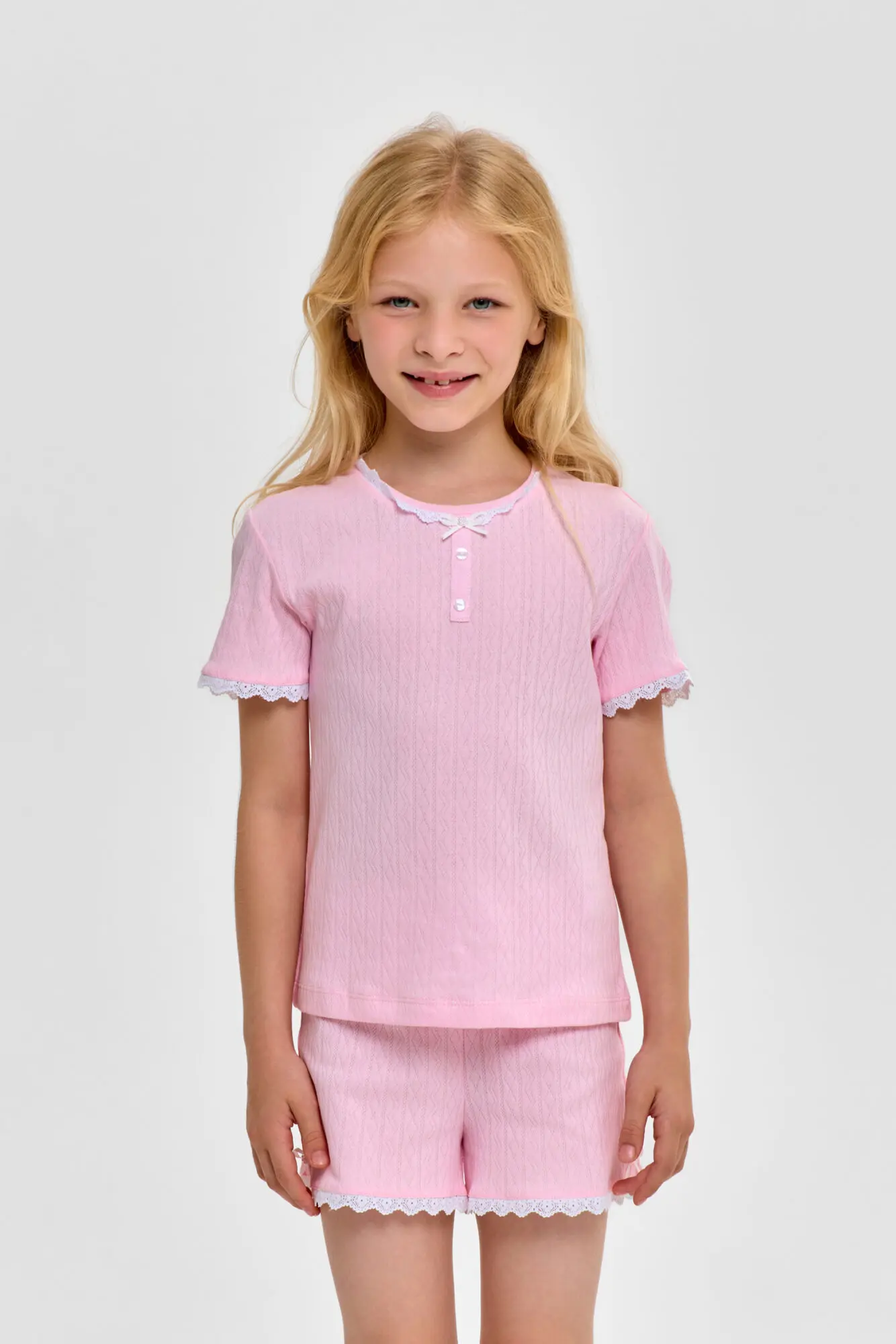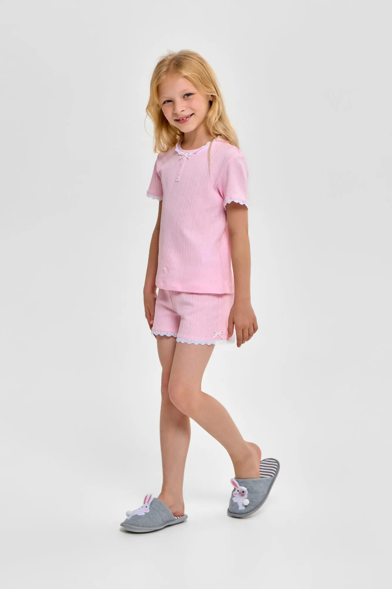 Детская пижама высокого качества для девочки. Комплект включает в себя футболку с короткими рукавами и шорты. Футболка свободного кроя не сковывает движений. Шорты свободного кроя, выполненные ... в нежном розовом цвете, оснащены эластичной резинкой на талии.