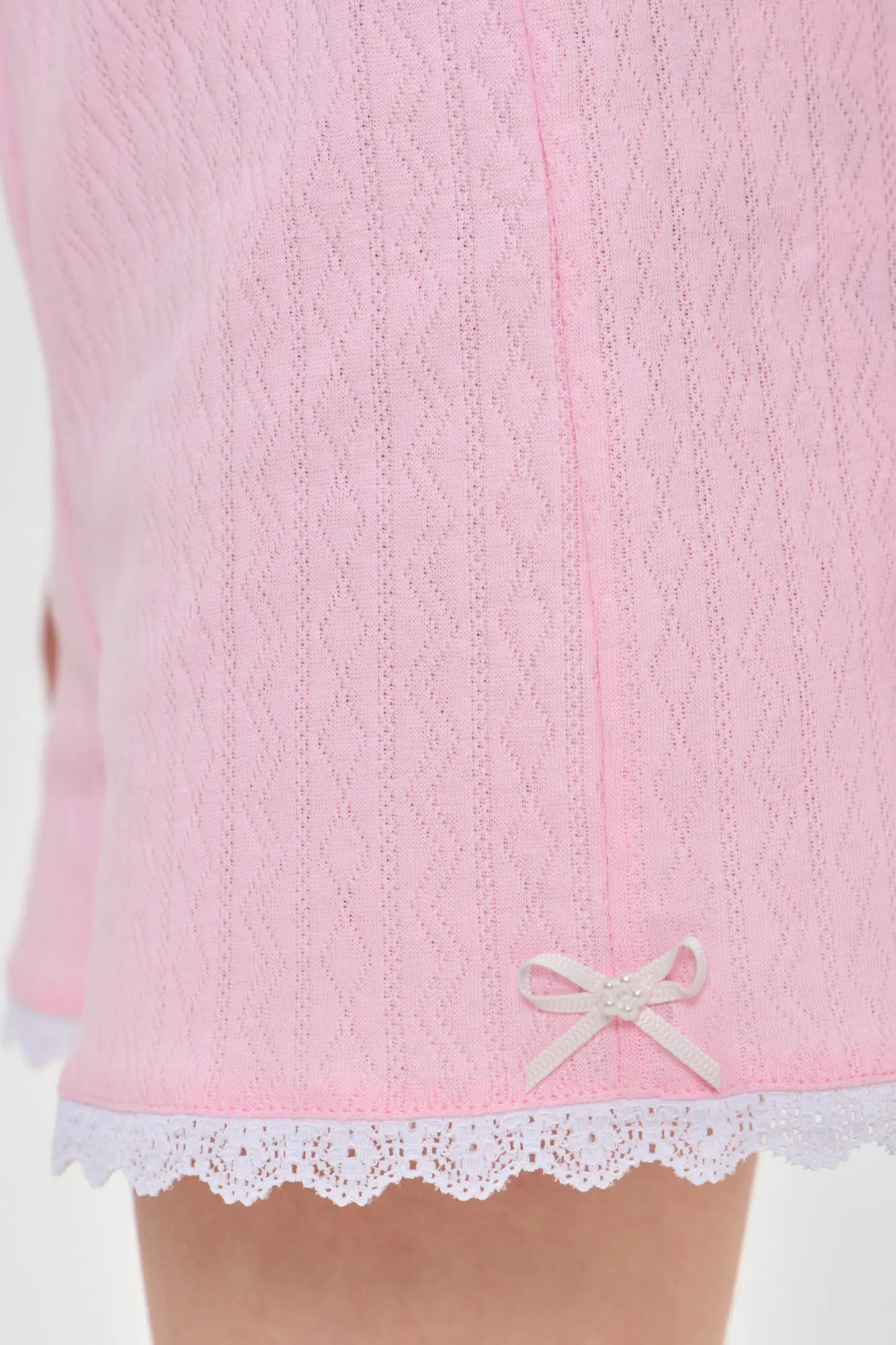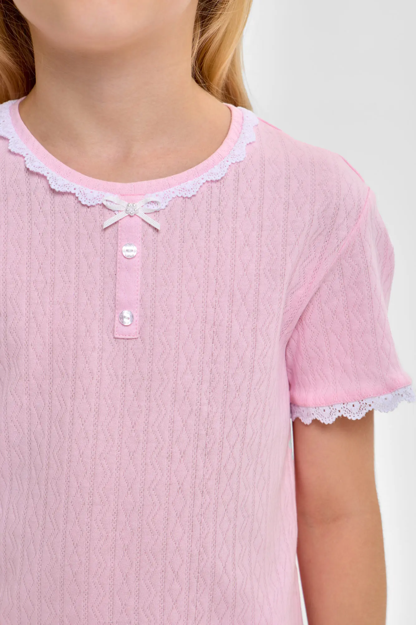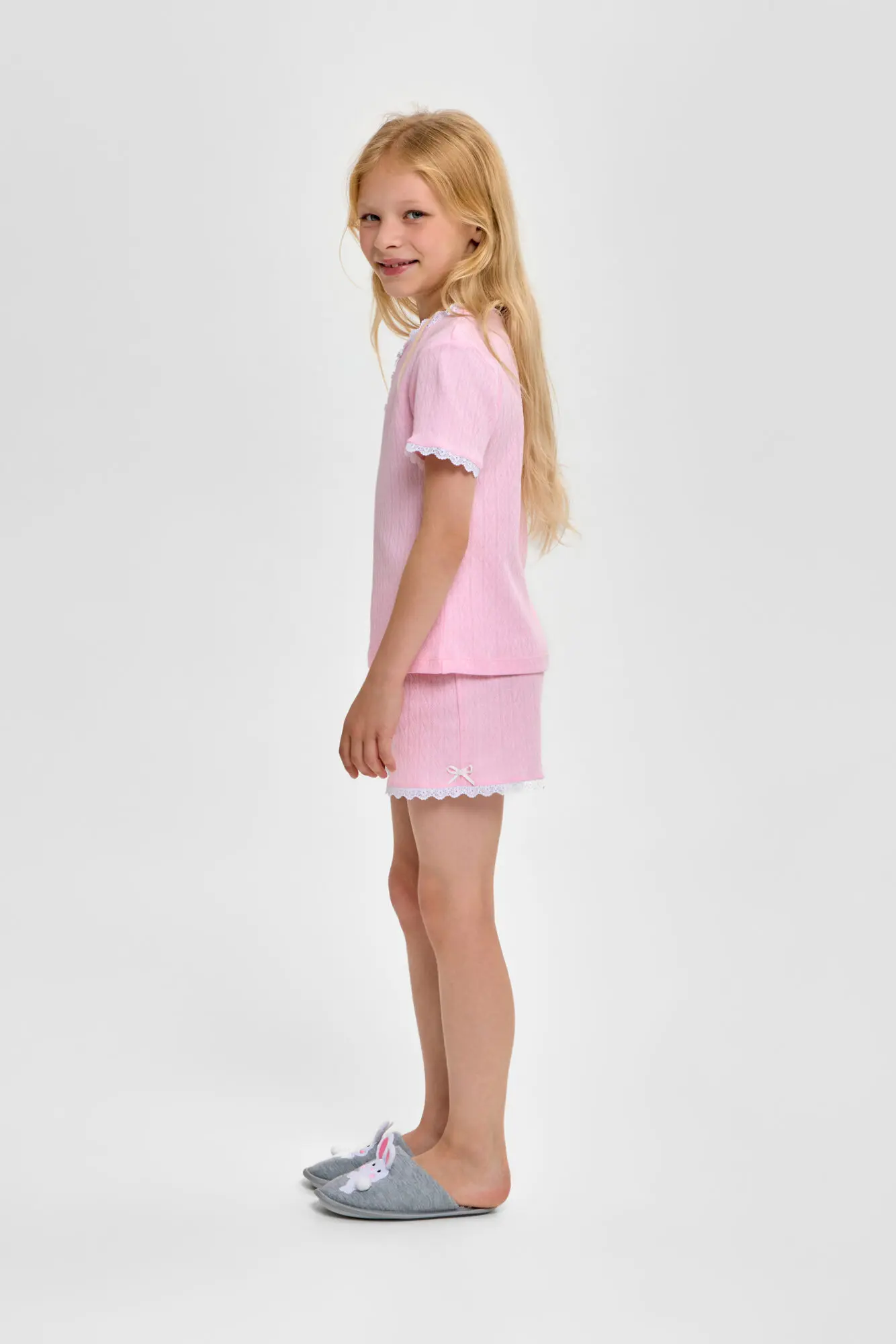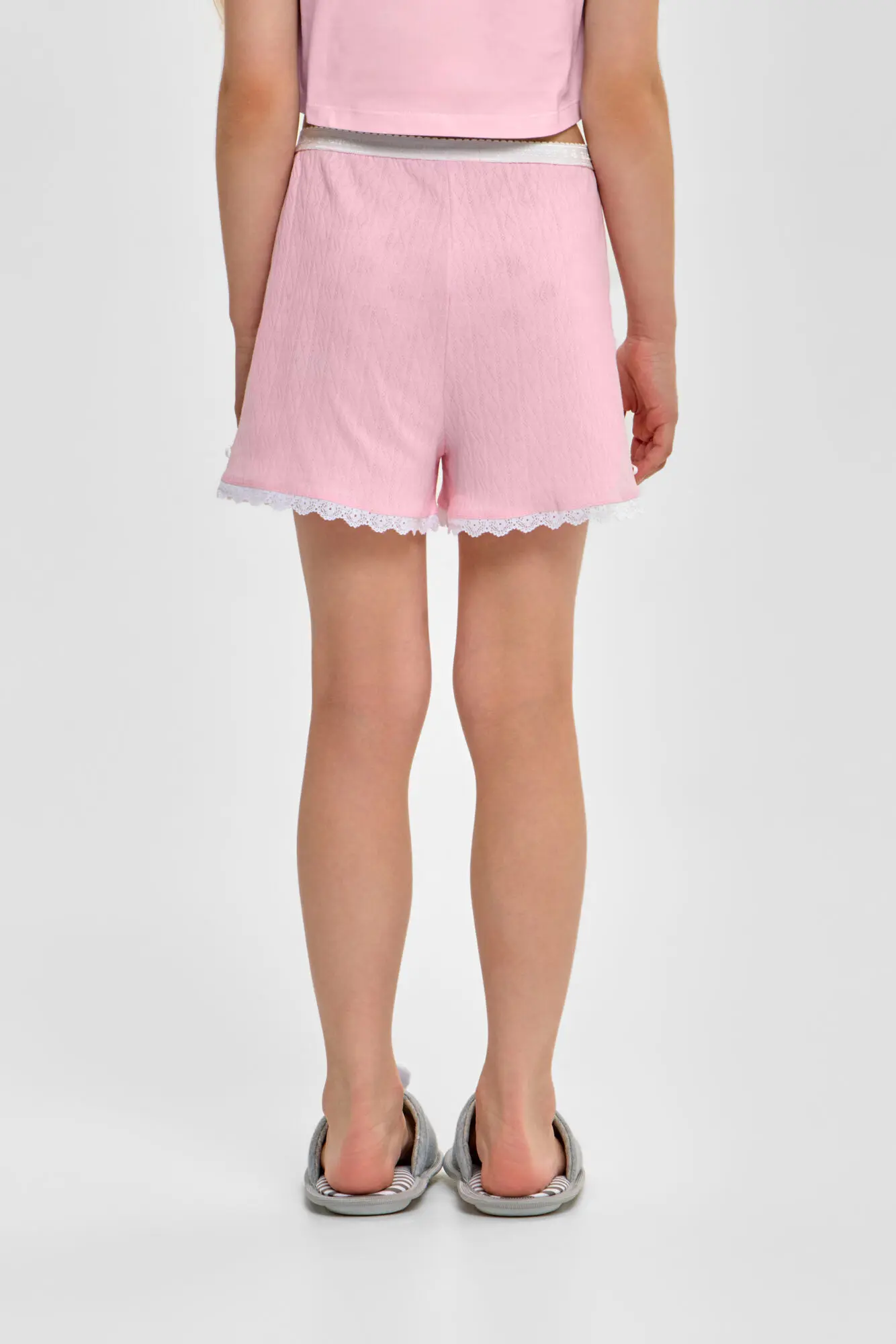 Детская пижама высокого качества для девочки. Комплект включает в себя футболку с короткими рукавами и шорты. Футболка свободного кроя не сковывает движений. Шорты свободного кроя, выполненные ... в нежном розовом цвете, оснащены эластичной резинкой на талии.