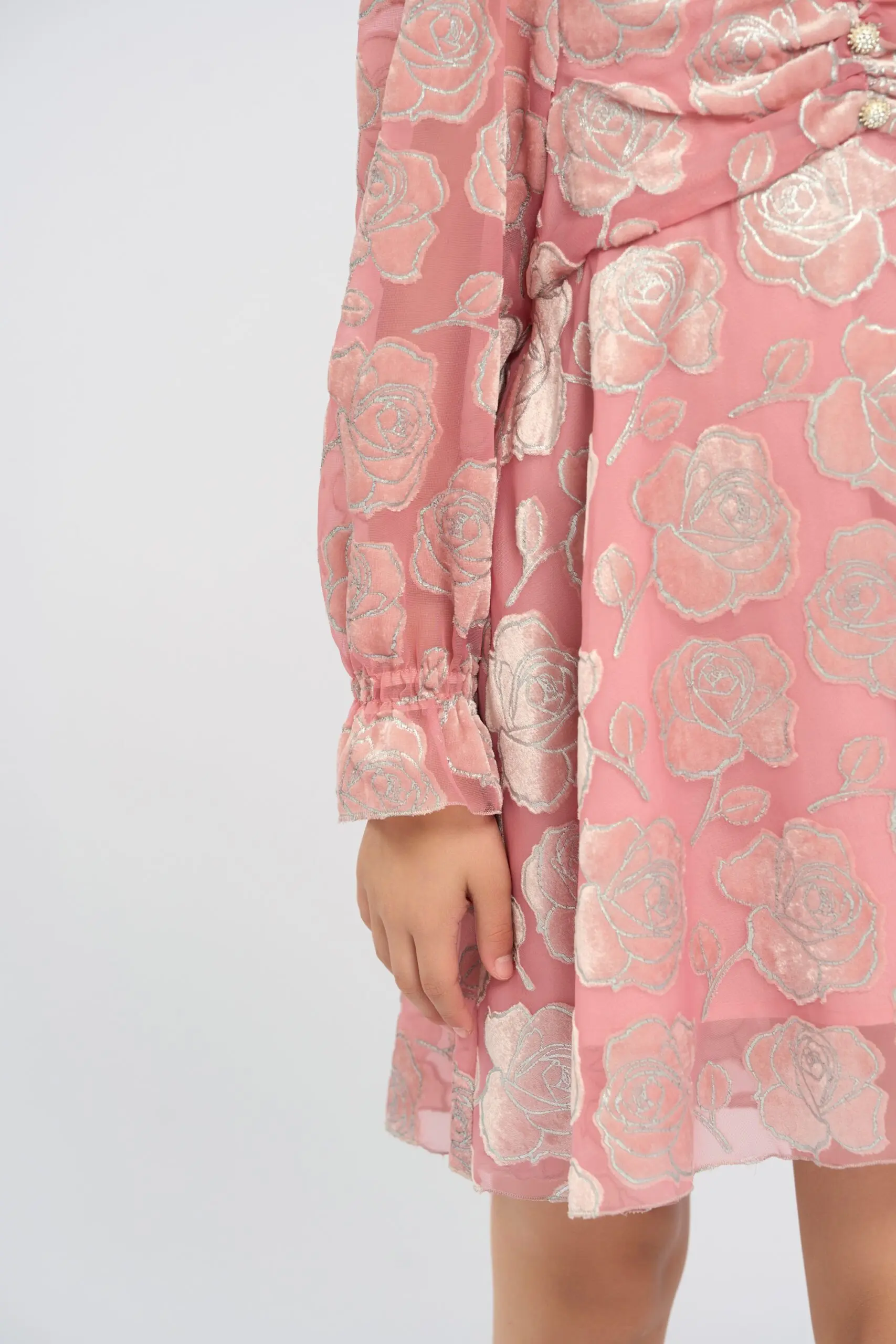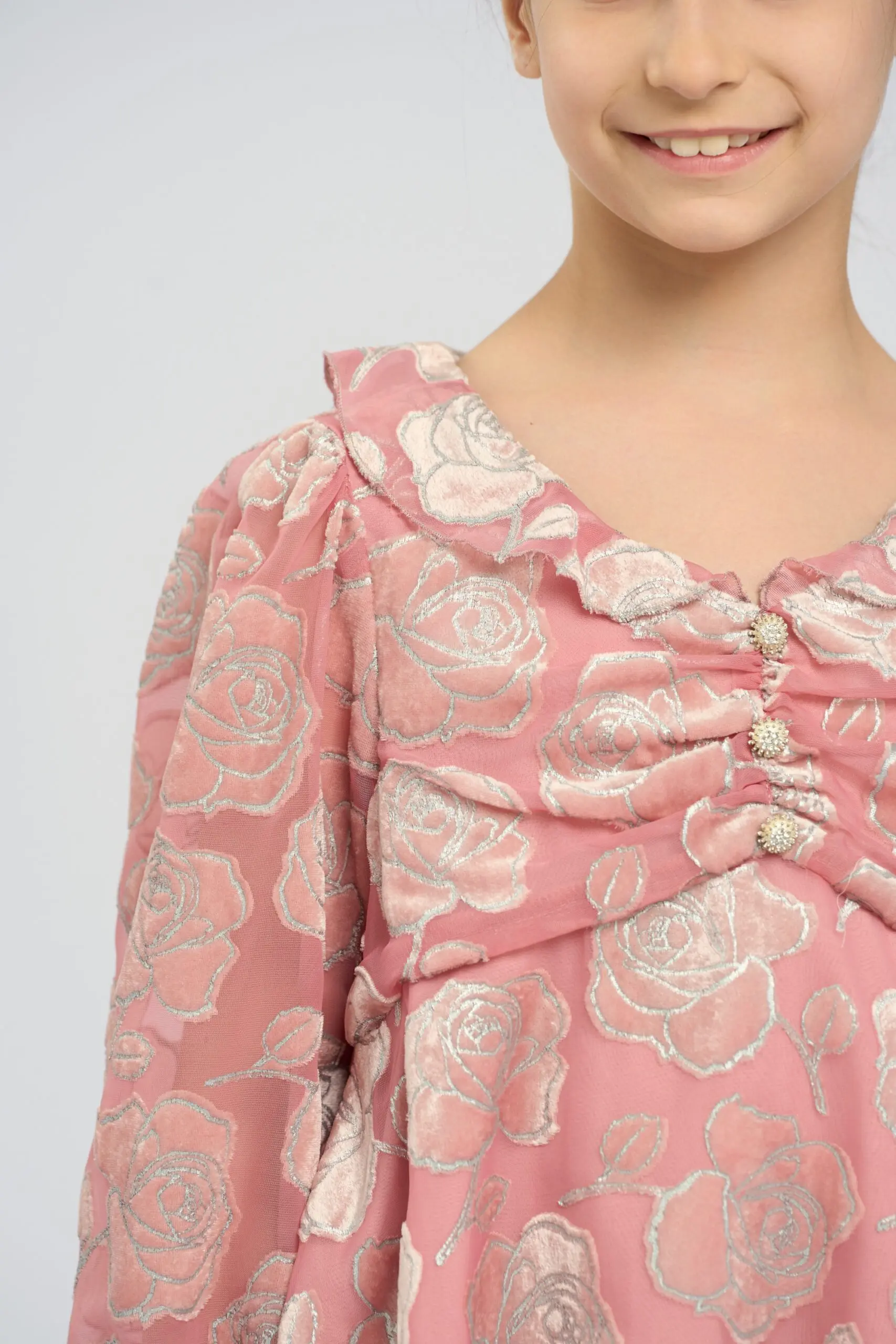 Очаровательное платье нежно-розового оттенка для девочки подойдет для особых случаев, когда необходимо создать праздничный образ. Модель расширенного от груди силуэта. Воротник и горловина оформлены рюшами. Под ... круглым вырезом декоративные пуговицы. Материал с выбитым бархатистым рисунком подчеркивает праздничное настроение платья. Подкладка из натурального хлопка приятна нежной детской коже и хорошо пропускает воздух, что также добавляет комфорта.
