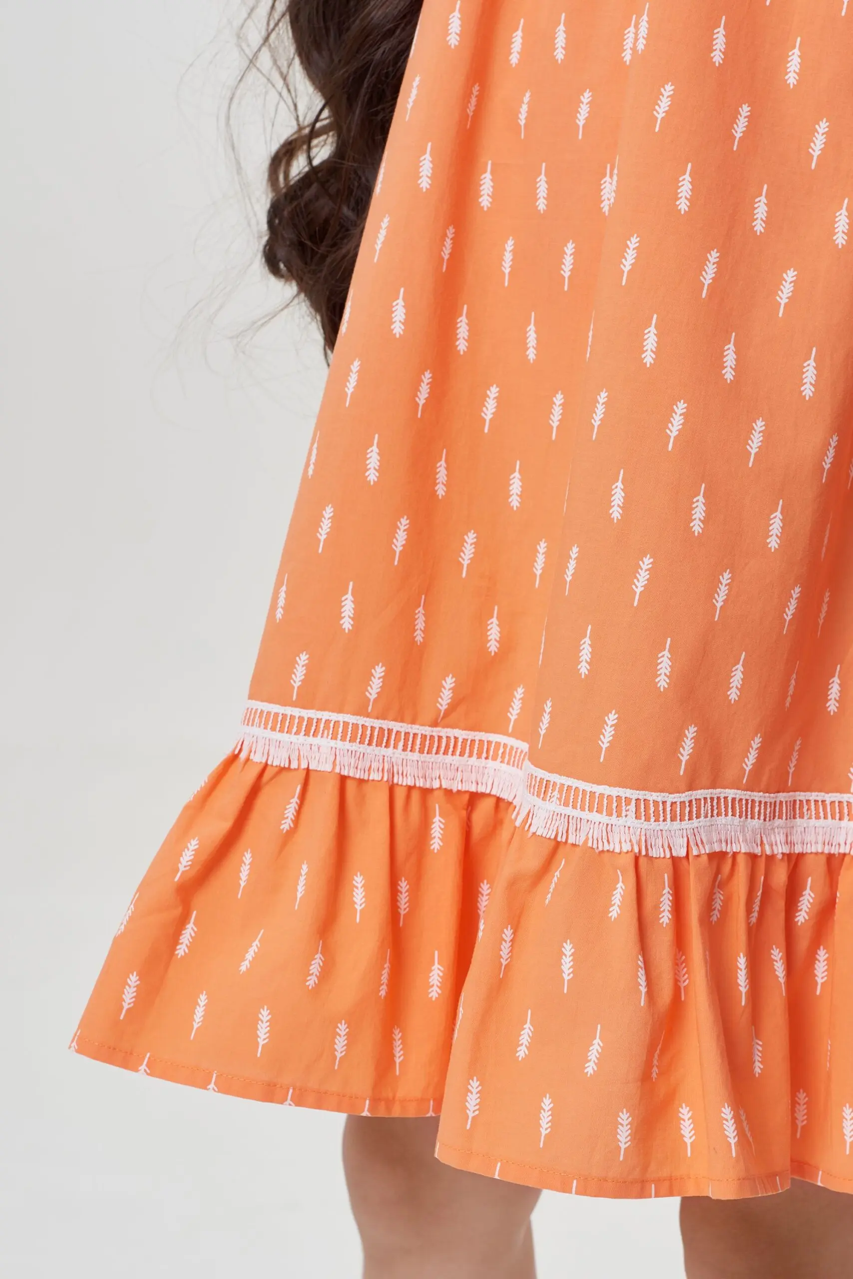 Кроме того, воланы дополнительно декорированы причудливой тесьмой, которая придает платью особое очарование.