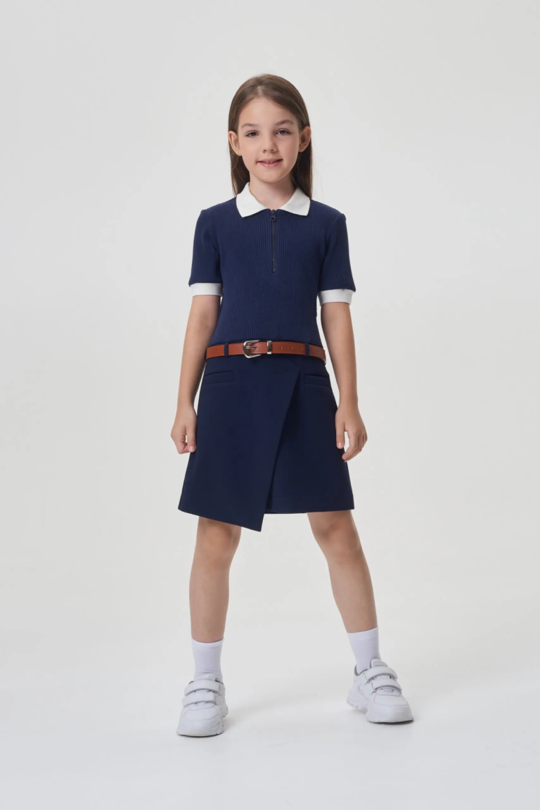 Школьное платье из трикотажа синего цвета - идеальный вариант для учебных будней.