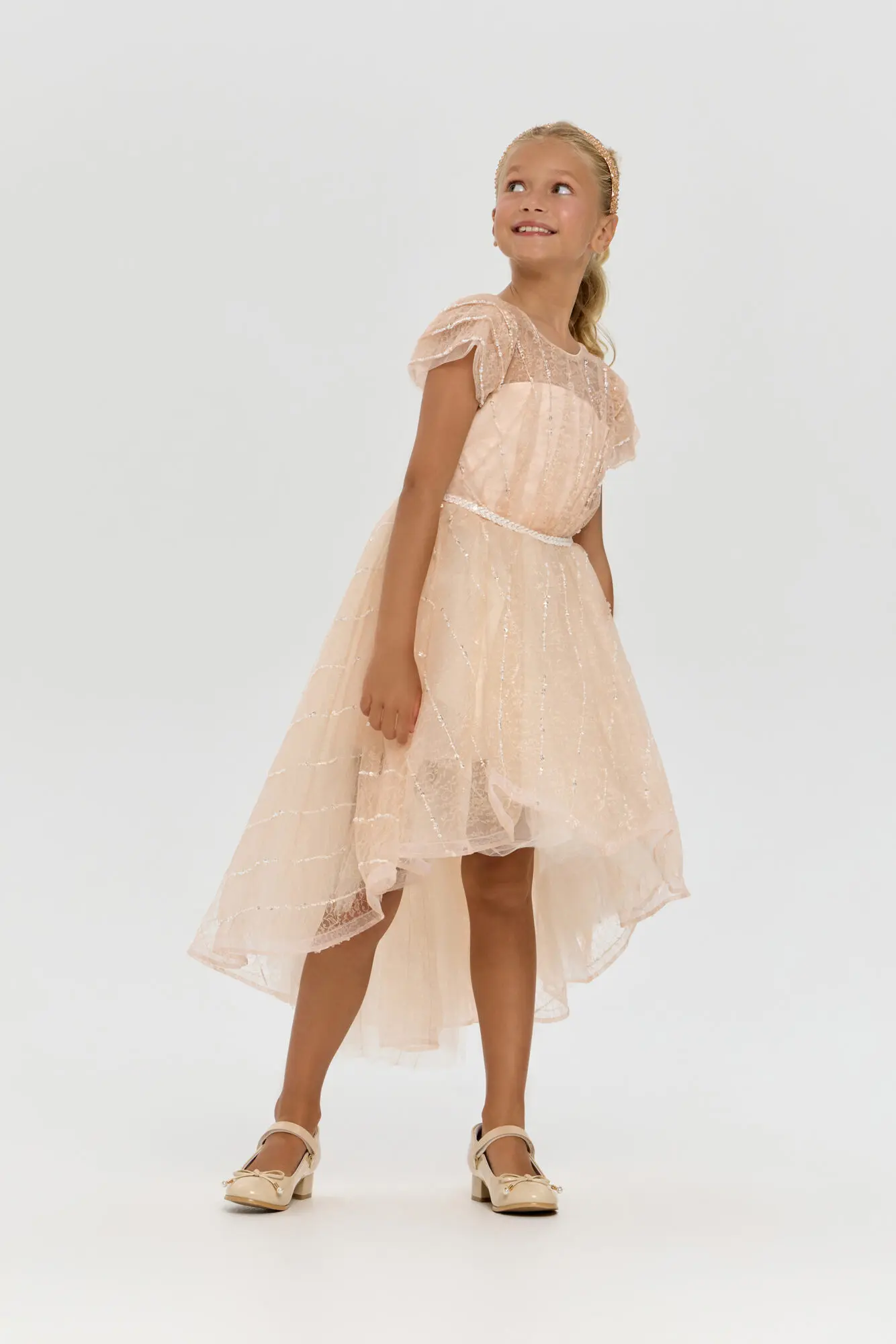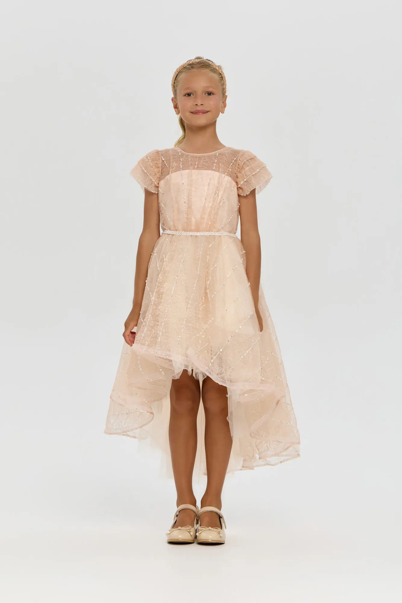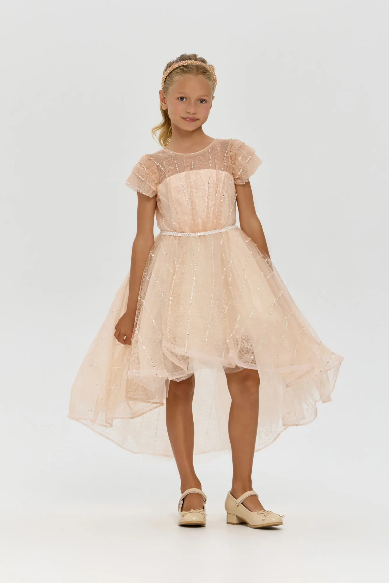 Замечательное платье для девочки станет украшением любого праздника. Эта модель имеет слегка приталенный силуэт и короткие рукава. Элегантный V-образный вырез на спине добавляет шарма. Изысканный пояс, ... декорированный блестящими стразами, превосходно завершает образ, акцентируя талию и создавая запоминающийся эффект. Роскошная асимметричная юбка – главная особенность. Платье украшено сверкающими пайетками, придающими ему особое очарование. Этот наряд – прекрасный выбор для юной модницы, стремящейся проявить свою уникальность и выделиться из толпы.