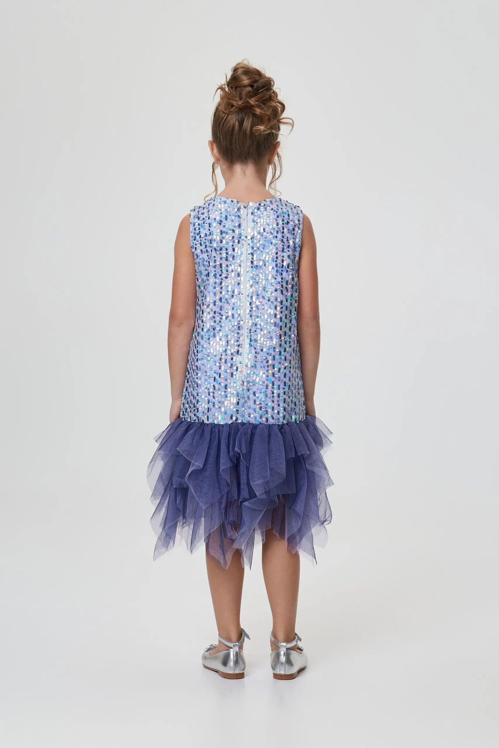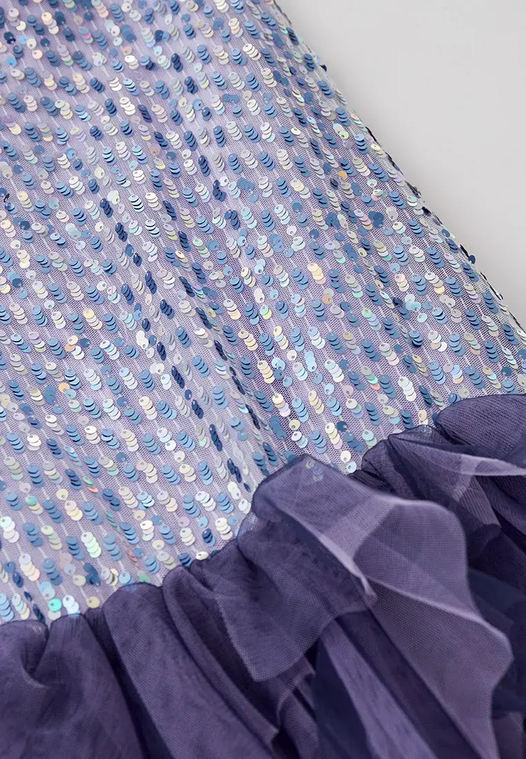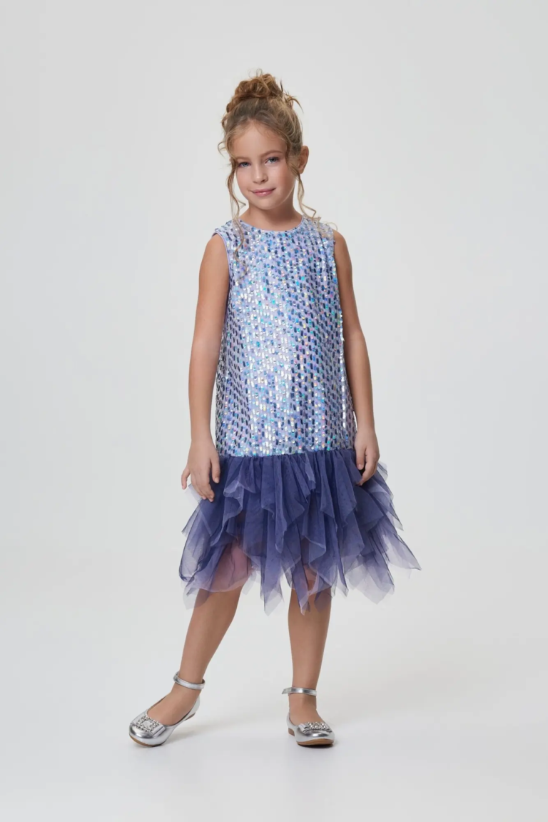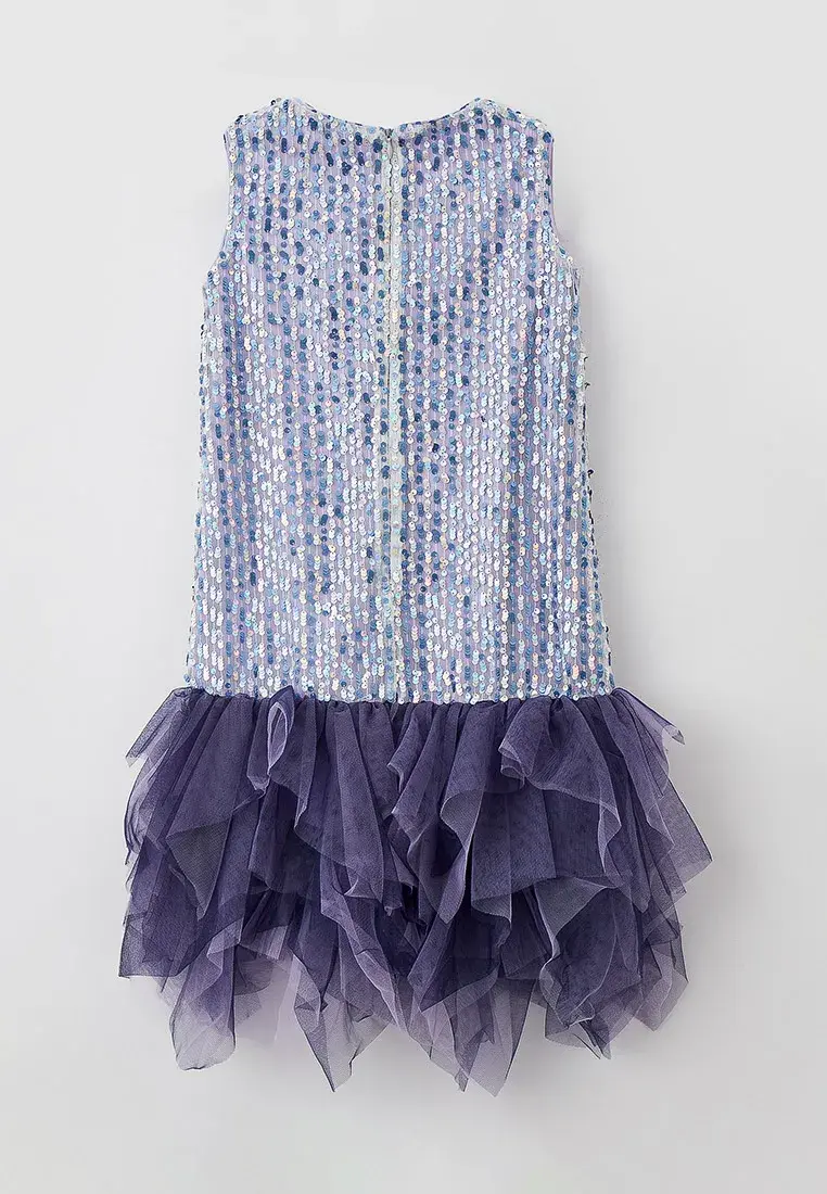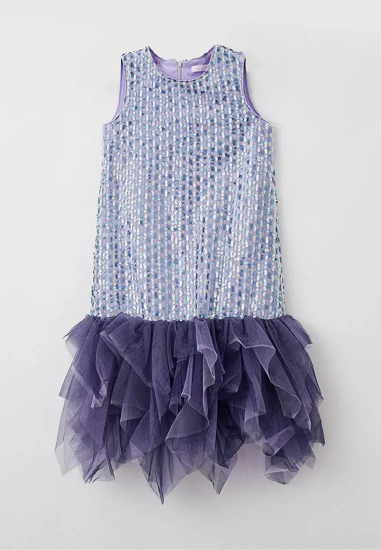 Цельнокроеное нарядное платье без рукавов — отличный выбор для школьного или семейного торжества. Модель прямого силуэта по всей поверхности расшита пайетками в лавандовых тонах. Низ оформлен ... многоярусными воланами из черной сетки, чьи неровные края подчеркивают изящную хрупкость создаваемого образа.