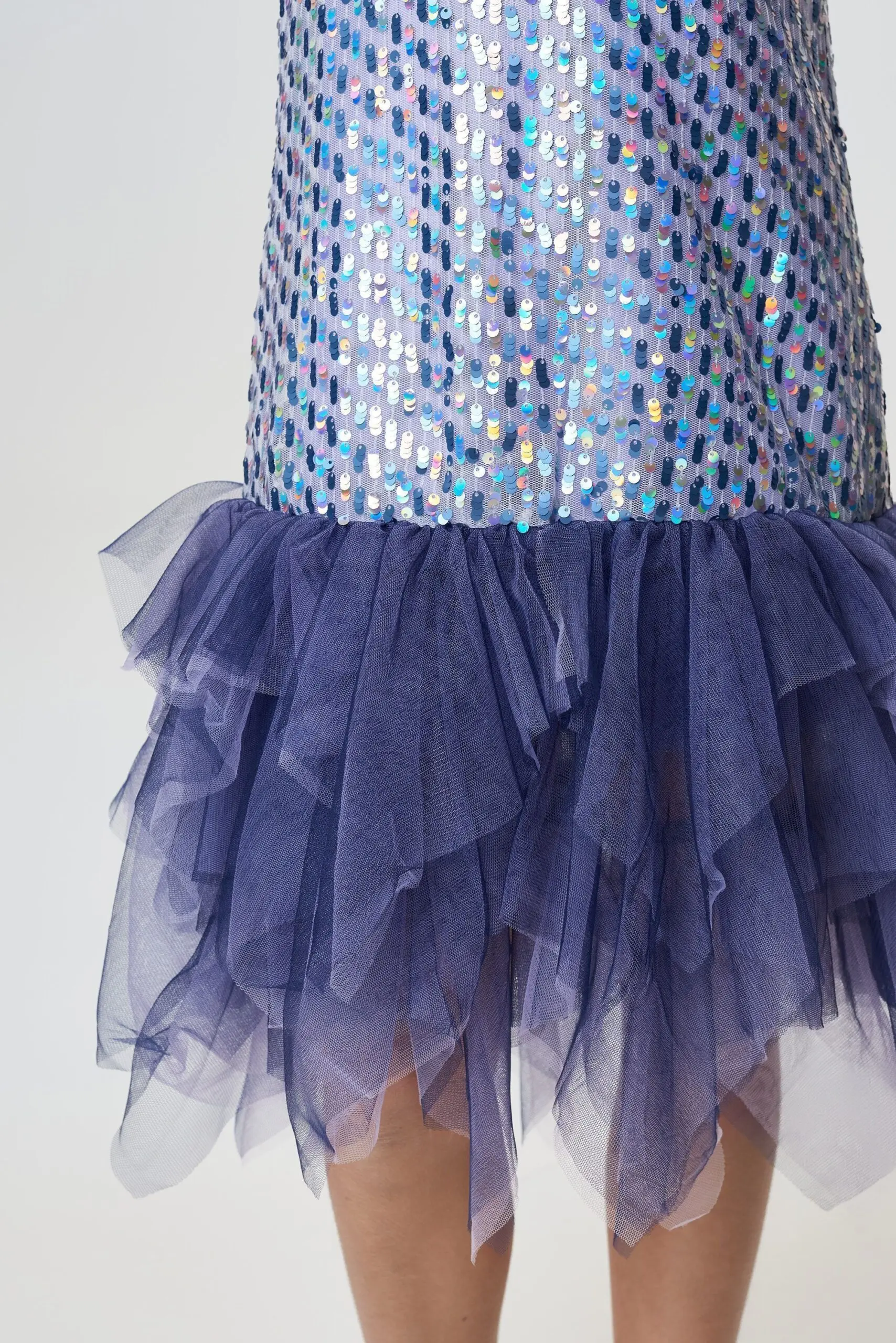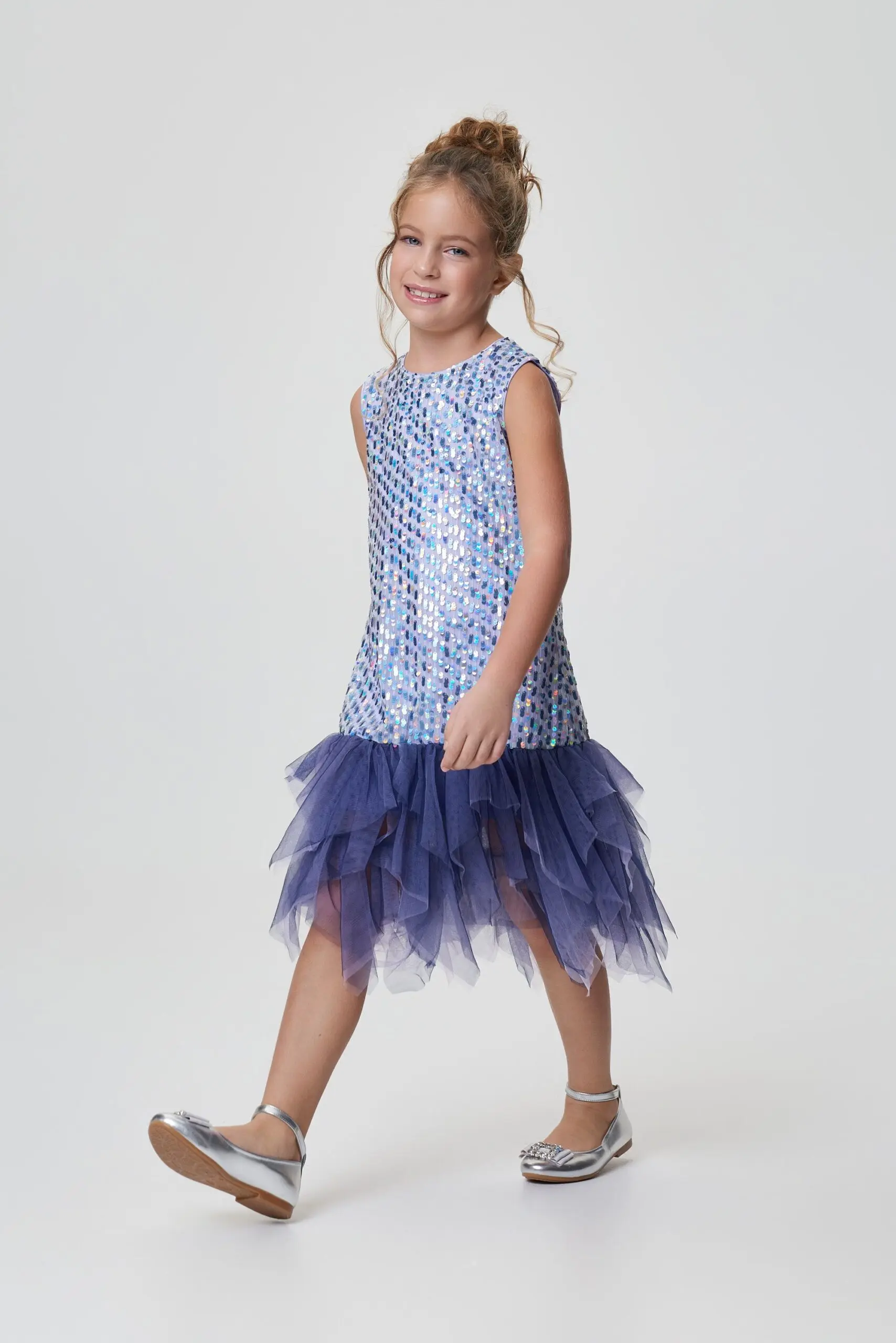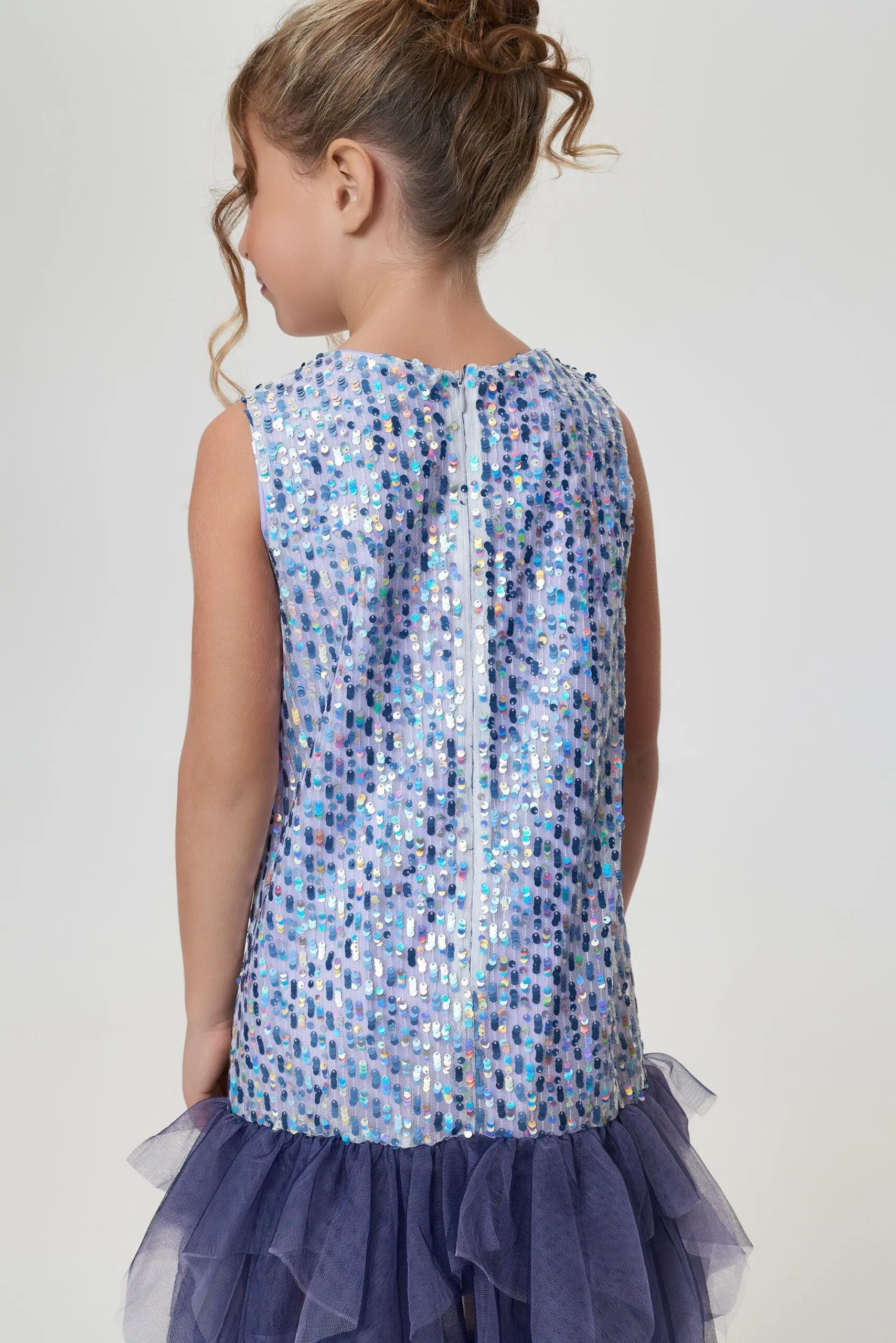 Цельнокроеное нарядное платье без рукавов — отличный выбор для школьного или семейного торжества. Модель прямого силуэта по всей поверхности расшита пайетками в лавандовых тонах. Низ оформлен ... многоярусными воланами из черной сетки, чьи неровные края подчеркивают изящную хрупкость создаваемого образа.