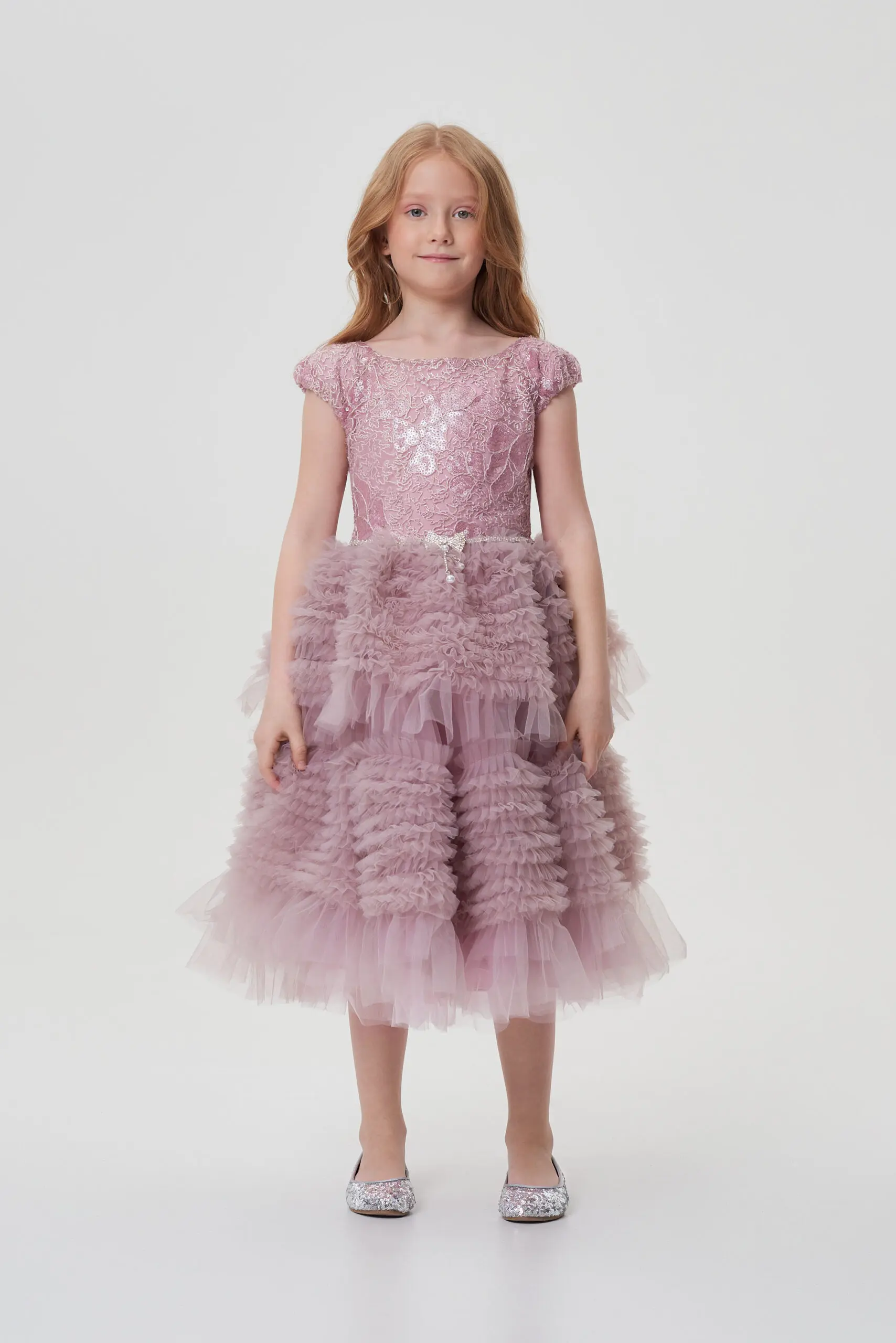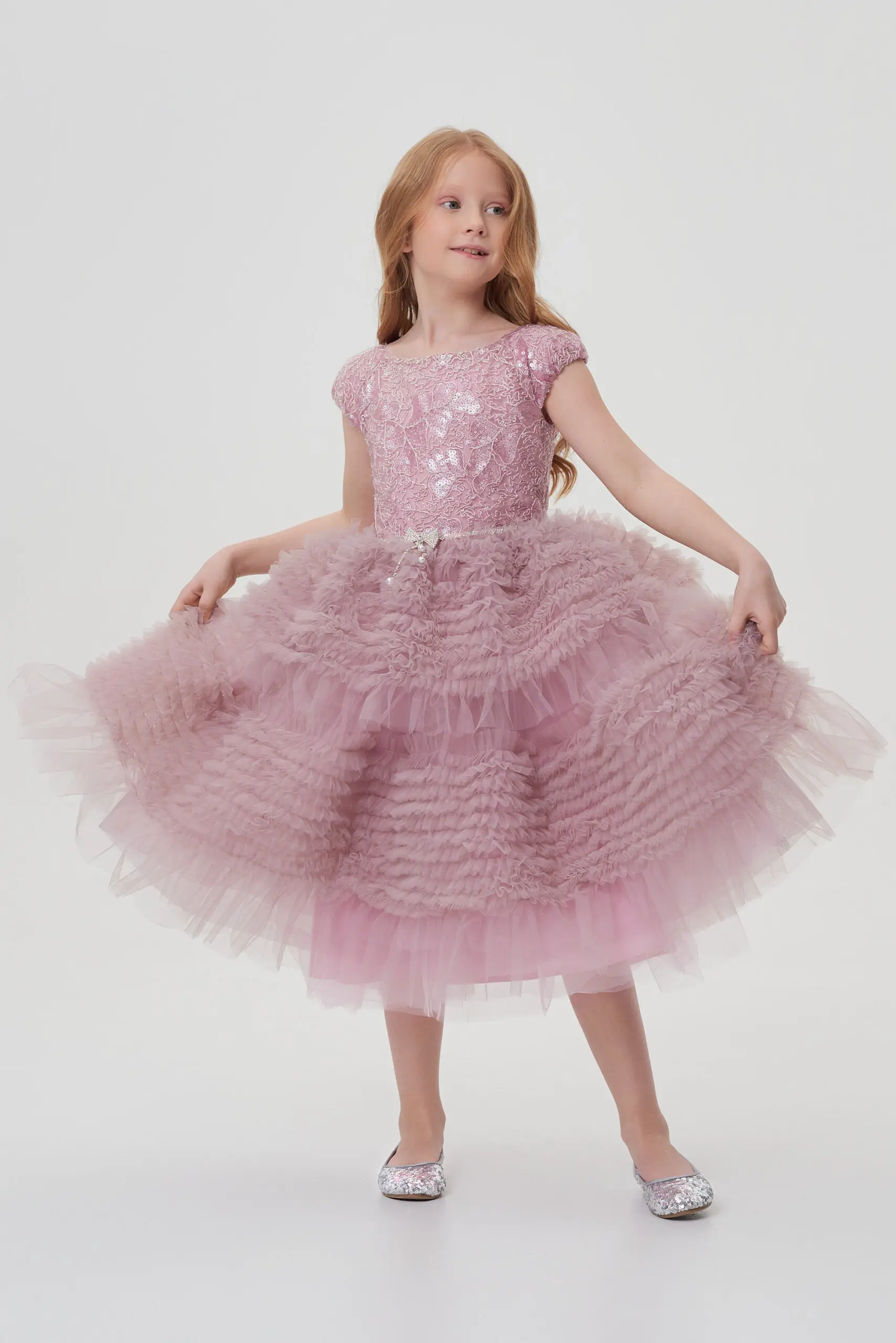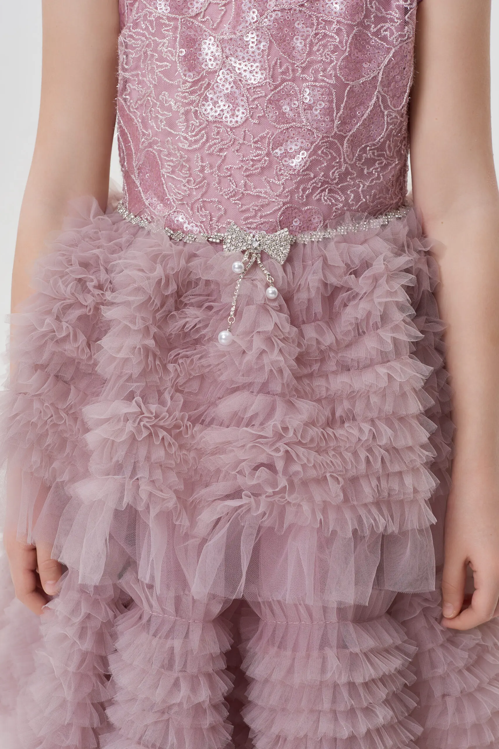 Изысканное платье в нежном розовом цвете создано для сказочного вечера. Лиф выполнен из фактурной ткани с отделкой пайетками. Он аккуратно облегает фигуру, но не сковывает движения. ... Пышная длинная юбка эффектно ниспадает вниз, она отделана легким фатином, который придаёт ей дополнительный объем и воздушность. На линии талии - эффектный декоративный элемент. Застёжка на молнию, расположенная на спинке, обеспечивает удобство при надевании. Платье станет идеальным выбором для праздников, утренников или семейных торжеств.