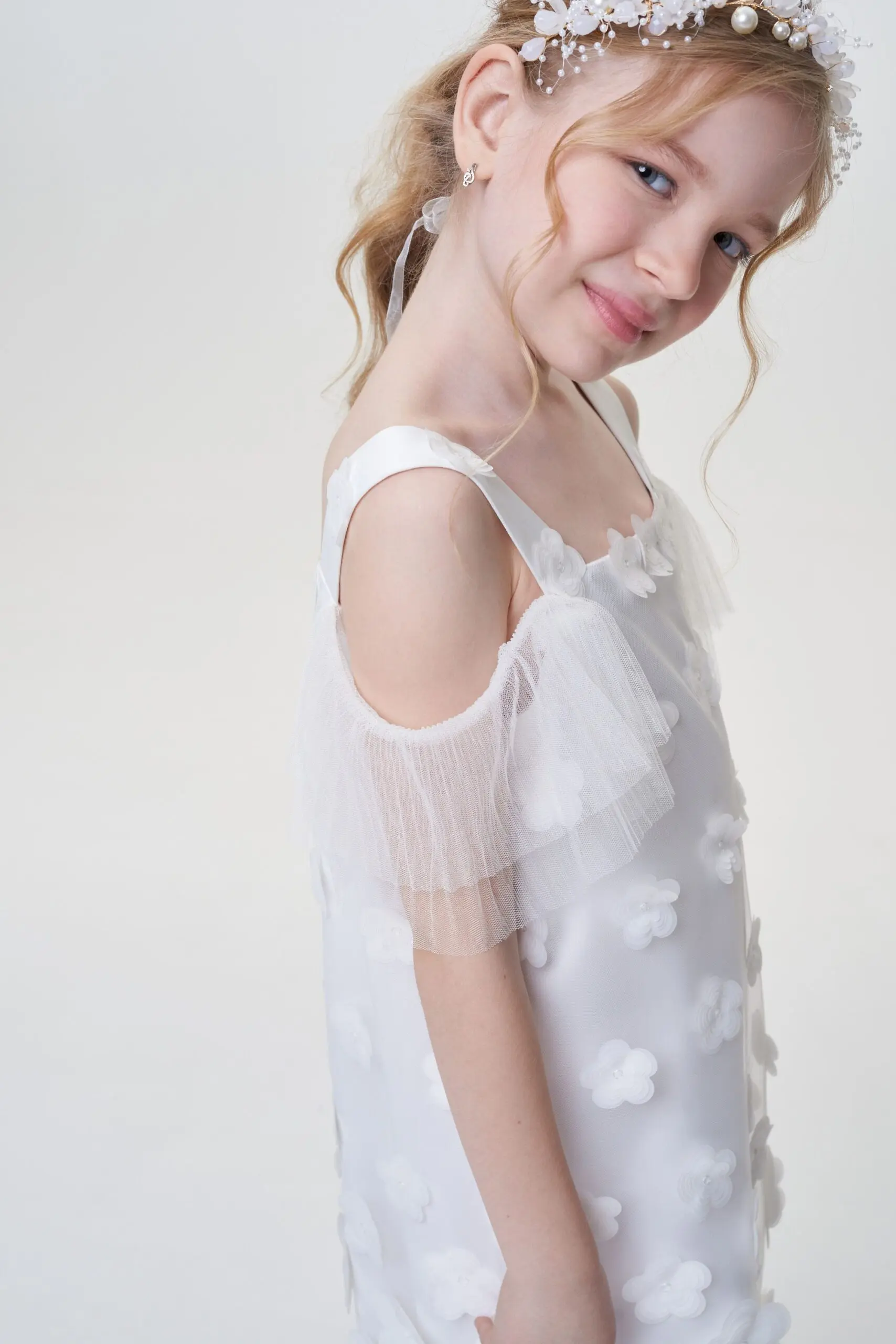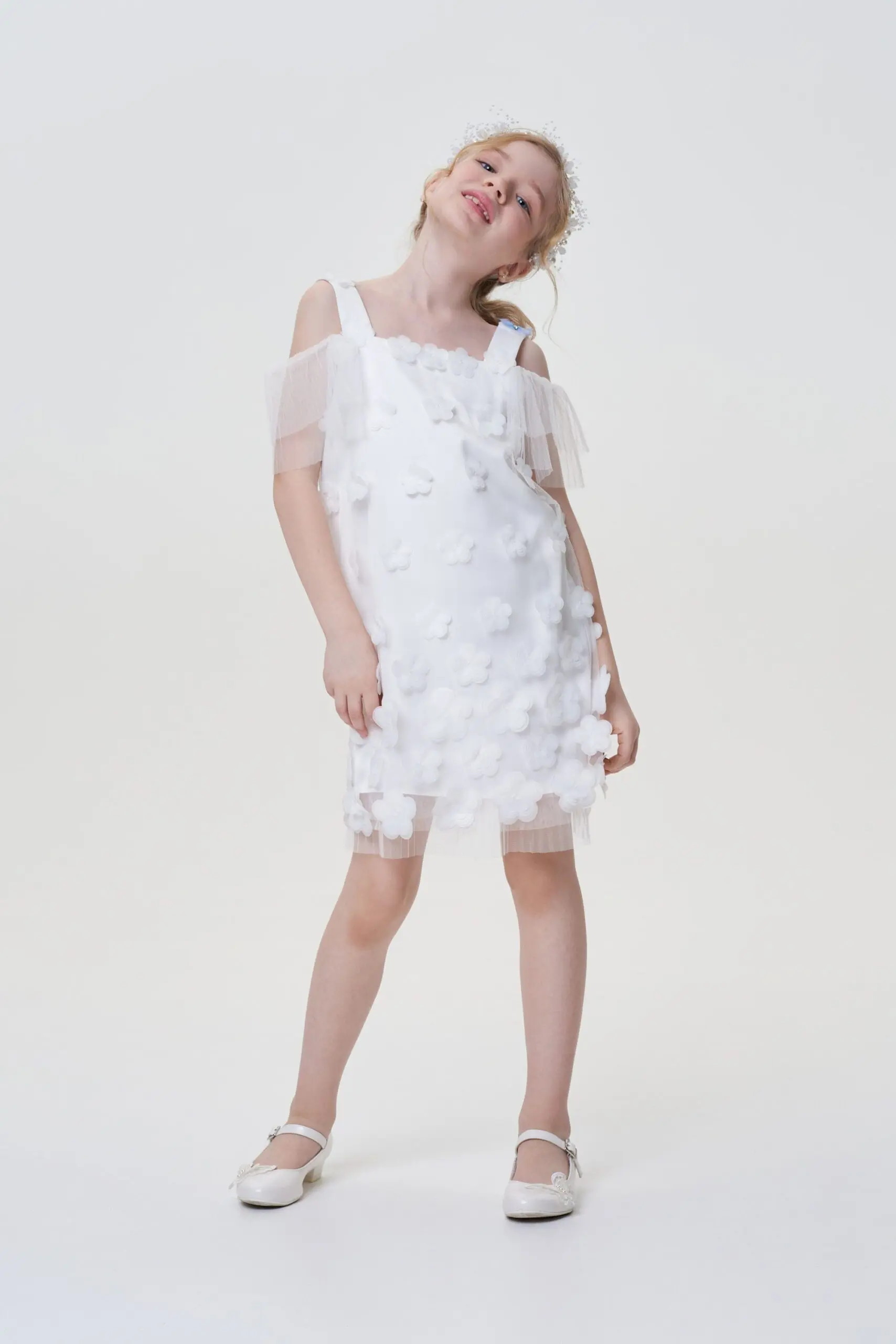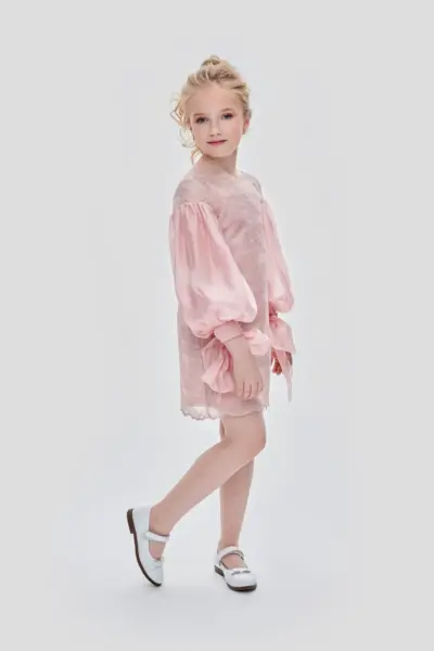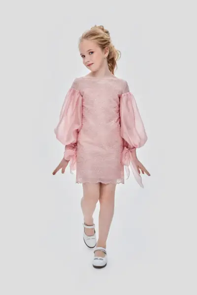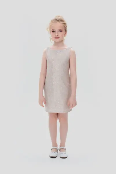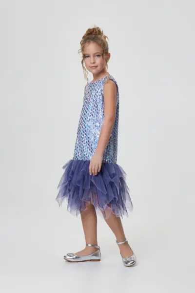 Украшенное огромными пайетками, это цельнокроеное нарядное платье для девочки кажется сотканным из сияния. Модель расклешенного силуэта, с короткими рукавами и отложным воротником. На спине застежка на ... молнию.