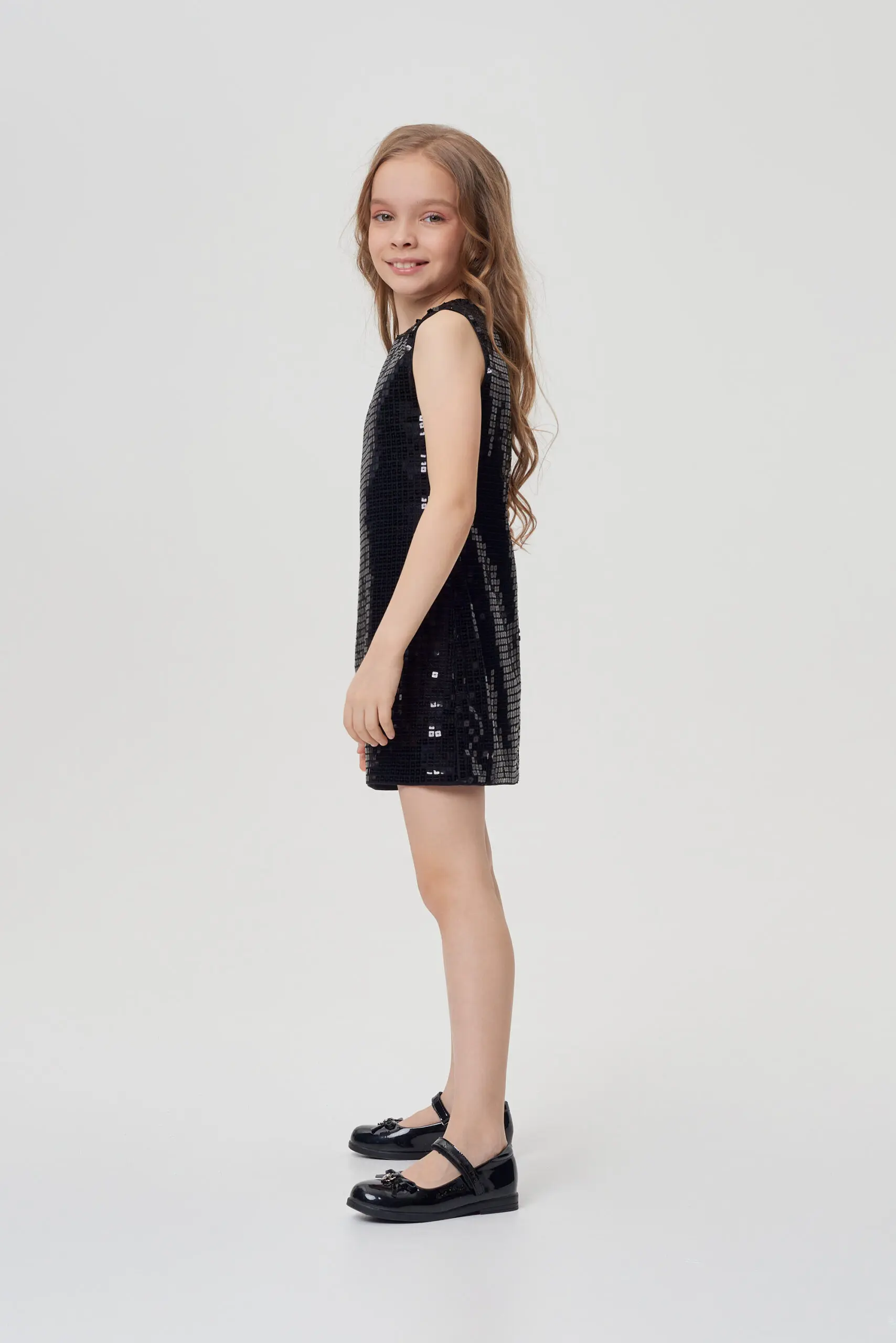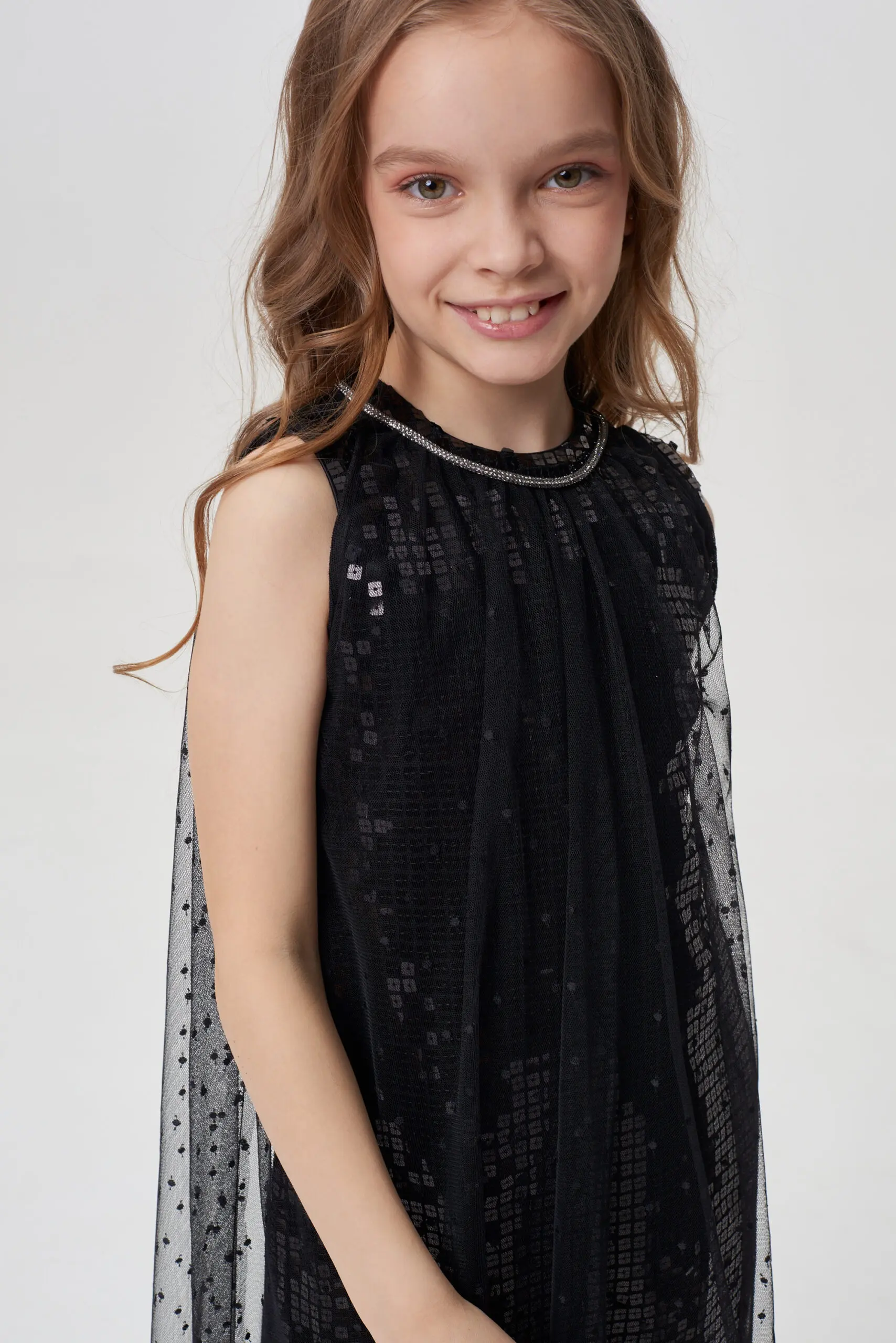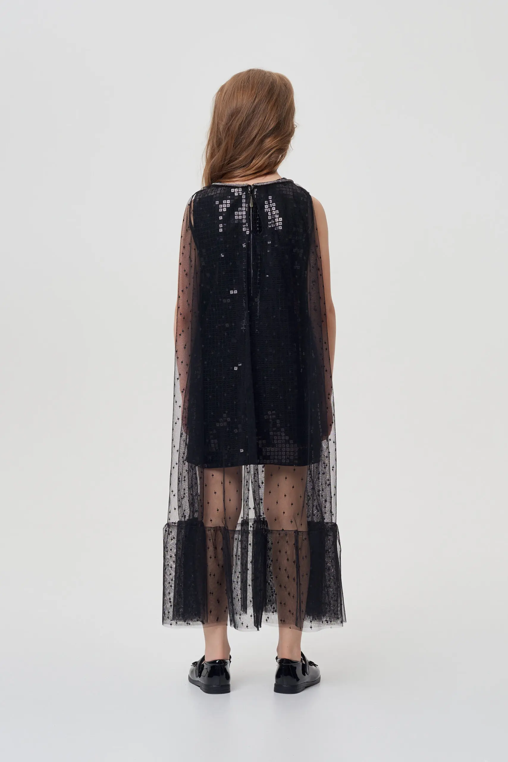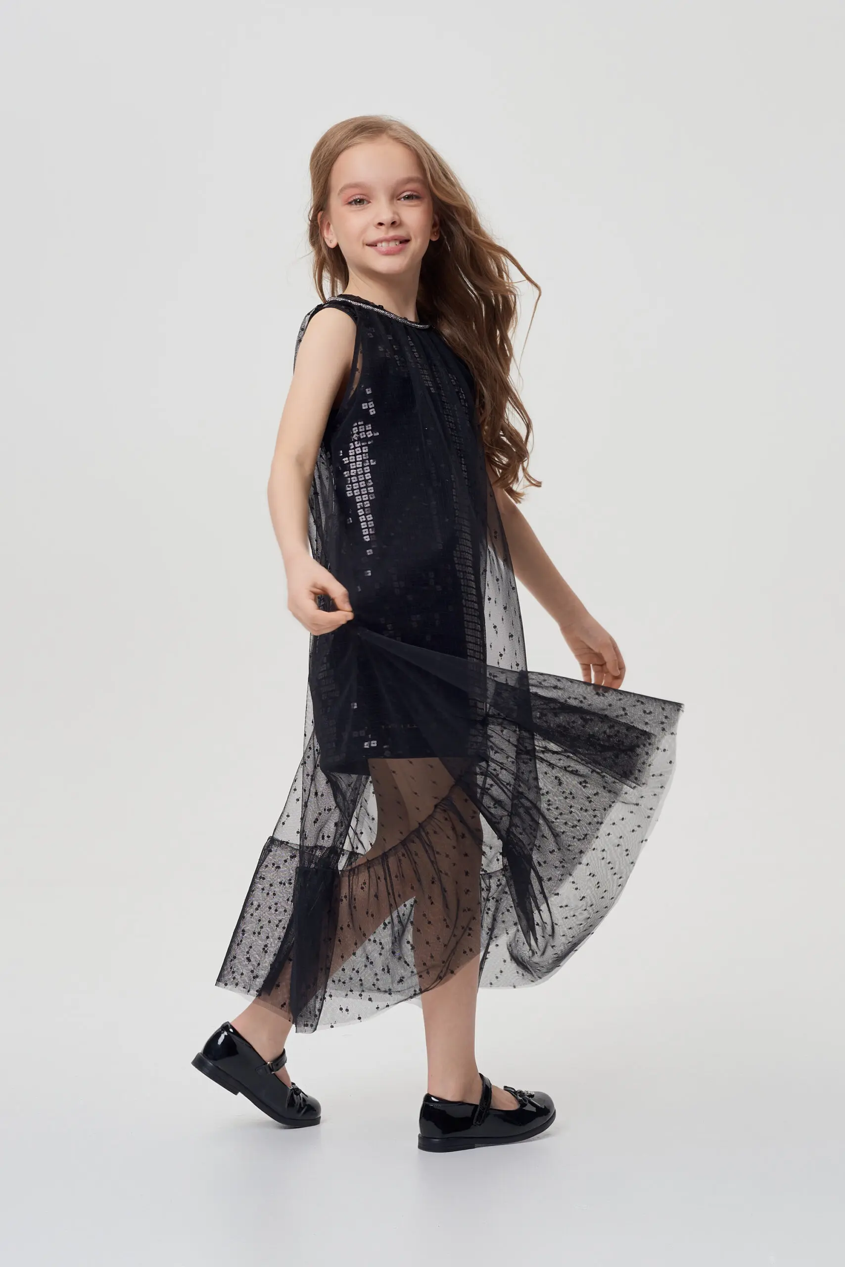 Нарядное чёрное платье для девочки сочетает в себе элегантность и игривость. Нижняя часть платья выполнена из блестящих пайеток, которые ловят свет и создают эффектный, праздничный образ. ... Пайетки придают наряду яркость и позволяют девочке чувствовать себя настоящей звездой на любом мероприятии. Верхнее платье из прозрачного фатина добавляет легкости и воздушности. Широкий волан по краю фатина создает романтичный силуэт. При желании верхнее платье можно снять. Застегивается модель сзади на молнию. Такое платье идеально подойдёт для праздников, семейных торжеств или других особых случаев, позволяя маленькой моднице выглядеть великолепно и уверенно.