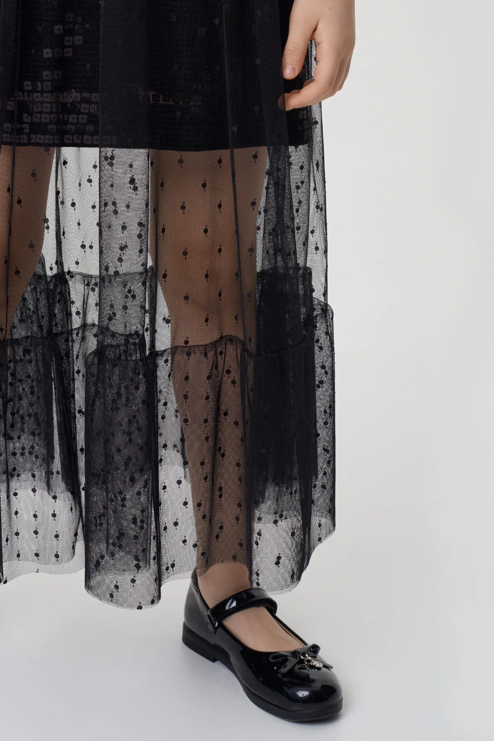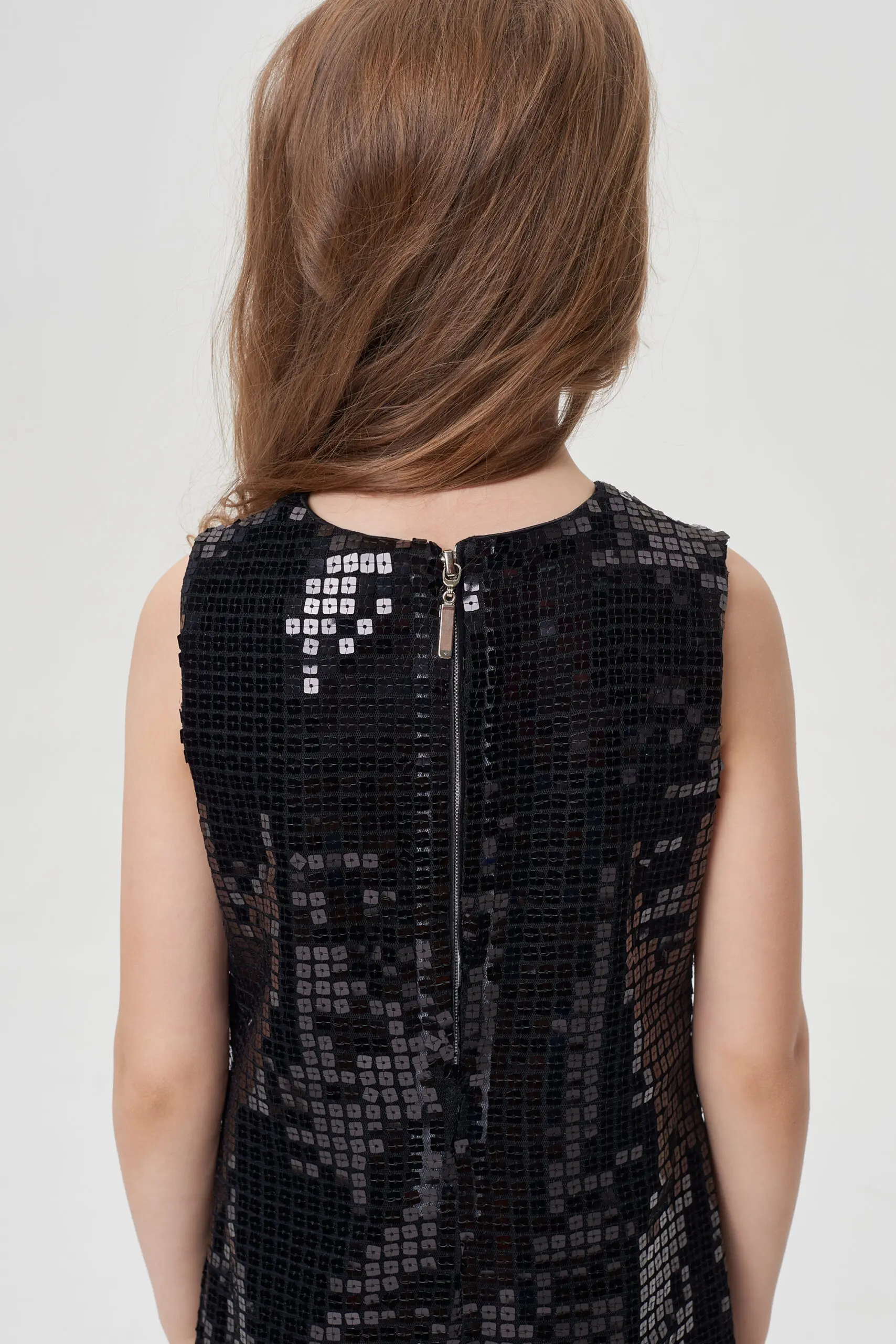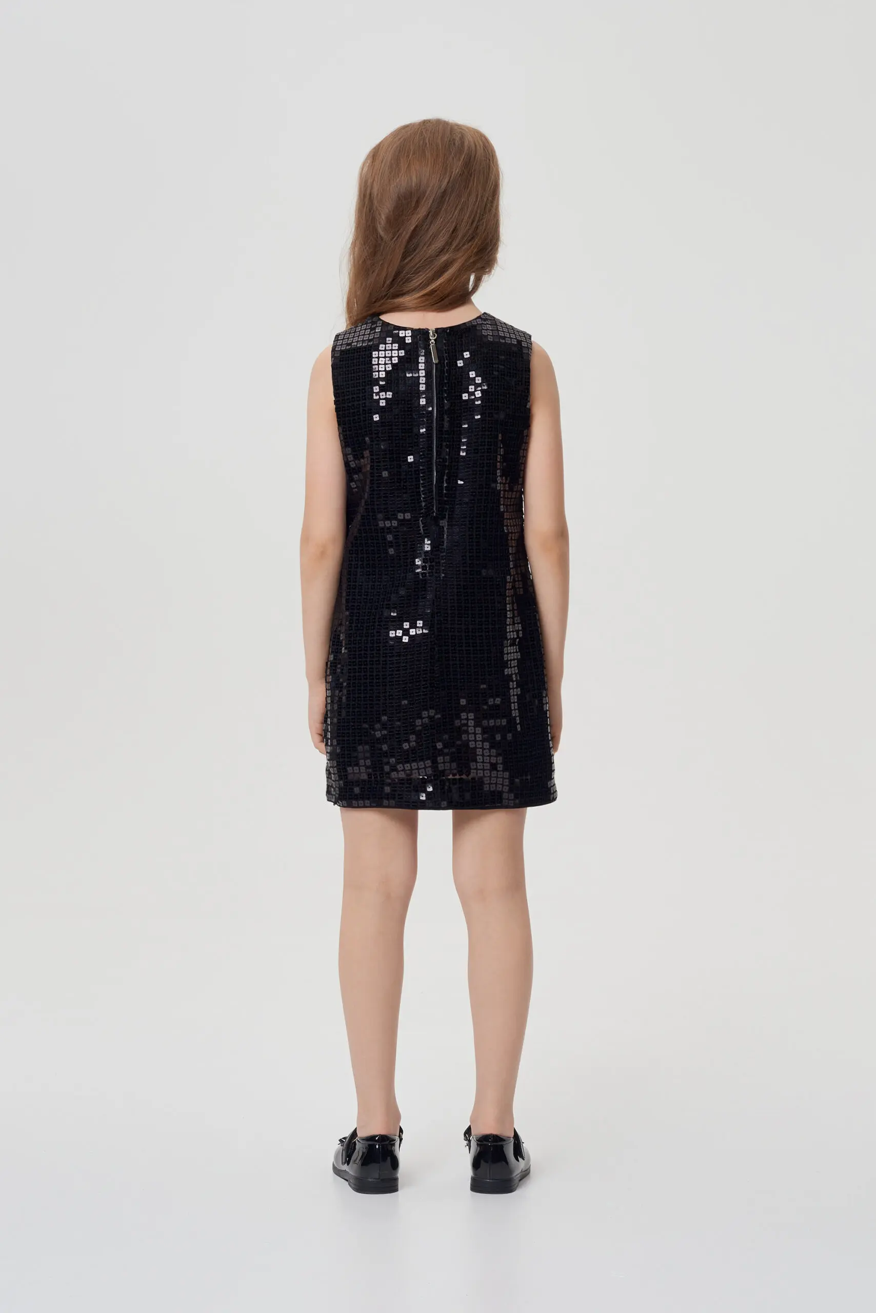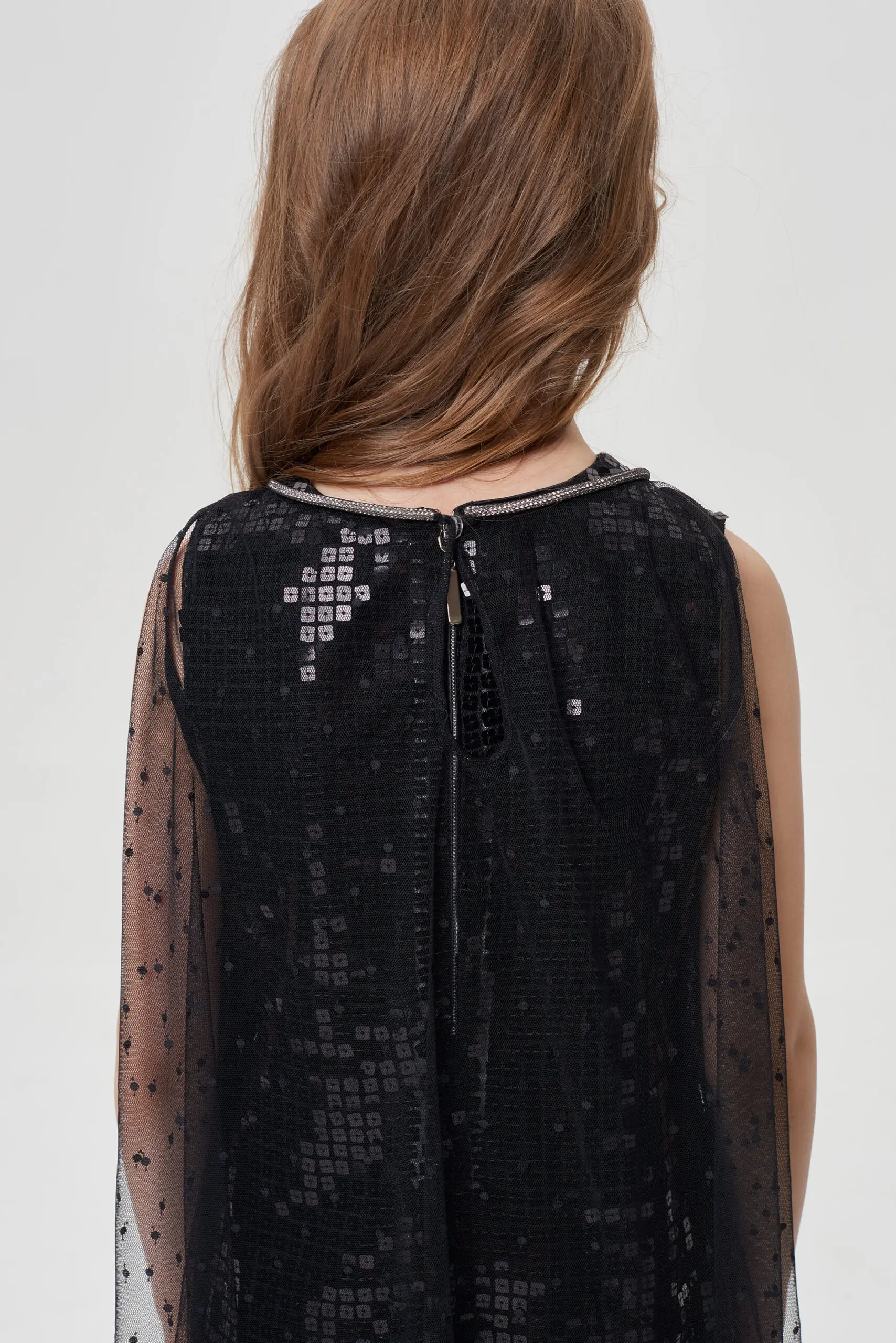 Нарядное чёрное платье для девочки сочетает в себе элегантность и игривость. Нижняя часть платья выполнена из блестящих пайеток, которые ловят свет и создают эффектный, праздничный образ. ... Пайетки придают наряду яркость и позволяют девочке чувствовать себя настоящей звездой на любом мероприятии. Верхнее платье из прозрачного фатина добавляет легкости и воздушности. Широкий волан по краю фатина создает романтичный силуэт. При желании верхнее платье можно снять. Застегивается модель сзади на молнию. Такое платье идеально подойдёт для праздников, семейных торжеств или других особых случаев, позволяя маленькой моднице выглядеть великолепно и уверенно.