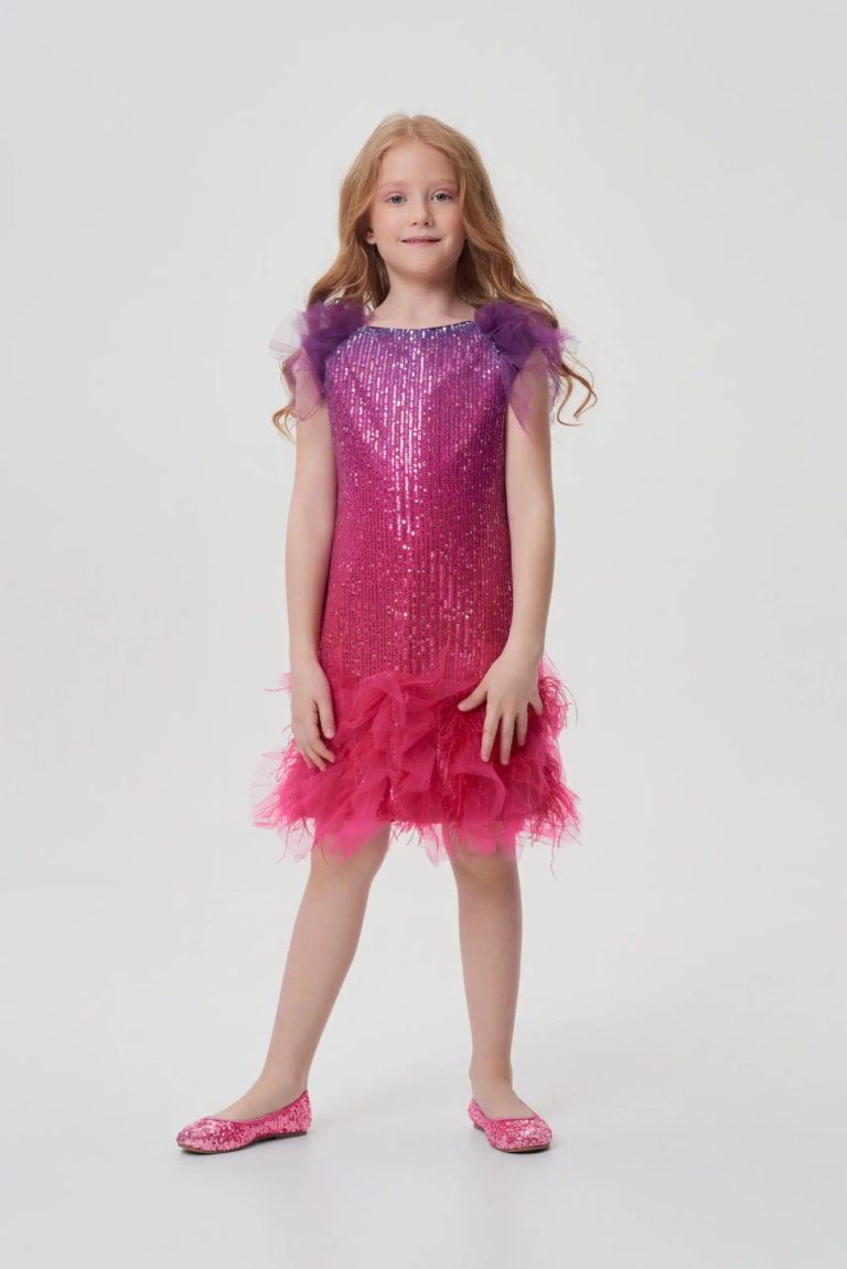 Нарядное платье с градиентным переходом розового оттенка, который плавно переходит от светлого внизу к более насыщенному вверху. По всей поверхности модели рассыпаны блестящие пайетки, которые искрятся ... на свету, добавляя наряду праздничного настроения. Пайетки не только украшают платье, но и придают ему особый шарм, заставляя девочку чувствовать себя настоящей принцессой. Рукава выполнены из легкого фатина. Низ платья отделан фатином и декорирован перышками, что придает дополнительный объем и динамику при движении. Застежка на молнию расположена сзади, что обеспечивает удобство при надевании. Платье станет настоящим украшением любого праздничного гардероба.