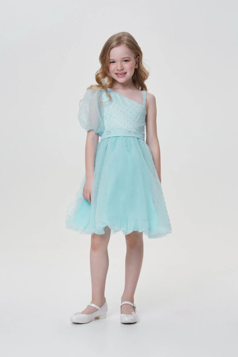 Благодаря необычному крою платье с открытым плечом для девочки сделает свою обладательницу самой заметной на празднике в школе или в детском саду. Отрезной лиф с асимметричным вырезом ... горловины, объемным рукавом-фонариком длиной до локтя и бретелью на открытое правое плечо. Юбка пышная, с односторонними складками и подъюбником из фатина. Линия талии подчеркнута узким атласным поясом с брошью.