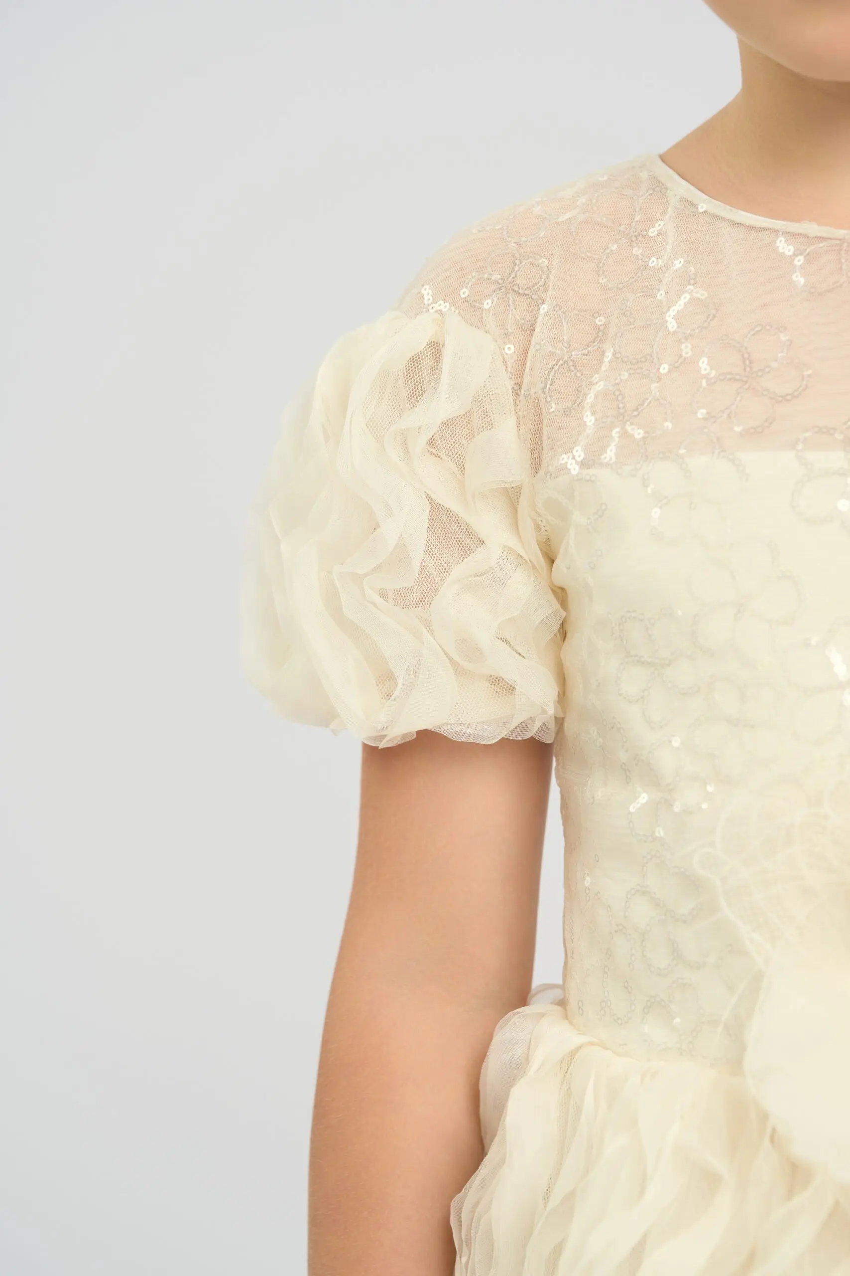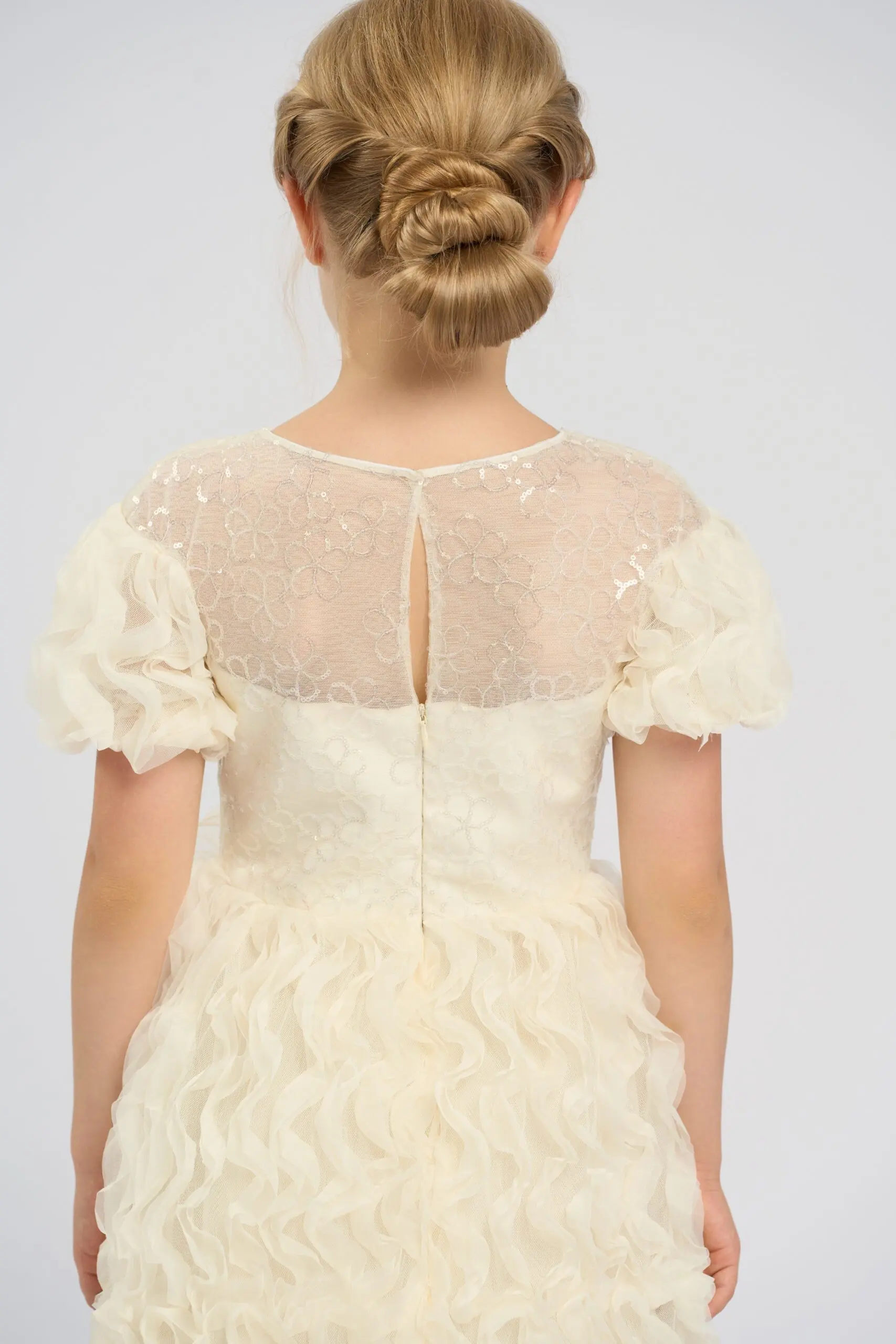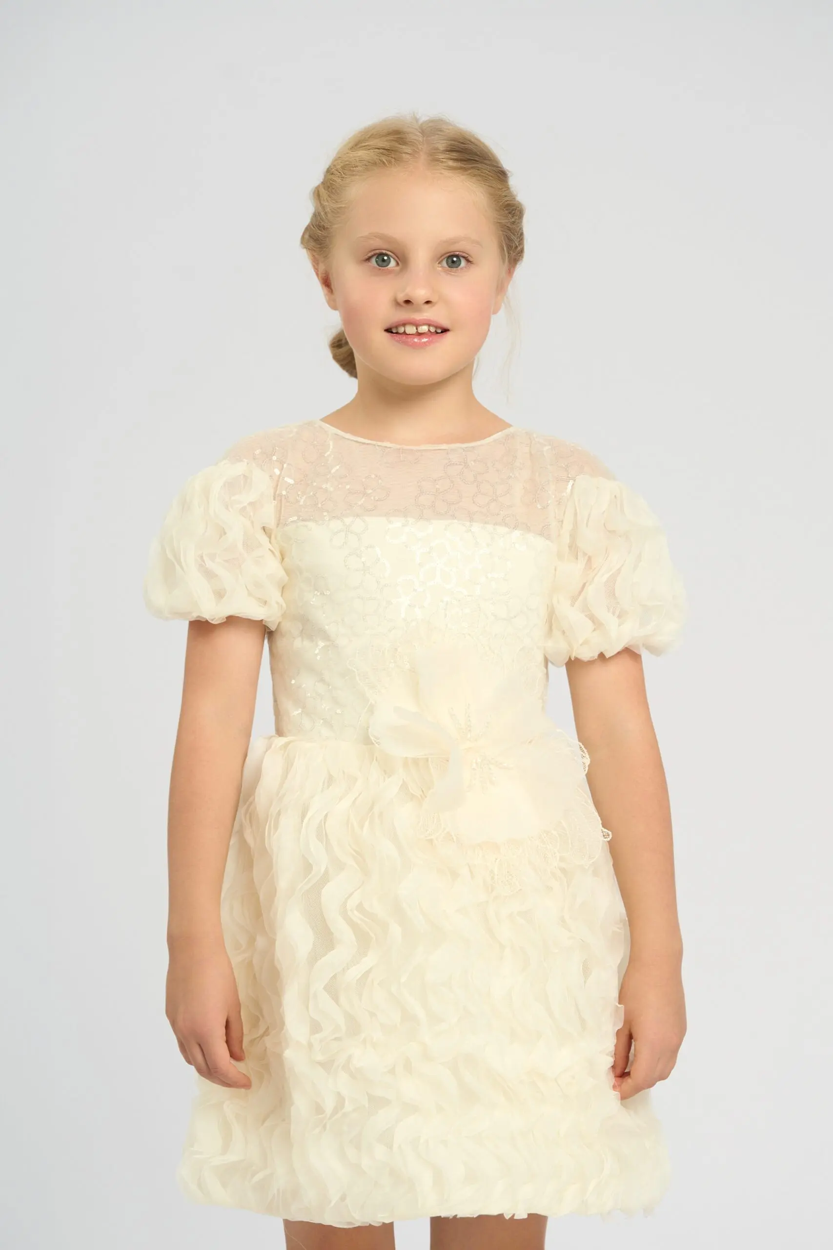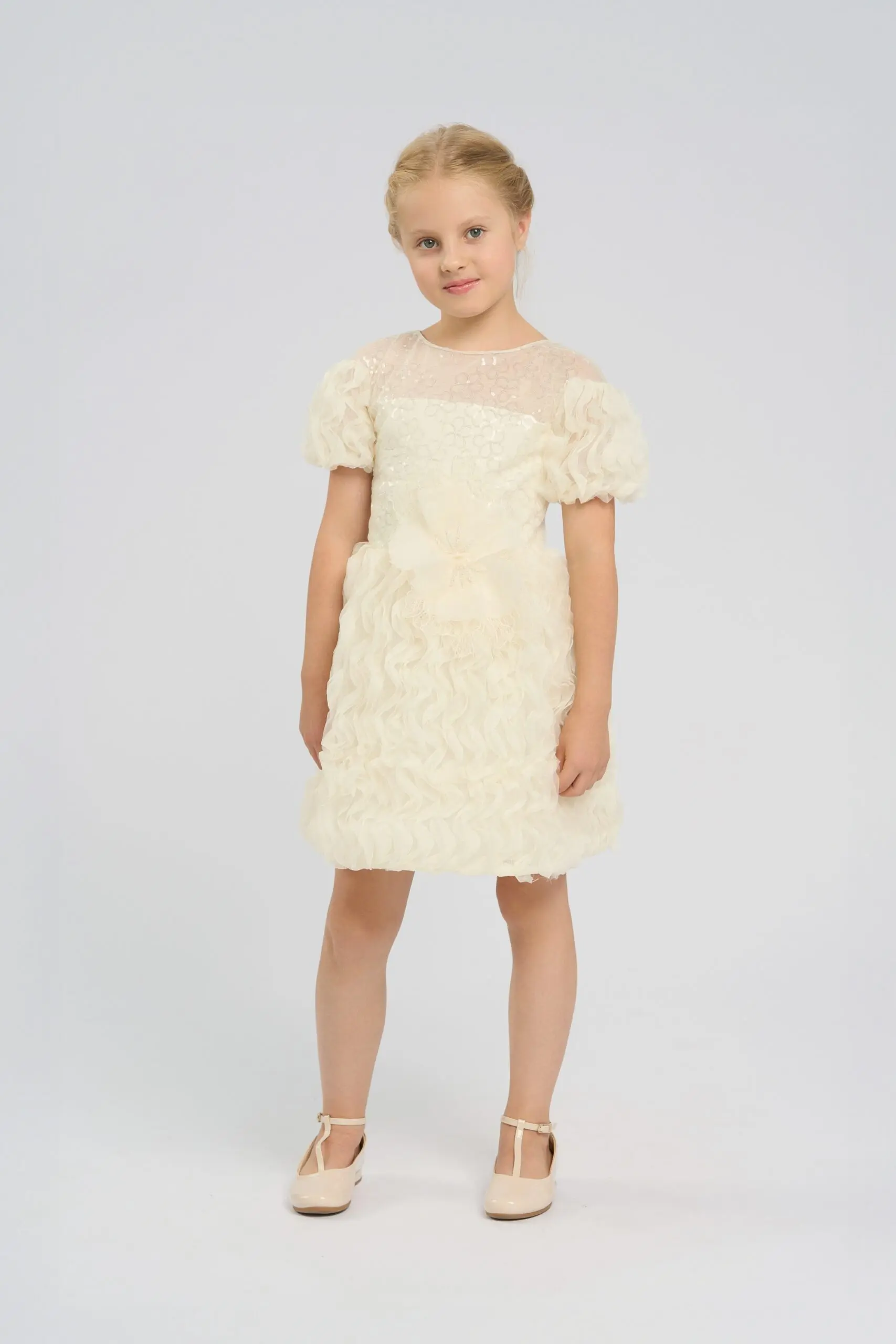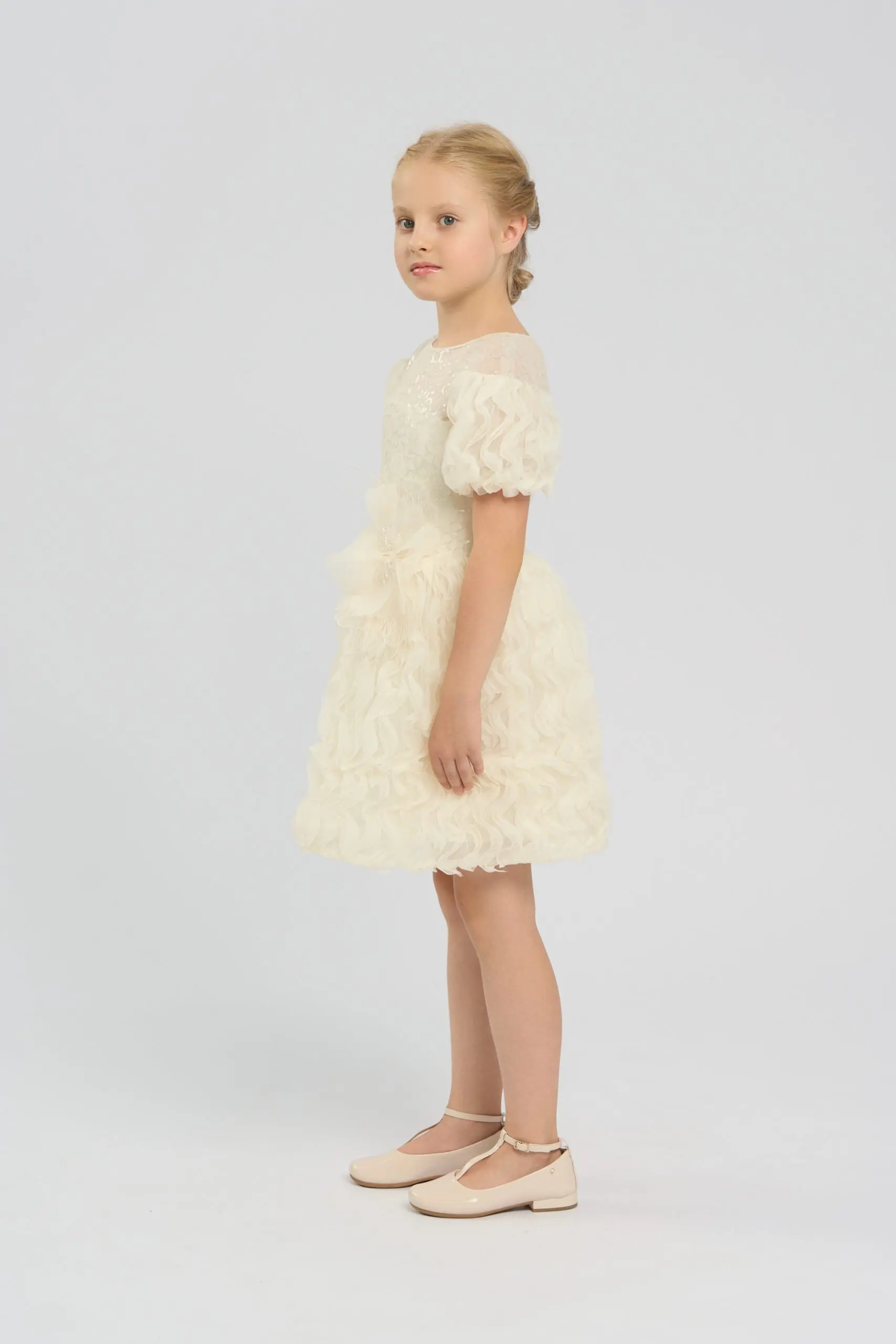 Платье в нежном цвете экрю для девочки — это идеальный выбор для особых случаев. Юбка платья из легкого материала украшена вертикальными волнообразными воланами из фатина, которые ... придают ей объем и динамичность, создавая эффект легкости и воздушности. На талии расположено пышное цветочное украшение, которое акцентирует внимание на силуэте. Короткие объемные рукава придают платью игривость и романтичность, а фактурный лиф с прозрачной вставкой под круглым вырезом добавляет модели элегантности и утонченности. Застежка на молнию сзади обеспечивает удобство и надежную посадку, позволяя легко надевать и снимать платье.