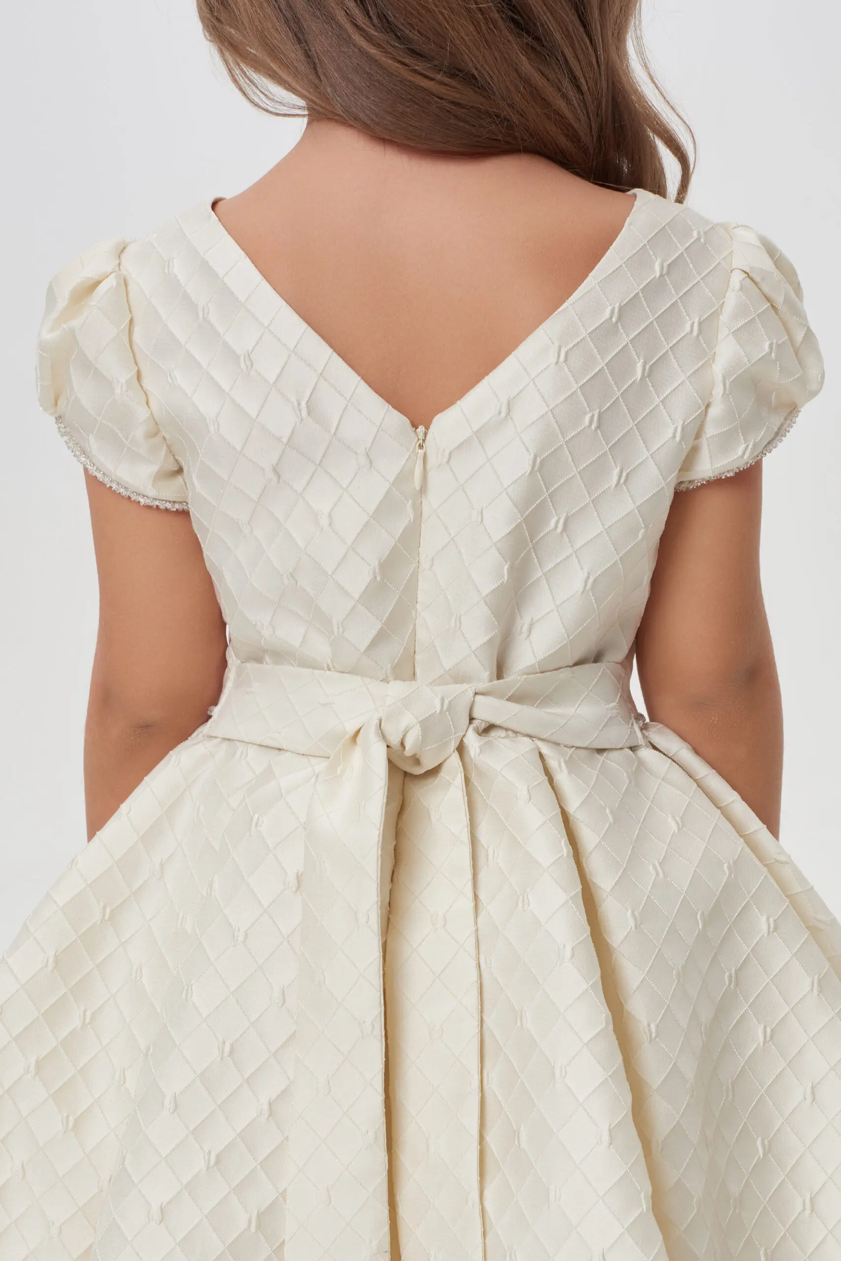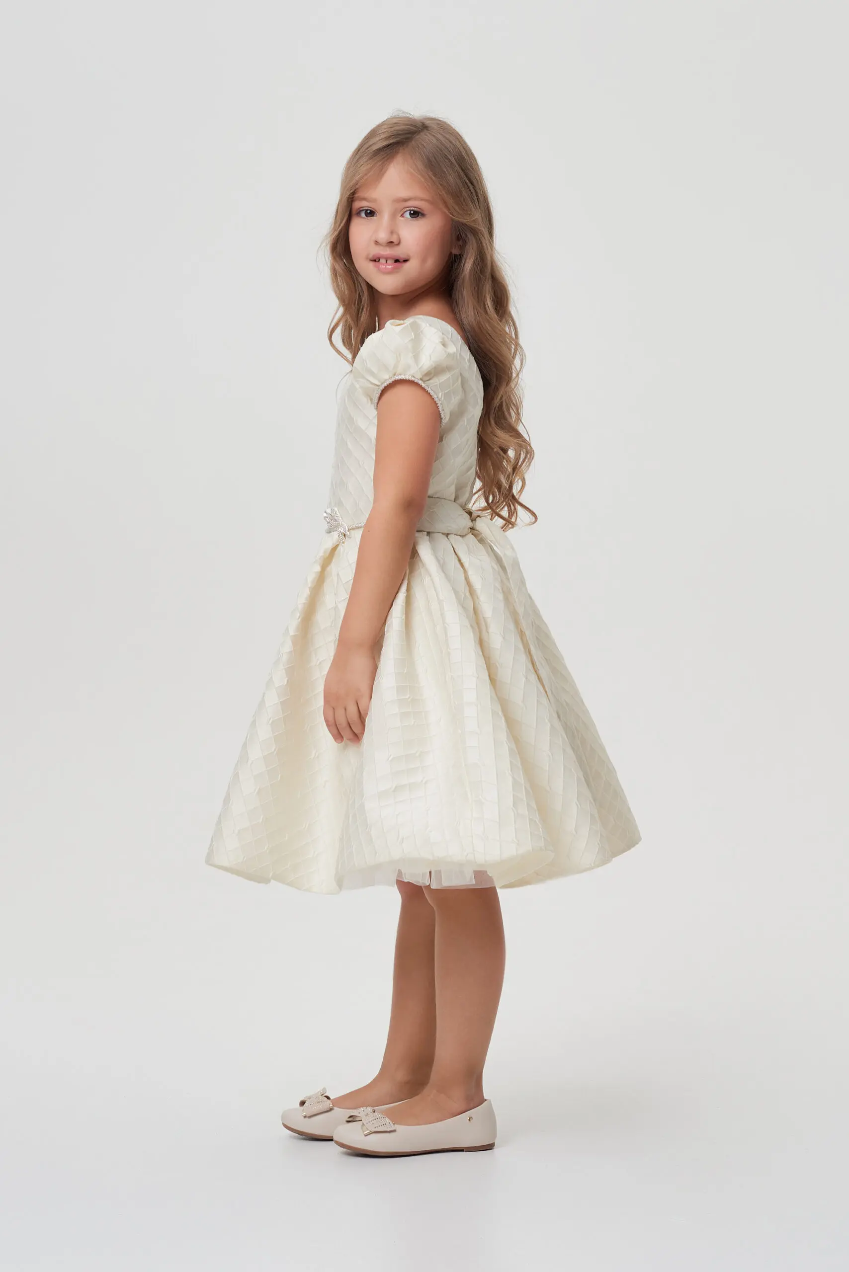 Нарядное платье для девочки выполнено из фактурной ткани модного сливочного оттенка. Модель имеет короткие рукава-фонарики, которые добавляют игривости и нежности образу. Пышная юбка создает эффектный силуэт. ... Подъюбник из фатина придает юбке объем и воздушность. Застежка на молнию сзади обеспечивает удобство и идеальную посадку. На талии расположен пояс с изящным бантом. Платье станет отличным выбором для праздников и торжеств, создаст образ, полный нежности и элегантности.