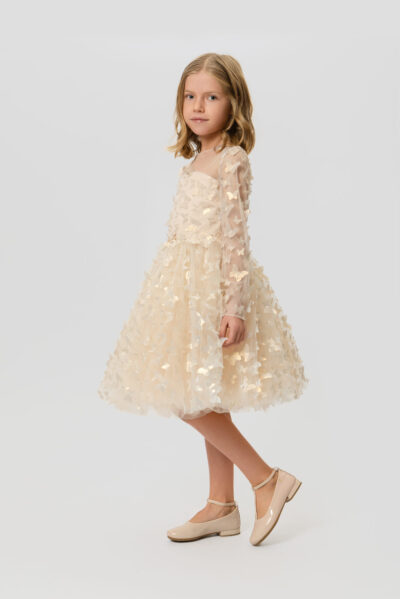 В гардеробе каждой юной леди непременно найдется место для праздничного платья. Эта восхитительная модель привлекает внимание своим неповторимым оформлением и оригинальными элементами. Прозрачные, удлиненные рукава, лиф ... и объемная юбка платья декорированы 3D бабочками с золотистым напылением, добавляющими образу сияние и великолепие. Хлопковая подкладка дарит ощущение мягкости и удобства. Это элегантное платье станет изюминкой любого праздничного события.