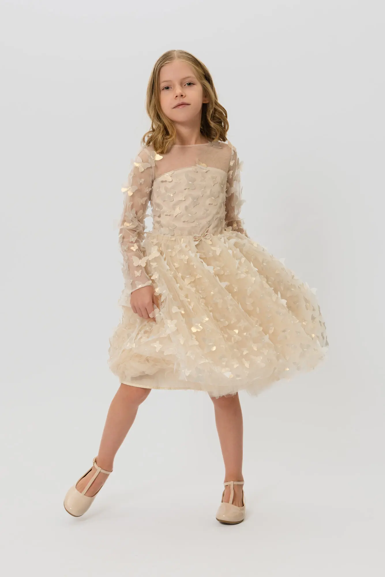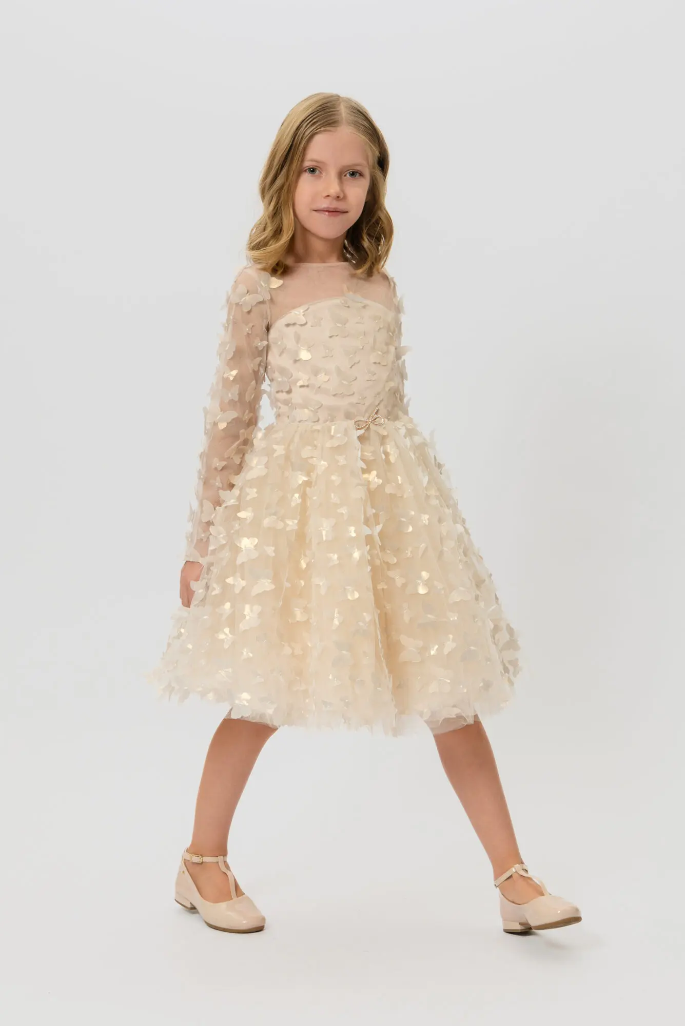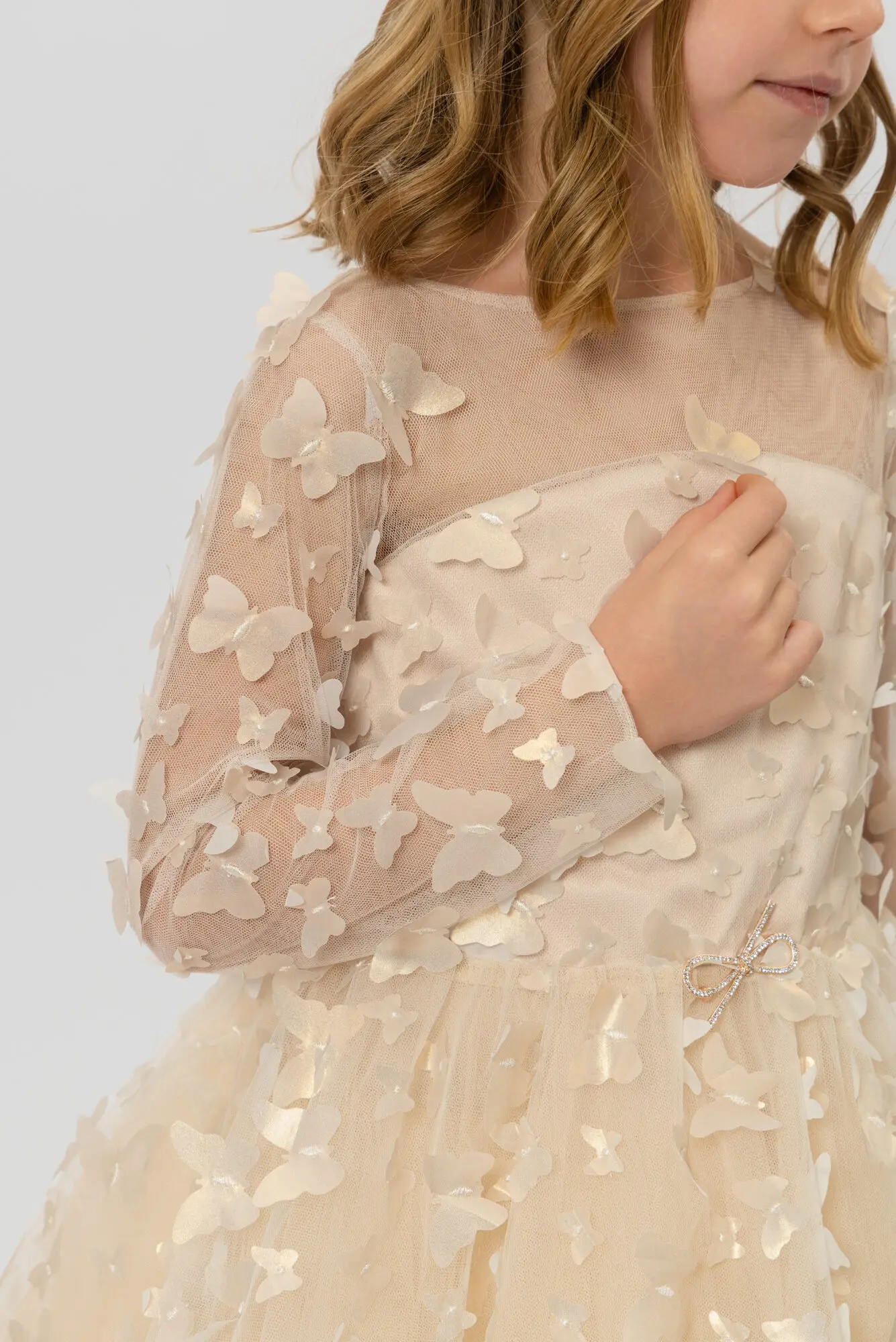 В гардеробе каждой юной леди непременно найдется место для праздничного платья. Эта восхитительная модель привлекает внимание своим неповторимым оформлением и оригинальными элементами. Прозрачные, удлиненные рукава, лиф ... и объемная юбка платья декорированы 3D бабочками с золотистым напылением, добавляющими образу сияние и великолепие. Хлопковая подкладка дарит ощущение мягкости и удобства. Это элегантное платье станет изюминкой любого праздничного события.