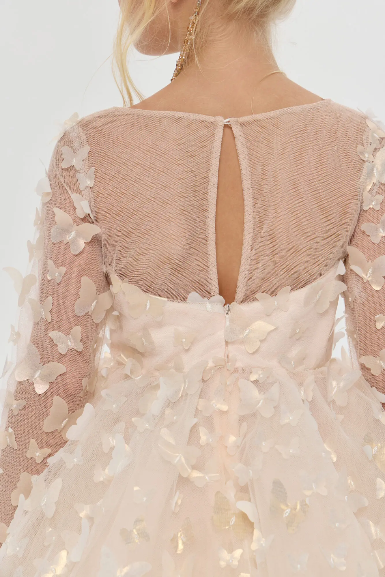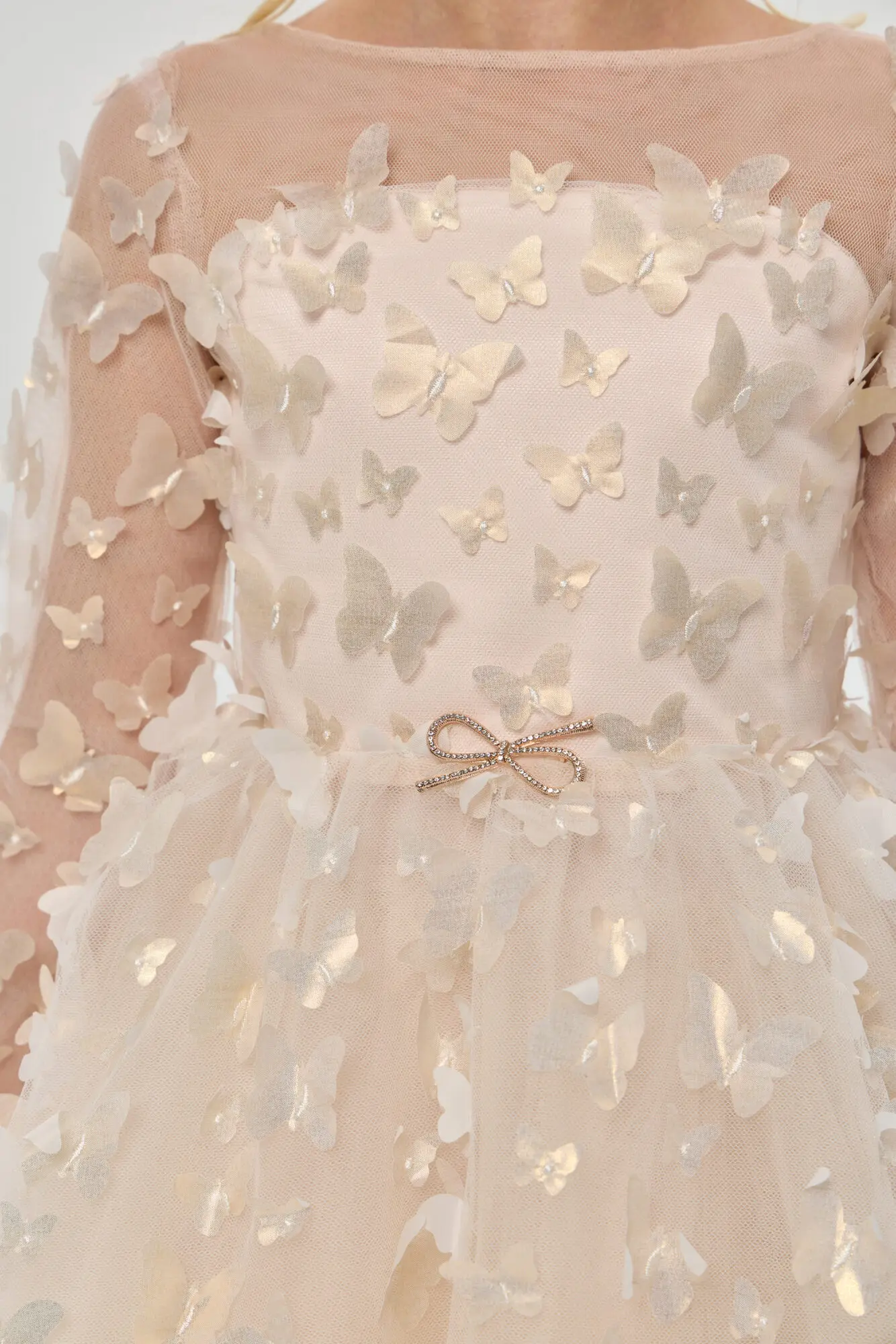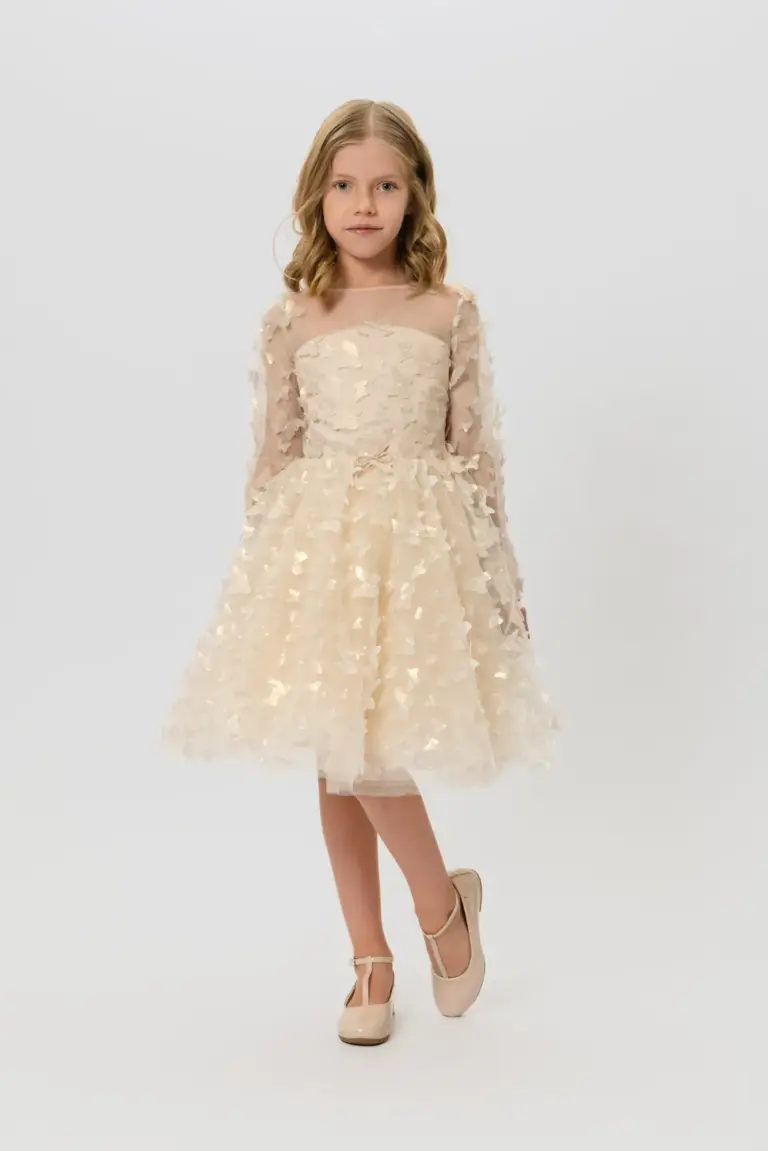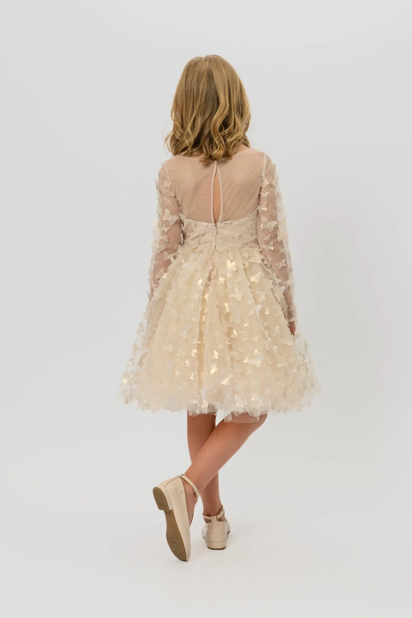В гардеробе каждой юной леди непременно найдется место для праздничного платья. Эта восхитительная модель привлекает внимание своим неповторимым оформлением и оригинальными элементами. Прозрачные, удлиненные рукава, лиф ... и объемная юбка платья декорированы 3D бабочками с золотистым напылением, добавляющими образу сияние и великолепие. Хлопковая подкладка дарит ощущение мягкости и удобства. Это элегантное платье станет изюминкой любого праздничного события.