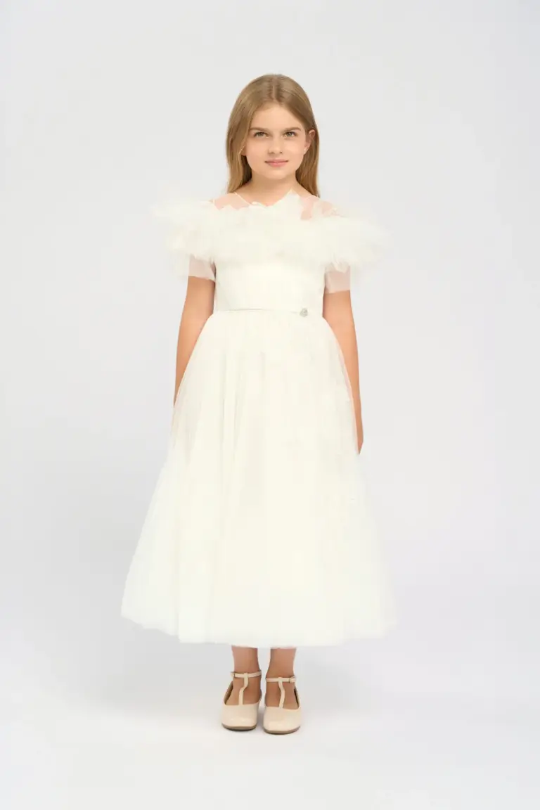 Бесспорный хит новой коллекции нарядных платьев для девочки! Платье в цвете экрю выглядит очень элегантно и нежно. Оно имеет акцентированную талию, что подчеркивает силуэт и придает ... образу утонченность. Пышная юбка из легкого материала создает эффектный объем, позволяя платью струиться при каждом движении. На груди платье украшено пышной отделкой из фатина, которая добавляет наряду романтичности и игривости. Фатин мягко обрамляет верхнюю часть платья, придает девочке вид настоящей принцессы. Дополнительно украшают дизайн фактурные нашивные элементы в виде цветов и бабочек.